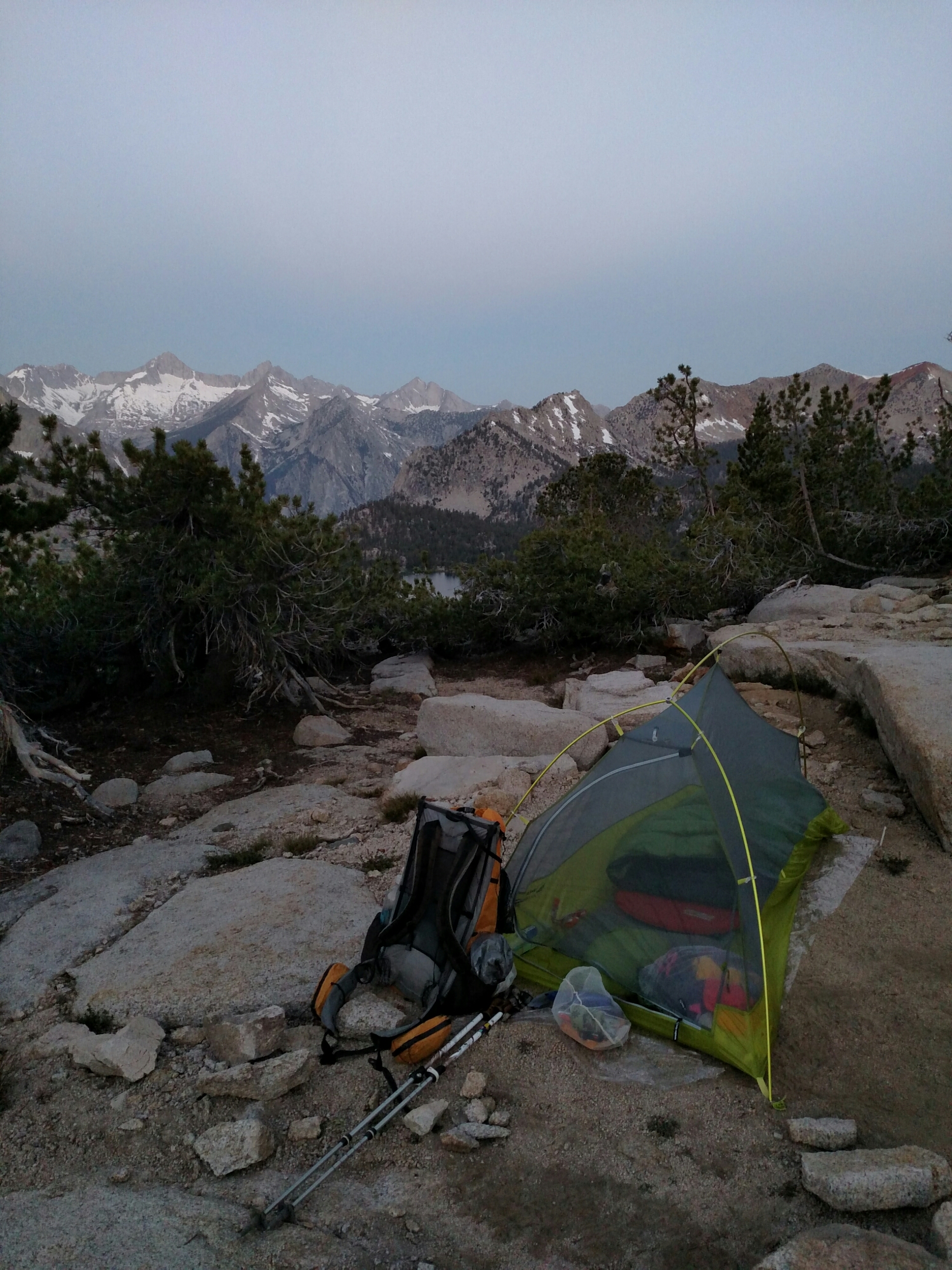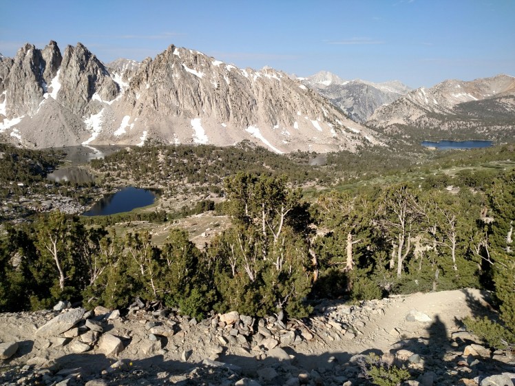 I get all packed up and eat too much for breakfast. That makes the 1 mile, 700 ft. climb a slog. The Kearsarge Pinnacles glissen in the sun and a few mosquitoes follow me up the mountain. Kearsarge Pass provides long views to the west and east and just enough of a breeze to keep the mosquitoes at bay. I sit atop the pass for nearly an hour making use of the cell service and cool weather.