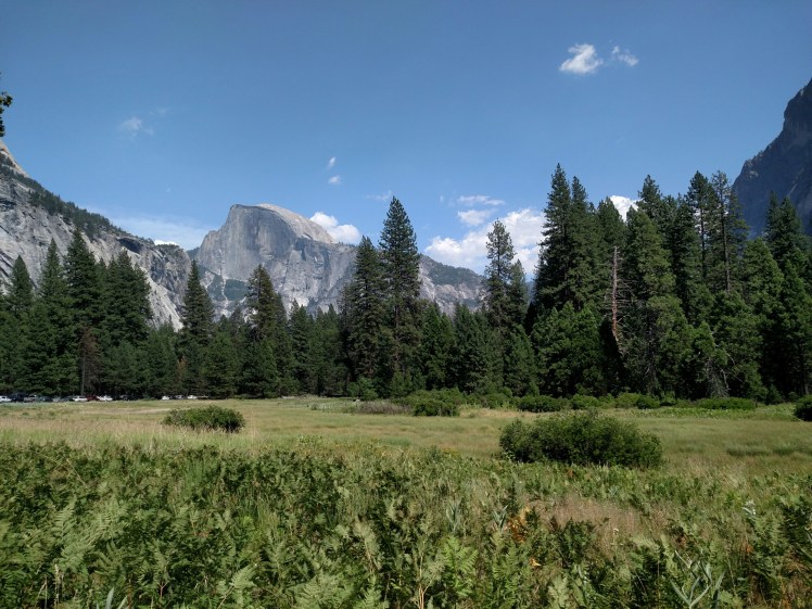 I head out on the free valley shuttle for views of the Lower and Upper Yosemite Falls. The path ways, the falls, and the river are all teeming with people. People working on their selfies and enjoying family moments. After the falls I sardine into the next free shuttle bus. I’ve got my pack on so maneuvering the bus crowds is not easy. After the 50th shove, I get off and wait for a bus to come in the opposite direction. Finally, we’re on our way back to the visitor center/store and the bus breaks down. We all pour off and I walk to the well stocked grocery store where I purchase a Sherman IPA to go with my trusty tortilla and rice lunch. I listen to the numerous languages around me and watch the cheeky ground squirrel look for crumbs. The valley heat has sapped my energy but I head out and finally have a quiet meadow moment.