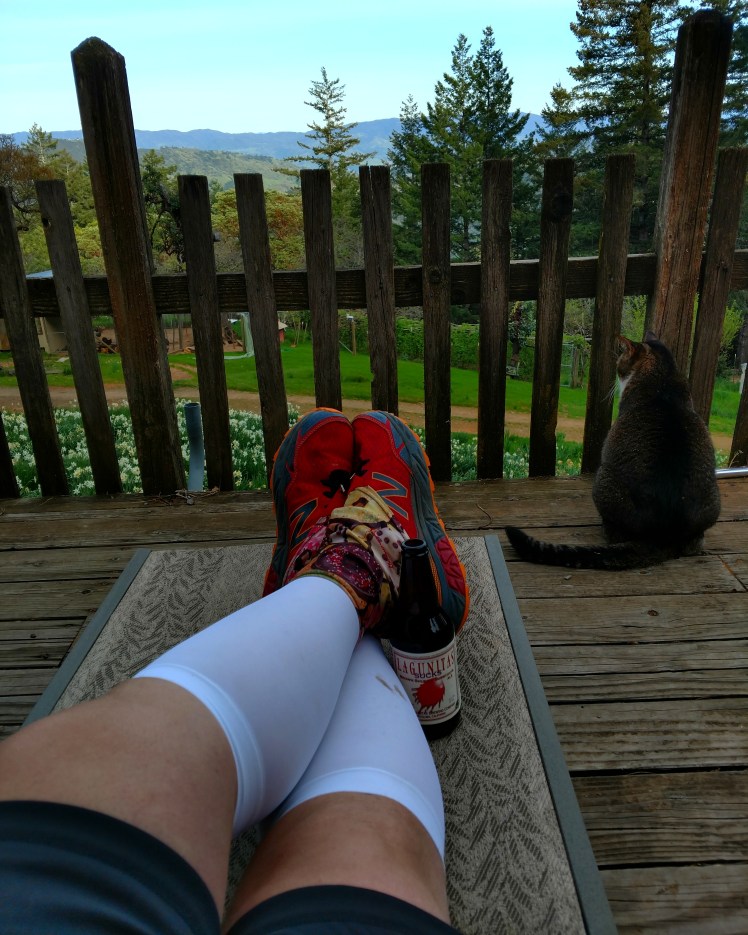 I sit down on the front deck recliner and it’s just so nice out. I just want to keep sitting here, so I do. What would make this view even better? How about a Lagunitas Sucks beer? Check. And then reality clicks in and I crush 1.8 miles as darkness falls.
