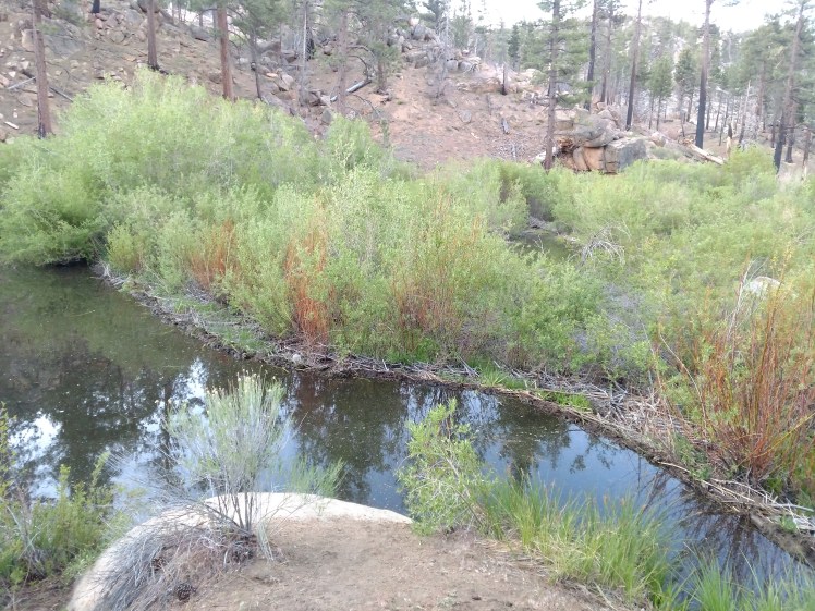 I wouldn’t say it was a particularly restful night but somehow I feel rested. Mostly I tossed and turned and watched all the planes headed for LAX. The sky is warming with today’s light and I feel like I’m getting a late start. My rustling wakes up Lil’ Buddha and he tells me that it’s 519am. Ooopps. I’m on trail by 540am but stop almost immediately as I see some large wake in the beaver dam zone. I stand very still and watch a large beaver climb up onto its dam and drag a willow branch out of sight. I slowly walk down near the water and watch a couple mallard ducks. After a while, what I thought was a rock starts to move and I watch as a beaver chomps on something in the water. A bunch of other ducks come floating in and the beaver starts to swim away. Before heading under water, it slaps its tale against the water. Watch the video here. I’ve never seen beavers before so this is all pretty fascinating to me. A few jack rabbit sightings round out the morning nature show.