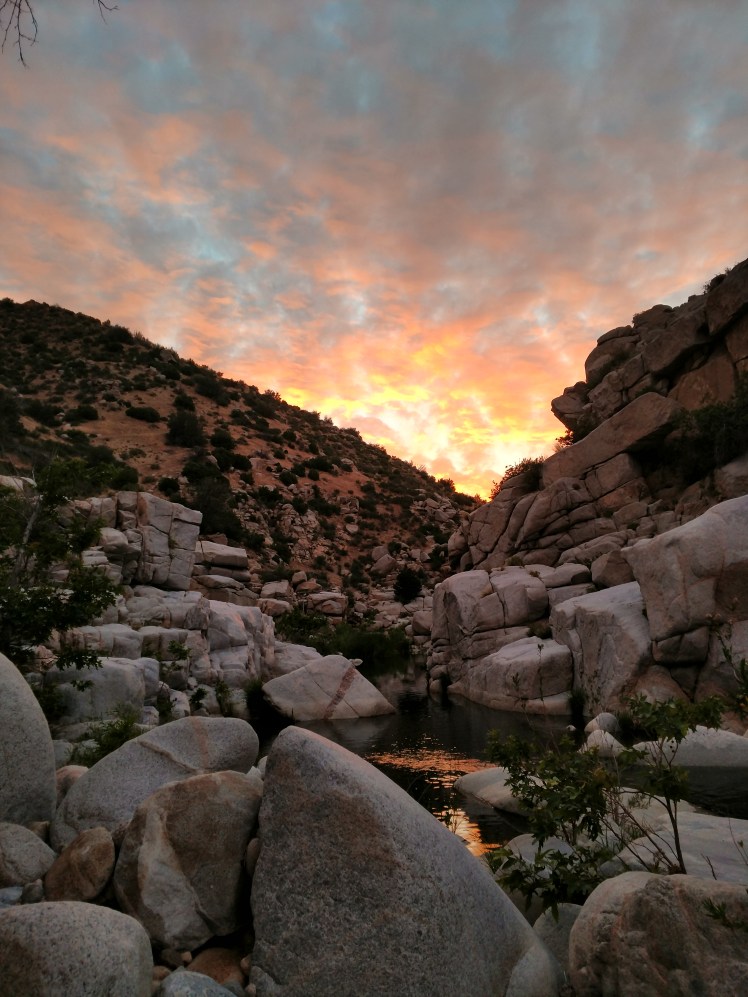 Lunch is a two hour leisure on the banks of Deep Creek. I even wade in, wash my legs and dump cold water over my head. The last 8.5 miles are a slog as the afternoon heat bakes. I go all afternoon with my umbrella up so I’m not suffering from the heat as much as Lil’ Buddha. An egret swoops by and knocks me out of my trail trance. We push to the “secret” Deep Creek hotsprings and luckily no one is there. We cool off in the stream and then soak in a warm pool. Usually I’m not fond of getting in the water but I have to admit that the evening plunge makes a hard day worth it. The sky goes pink and reflects off the water as we finally eat some dinner.