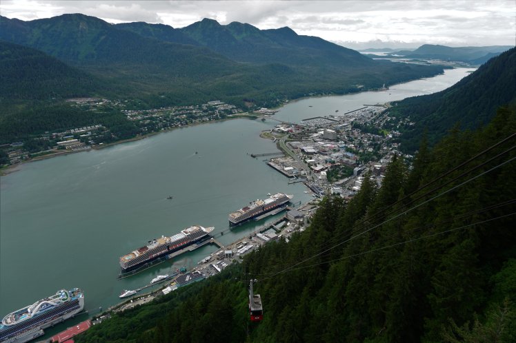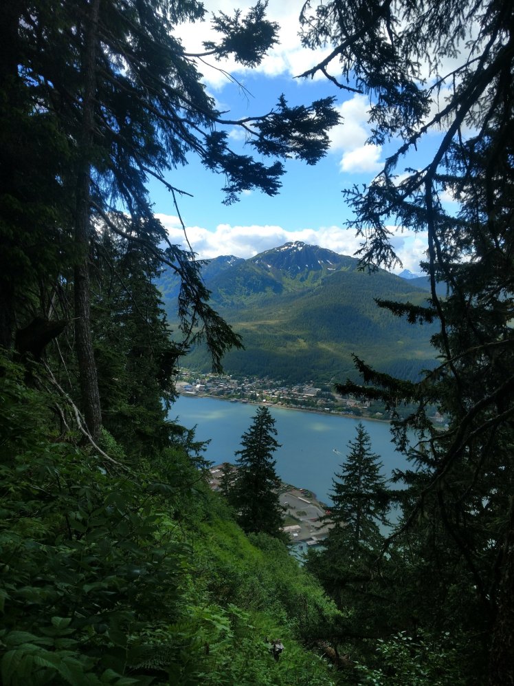 Snow-capped mountain tops start to pop through the clouds as we begin our descent. The views are breathtaking and I feel like a kid in the candy store. We fly directly over Juneau on our approach. I take a taxi to the hotel and am able to check in early. I regroup my gear and head out to climb up to the top of the Mt. Roberts Tramway. I weave through the streets of Juneau passing the state capitol and brightly colored houses set against green hills. I climb 1,800 ft in nearly 3 miles through hemlock rain forest full of roots and rocks. Raven chatter follows me up the mountain and I’m nearly to the tramway before getting a window view down into the bay.
