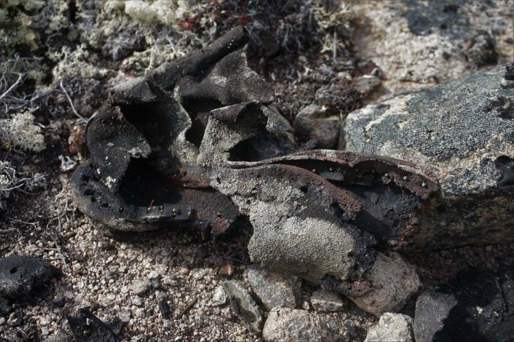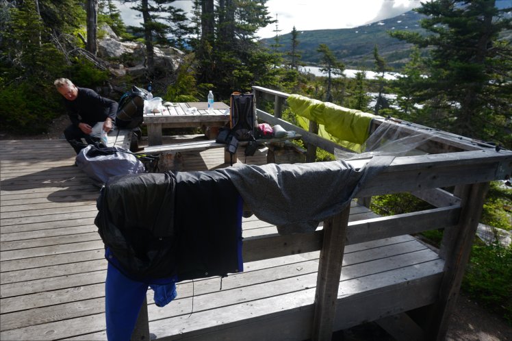 We drop into Deep Lake and take a gloriously sunny and warm break at the camping area. I throw out my tent and ground cloth to dry and eat a snack. Ahh, the sun feels so good. A hawk circles overhead as we reluctantly head back out. The trail is lined with thick brush so I call “hey bear, hey bear” just in case. There’s lots of discarded stampeder gear at the top of the rapids. Axe heads, a boat frame and now lichen-covered shoes. The rapids could not be run so stampeders had to unload from the boats they used to cross Long Lake. And down, down, down we drop into Lindeman Lake around midday. We maneuver our tents in between the large piles of moose droppings just as a big gust of wind pulls through. Phil’s tent starts to fly away cross country towards Lindeman Lake. But he’s fast and catches it in no time.
