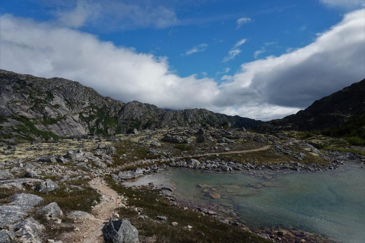 It’s such a short day that there’s no pressure or rush to get going early. If only my mind could convince my body of this. Plus it’s light so so early that it’s got my internal clock all fucked up. We’re up early as usual and drag out our morning routine as long as possible. If it was raining I think we’d be more inclined to hunker down in our tents but it’s mostly sunny with big billowy clouds hanging low. Phil and I leave camp about 8am, gradually descending along the side of Long Lake. Phil stops, maybe to take off his rain jacket and I pass him. The trail curves slightly to the right around a fold in the hillside and I can no longer see Phil. I cross a series of streamlets and right in the middle of the last jump I start to cough heavily. Boy, that was random and weird.