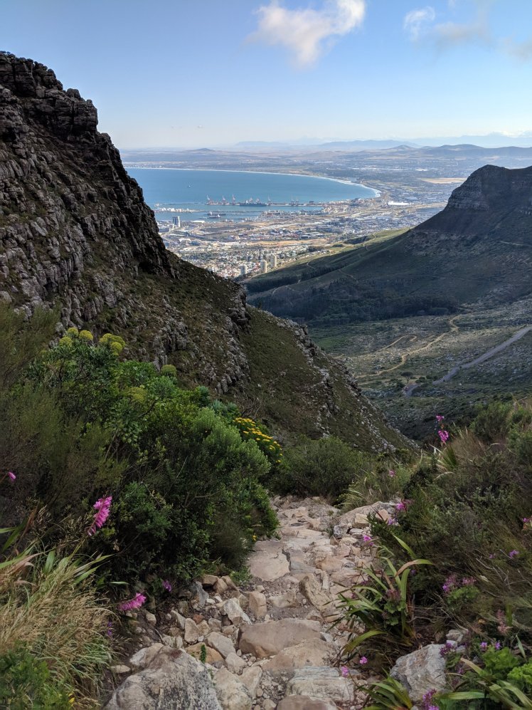 Once atop the Table, we have relatively flat trail to Maclear’s Beacon. Where it is most certainly not clear and we take the selfie regardless. Cherub brings South African snacks and they are indeed a sweet treat. Maclear’s Beacon is the high point on Table Mountain at 1085m or 3559 ft. And then it’s down and more down. And when my leg muscles scream no more, there’s more down. The descent into Kirstenbosch Botanical Garden goes in stages. First the rock steps, then the ladders and then more rock steps.