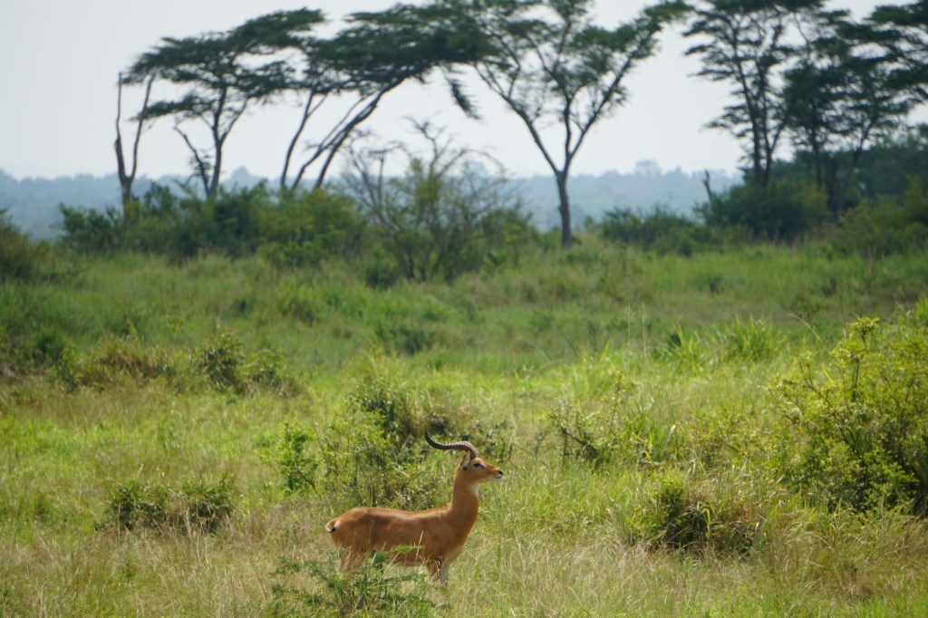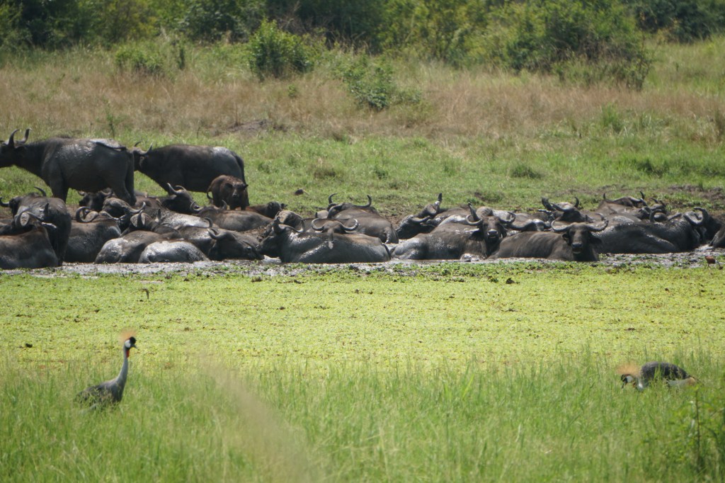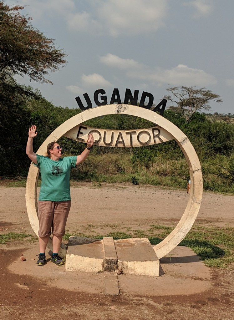 We drop down into and drive through the hot Queen Elizabeth National Park where we stop for a brief lunch at a lodge. Along the way, we stop for a quick picture at the equator!