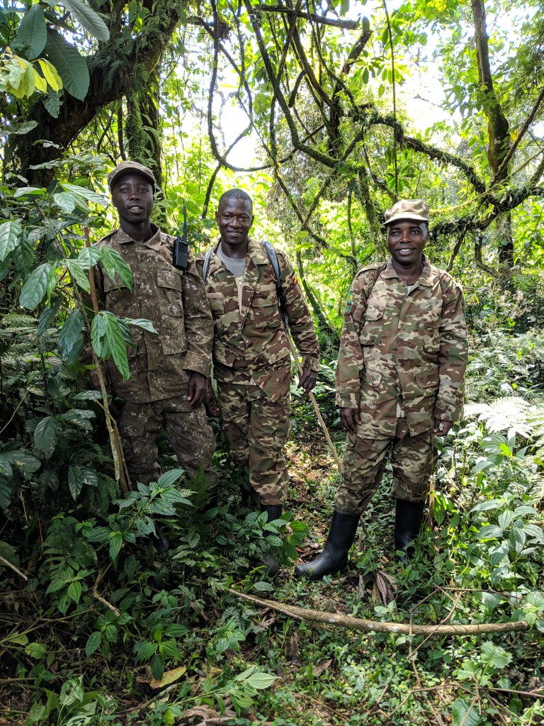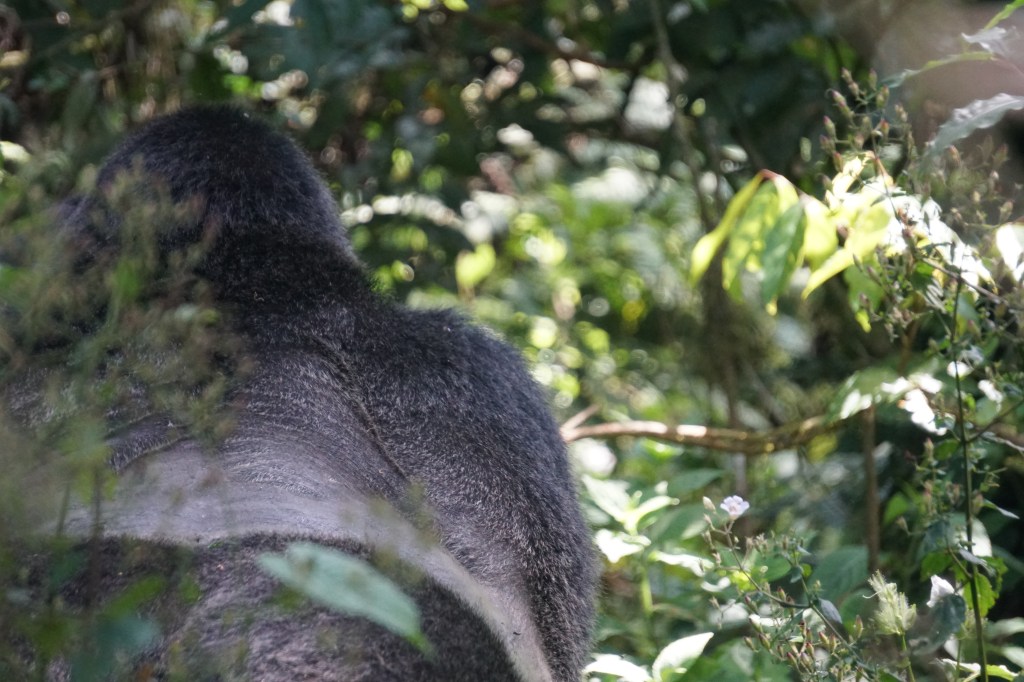 We switchback up the mountain until there is only straight up to a low pass along the ridgeline. It’s not long and we’re headed cross country through the indeed impenetrable forest. Our guide hacks his way through and we eventually reach the gorilla scouts that have been out since 7am to find the Mubare family. The scouts make it possible for us to go straight to the gorillas instead of us searching all day. The porters take our poles and then we trip through the forest. I can hear thumping on a chest and then there he is. I wade into a swamp at which point I’m very grateful for my waterproof boots and gators. I get a few good pictures before the silverback male is on the move.