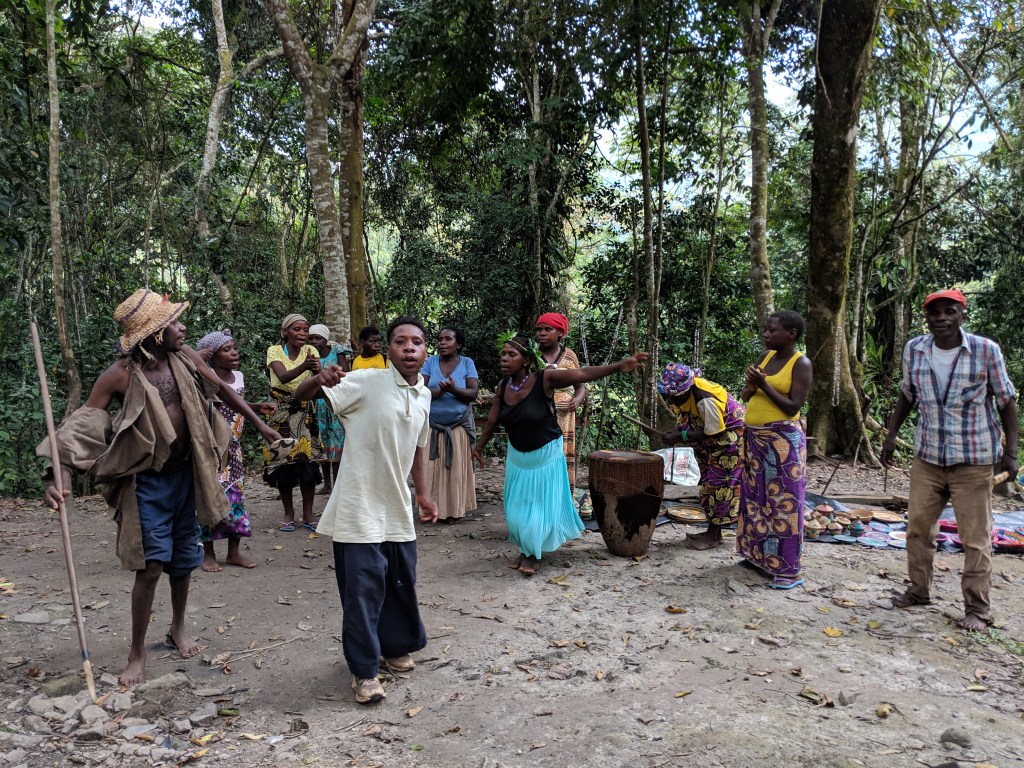 I meet up with Nassar and he asks me if I’m still interested in the community walk. Well hell, why not?! Back at the lodge I suck down two OJ’s & sparkling water and trade out my boots for my Leadville walking shoes. I meet a pygmy tribe, see banana processing into juice, beer and gin, learn from the local medicine man and then trek up to the local school. Even though the school kids are on holiday right now they play music, sing and recite poetry for me.