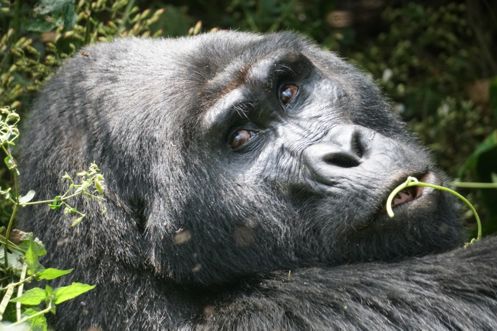 We backtrack and break trail through the forest again. The male leads us to several females and a baby who is eating high in the shrubs above us. The flies are intense but somehow they are easily ignored. We get very close to the mountain gorillas but be careful not to make eye contact. These groups of mountain gorillas are habituated with people and are content to let us be near them. The gorillas spend their time eating and go about their business seemingly without noticing us.