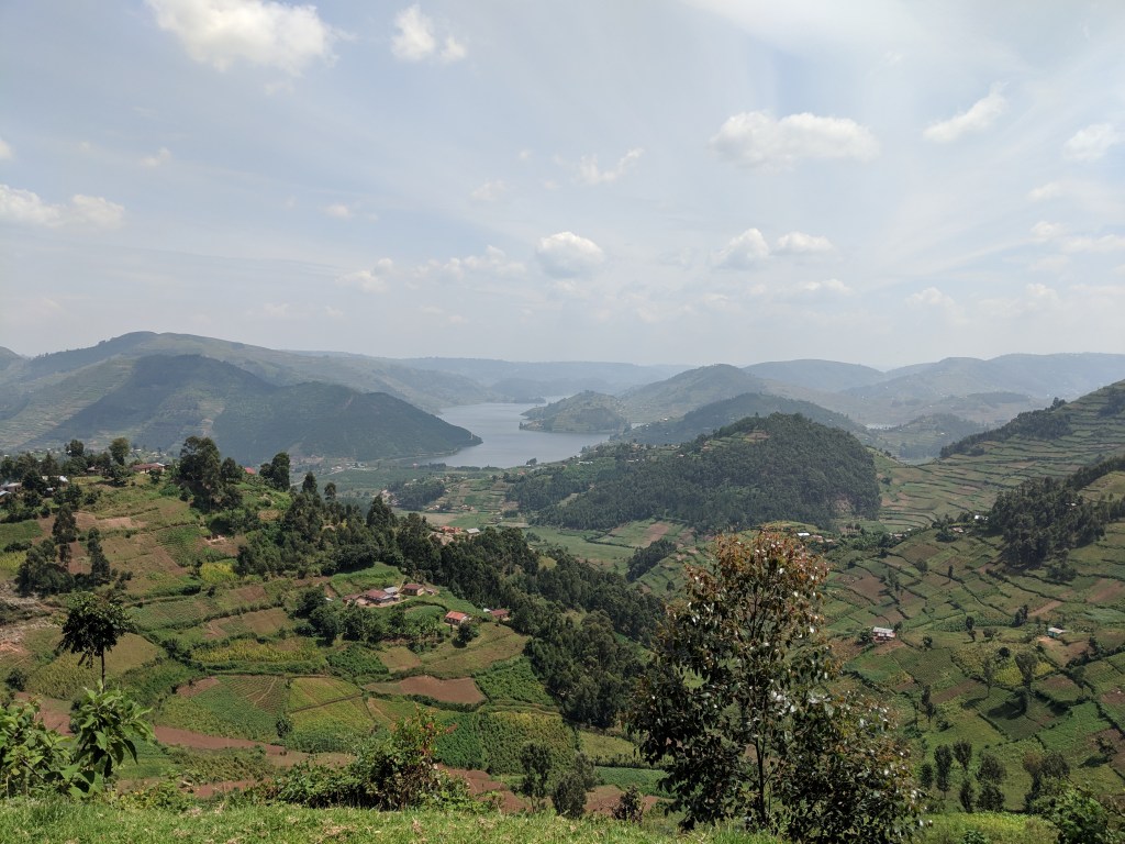 I get up super early and have to pack up all my stuff which is still in Room 1. I have a nice breakfast before Nassar and I hit the road. We drive through Bwindi and through lots of communities until we eventually hit paved road. We stop along the side of the road where we eat out Gorilla Forest Camp box lunch. No farming space is wasted where the terraced hillsides reach to the sky.