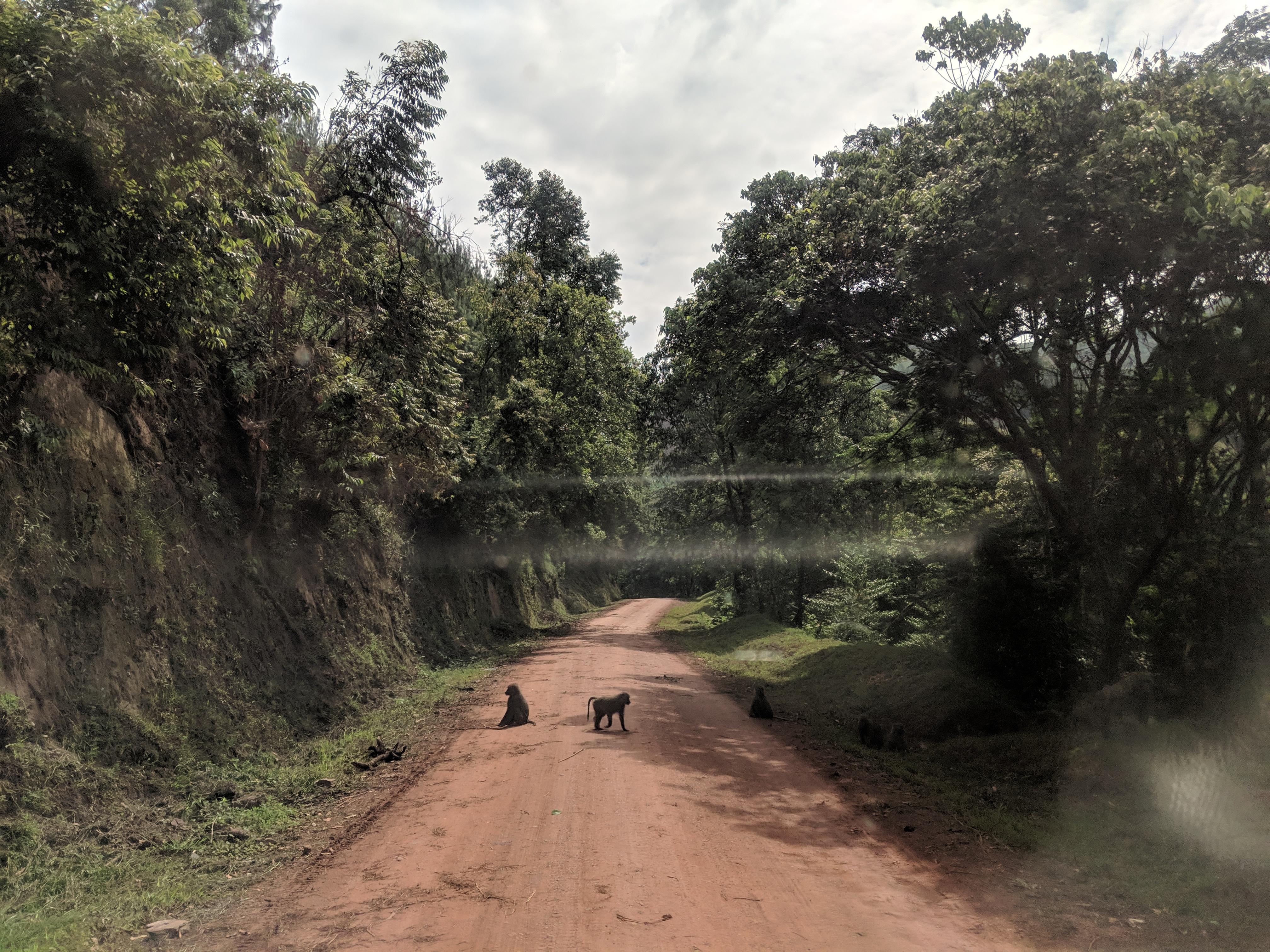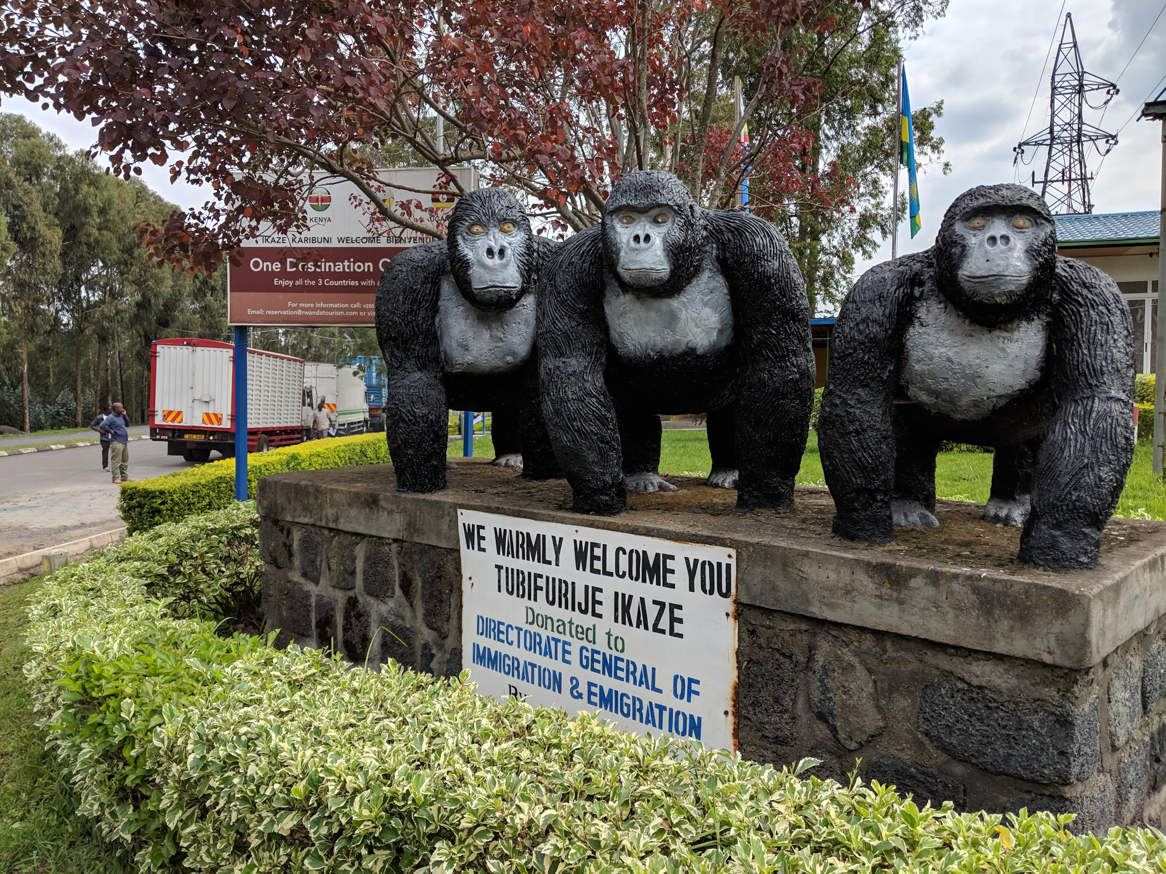We get to the Rwandan border and first we have to go into the Ugandan police office. Nassar has to register his car/insurance for Rwanda. Then I go to the Rwandan side where they check my eyes for Ebola. Nassar drives through and my bags are brought out to a check point. I have to take nearly everything out of each bag. Eish! They seem a bit confused about my bag of winter gear. I’ve been carrying this bag the whole way just for Mt. Kilimanjaro. Next stop is the immigration window. We’re sent to a second window and I swear that the guy takes a personal call while I wait for him to help me. He sends me back to window where I started. Finally, at the end of all this I have my East African tourist visa and my exit stamp from Uganda. Nassar takes a bit longer and then we have to drive just down the road to the Rwandan police. What a process! Once all the boxes have been checked by every possible agency, we’re headed down the road again. In Rwanda, everyone drives to the right so I finally feel like traffic is headed in the correct direction. The speed limits are slower….maybe because it seems that kids like to play on/in the roads and will run out in front of you at any moment. Kids have tires that they are rolling with sticks. And obvious difference here is that the homes are built with large volcanic boulders. Basalt! There seems to be a bit more order to the things too.
