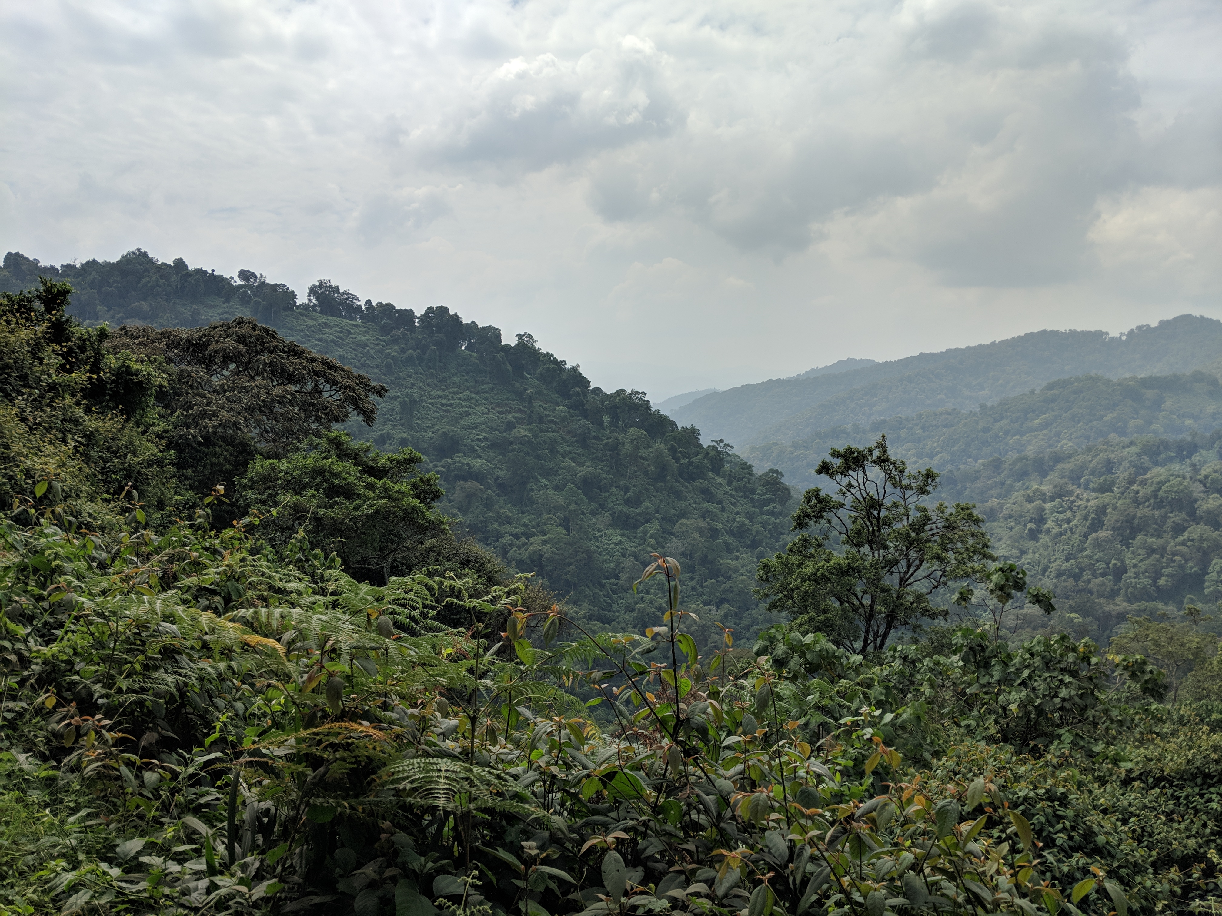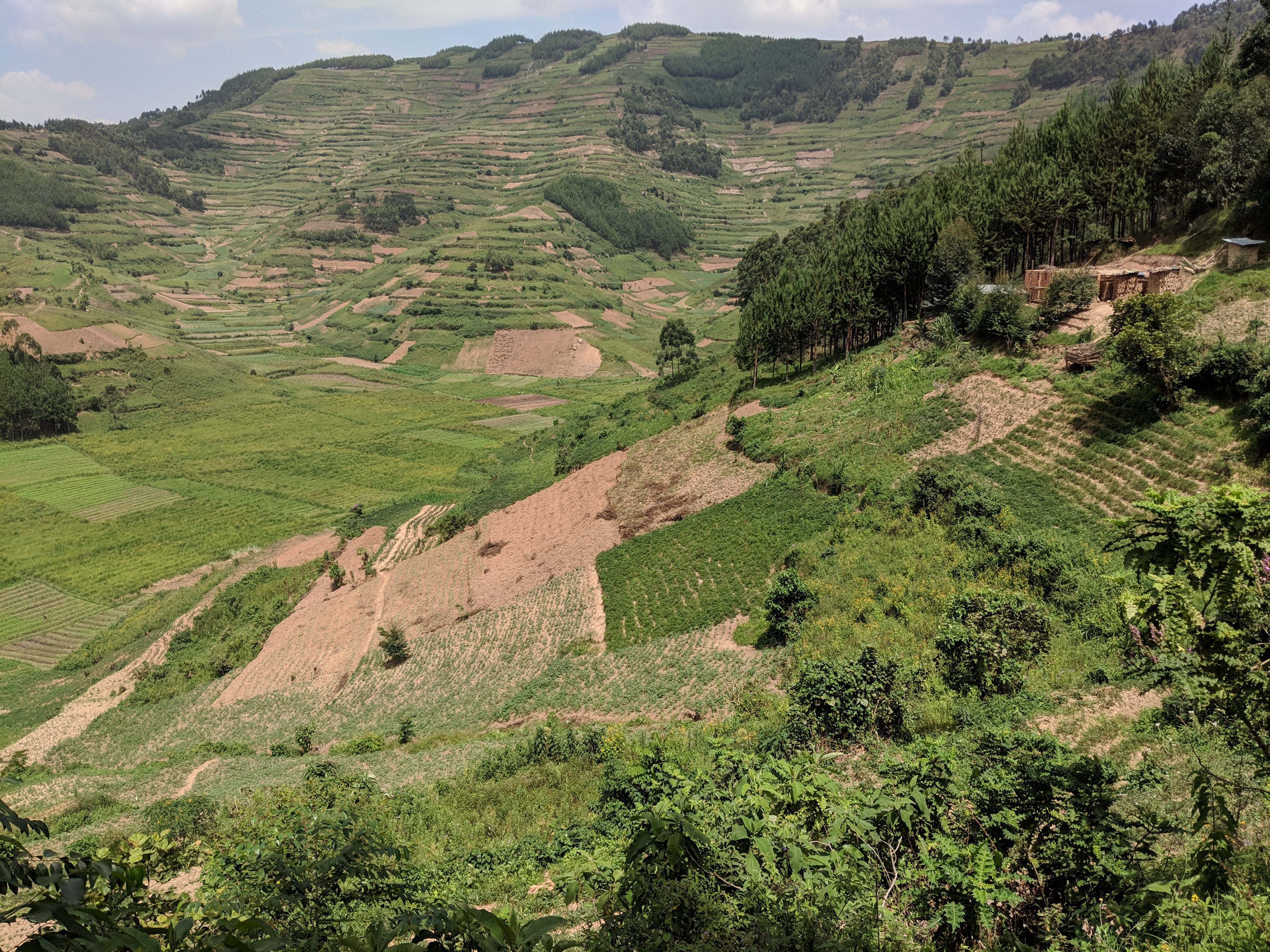 I get up super early and have to pack up all my stuff which is still in Room 1. I have a nice breakfast before Nassar and I hit the road. We drive through Bwindi and through lots of communities until we eventually hit paved road. We stop along the side of the road where we eat out Gorilla Forest Camp box lunch. No farming space is wasted where the terraced hillsides reach to the sky.