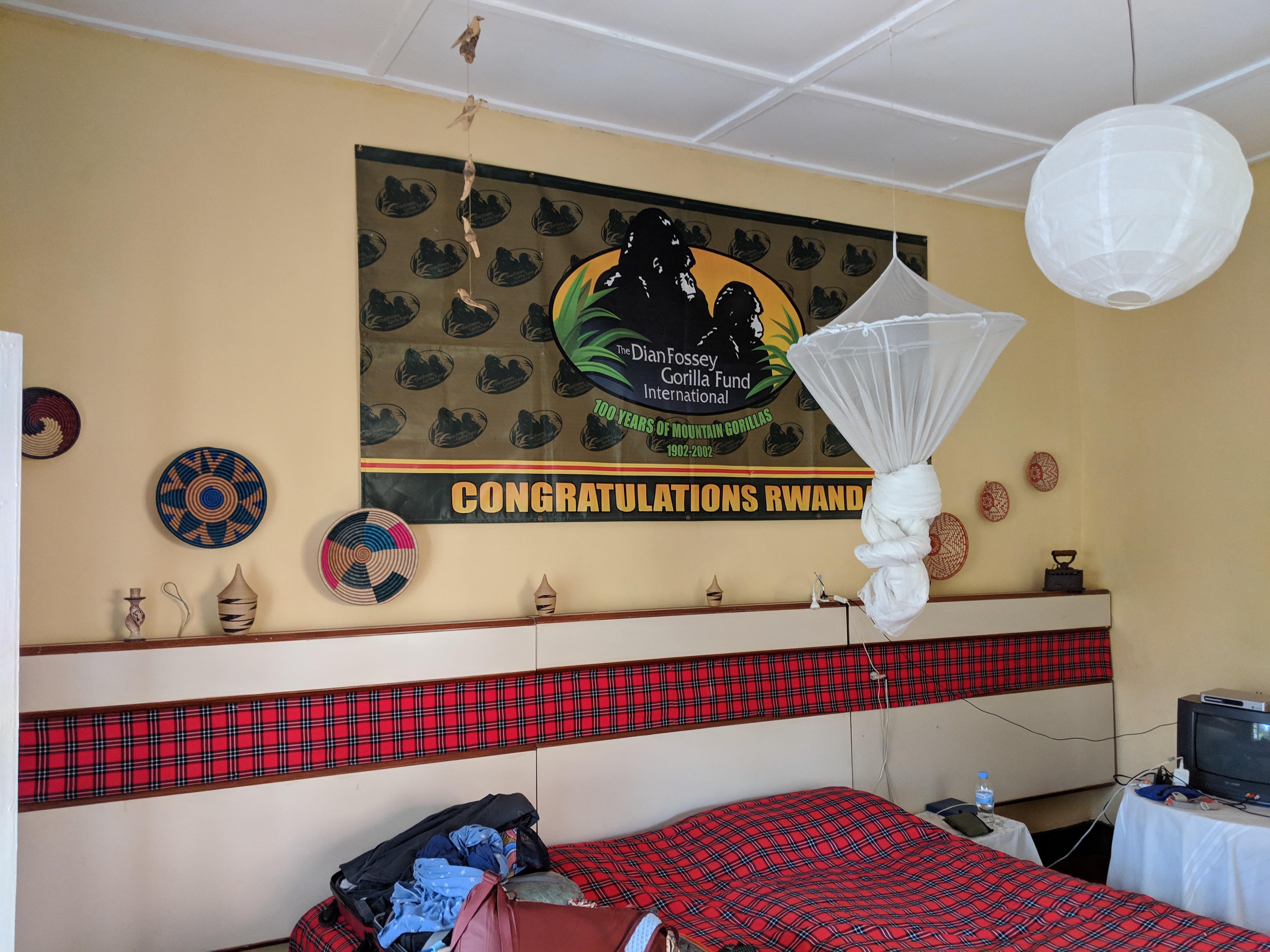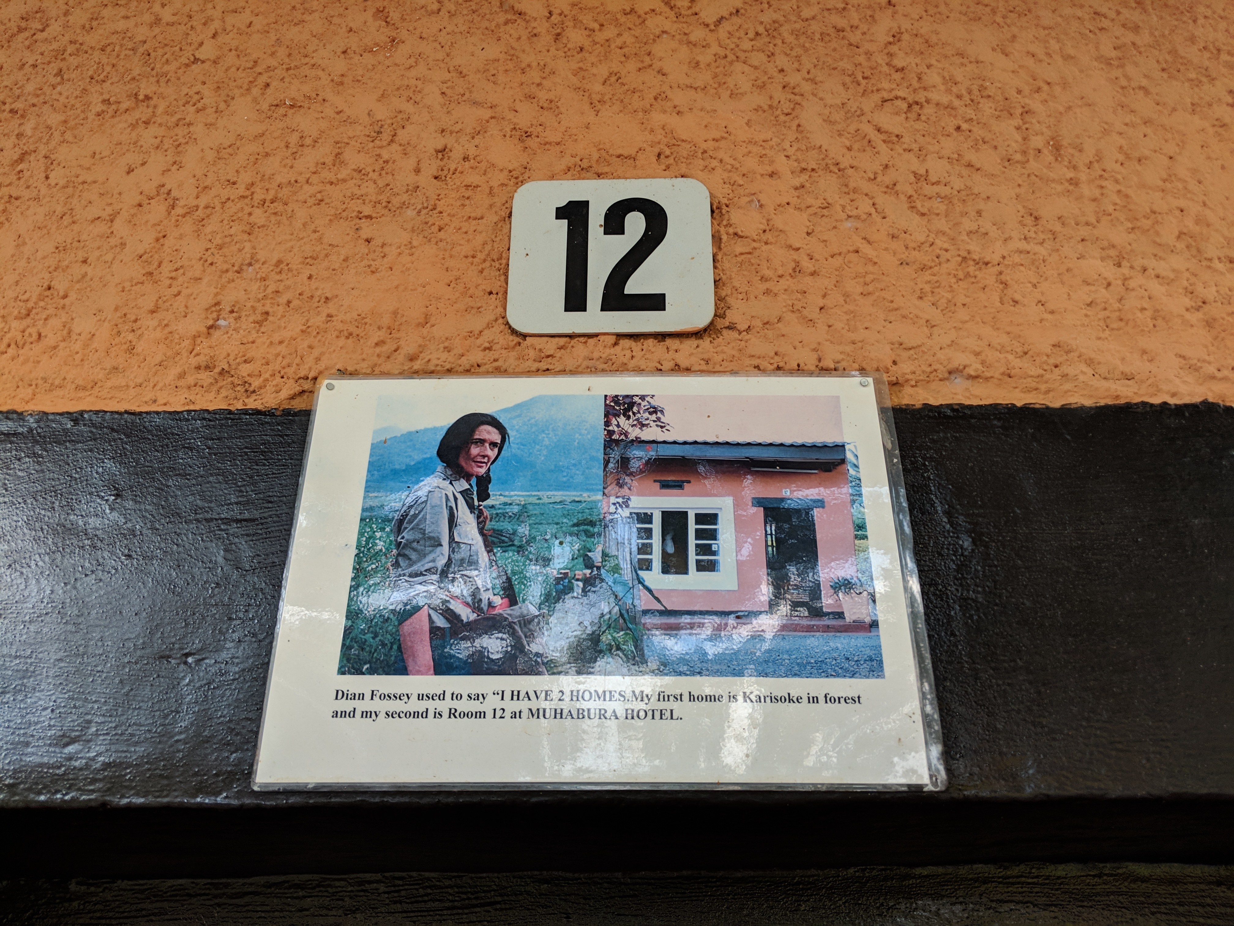 We get to Hotel Muhabura where I’m staying in Room 12. This is the room where Dian Fossey stayed when she came to town. They’ve tried to keep the room just as it was when she stayed there. There even seems to be a hint of smoke smell still. I relax a bit and then it’s time for dinner. When we crossed into Rwanda the time changed and we got an extra hour. I’m tired and head to bed early.