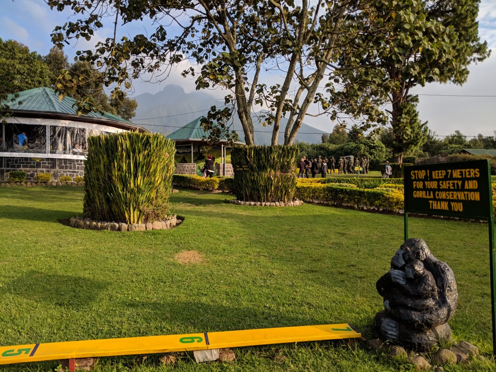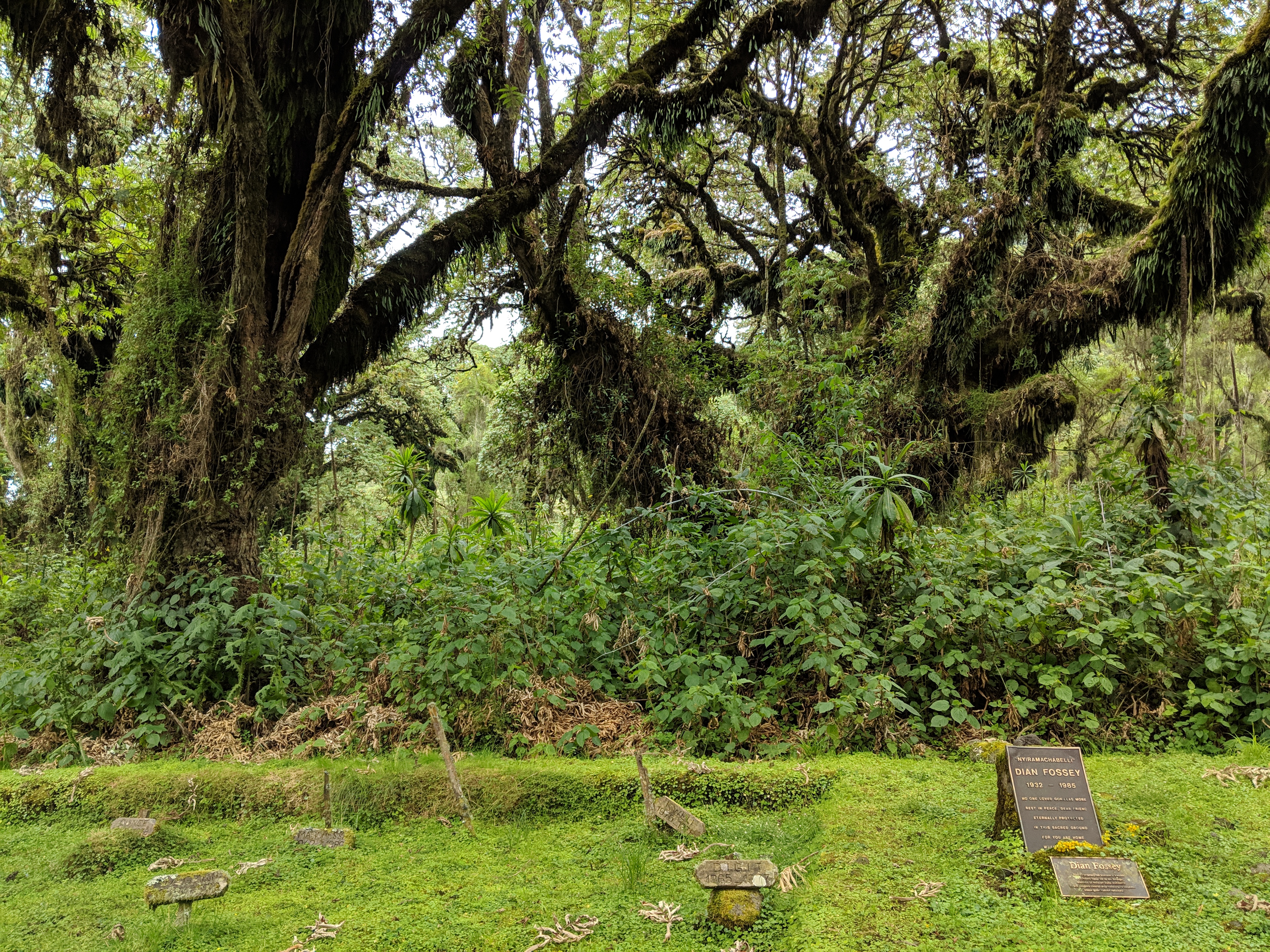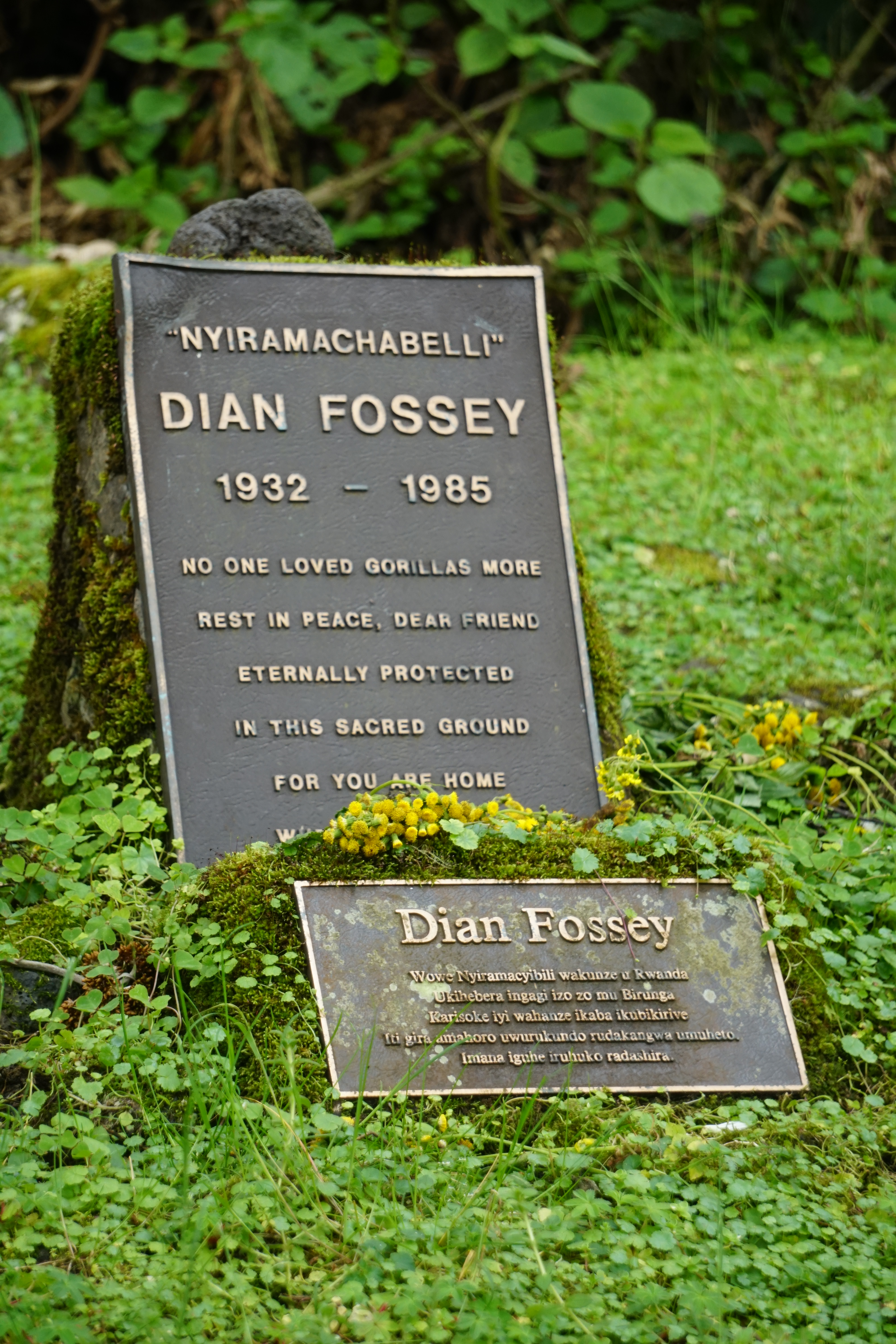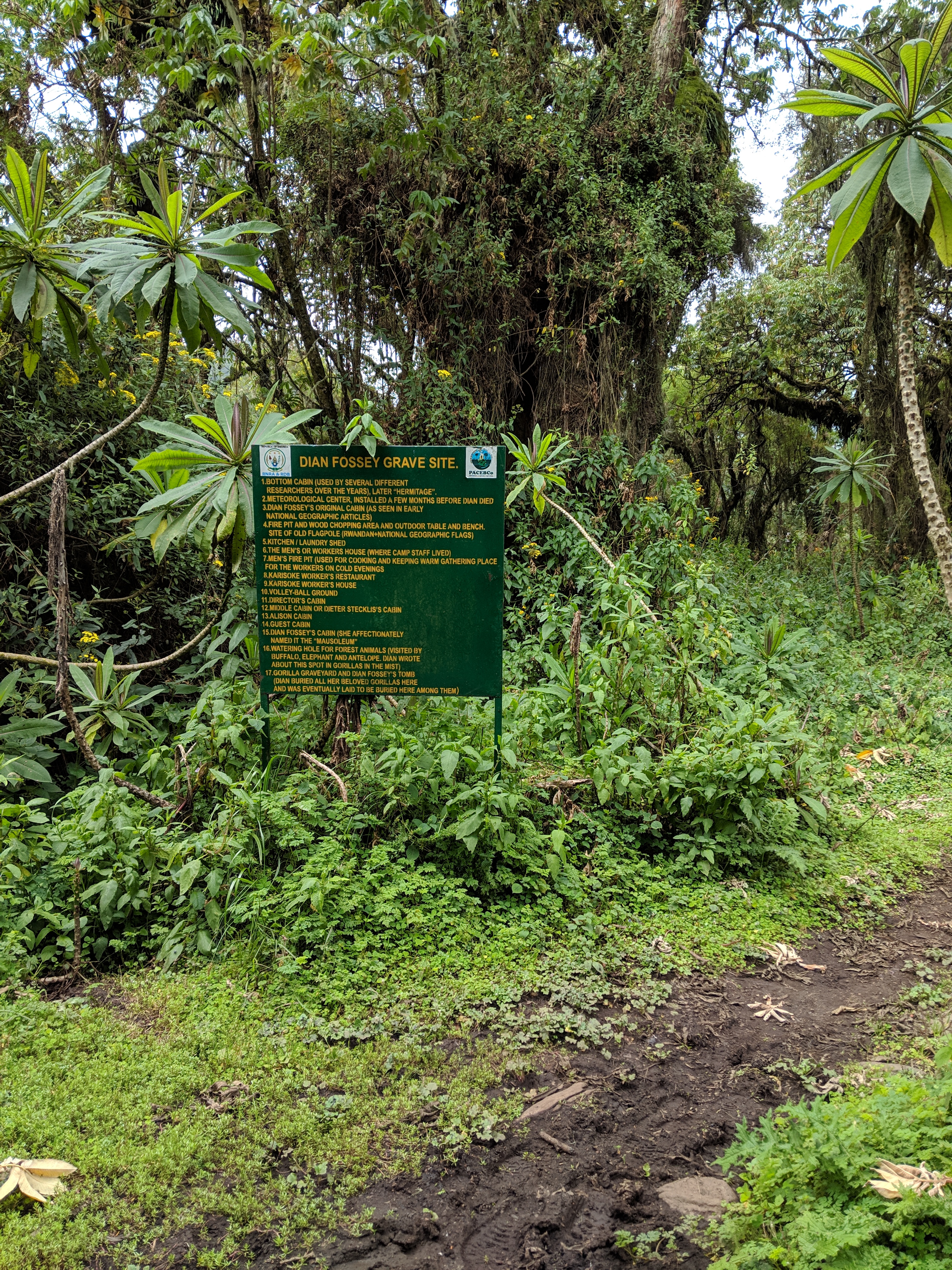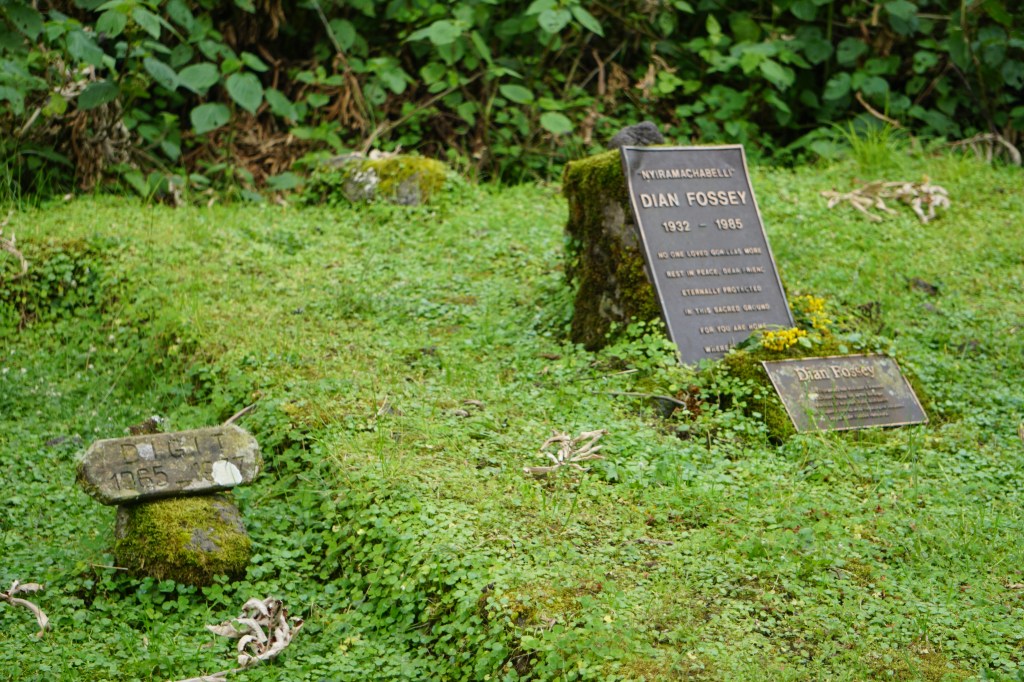 The trail becomes quite muddy and I’m grateful for my waterproof boots and gators. As we climb to 10,100 ft. I can feel it getting cooler and the shade of the forest is relaxing. We arrive at the old, decomposing Karisoke Research Center, Dian’s cabin and then just around the corner is the gravesite. Dian is buried in an area with 20+ gorillas. Dian is buried next to her beloved gorilla Digit who was murdered by poachers in 1977. Dian was murdered in 1985 in her cabin, presumably by poachers. They no longer bury gorillas here because it is so far from the current research center (they do research on their bones).