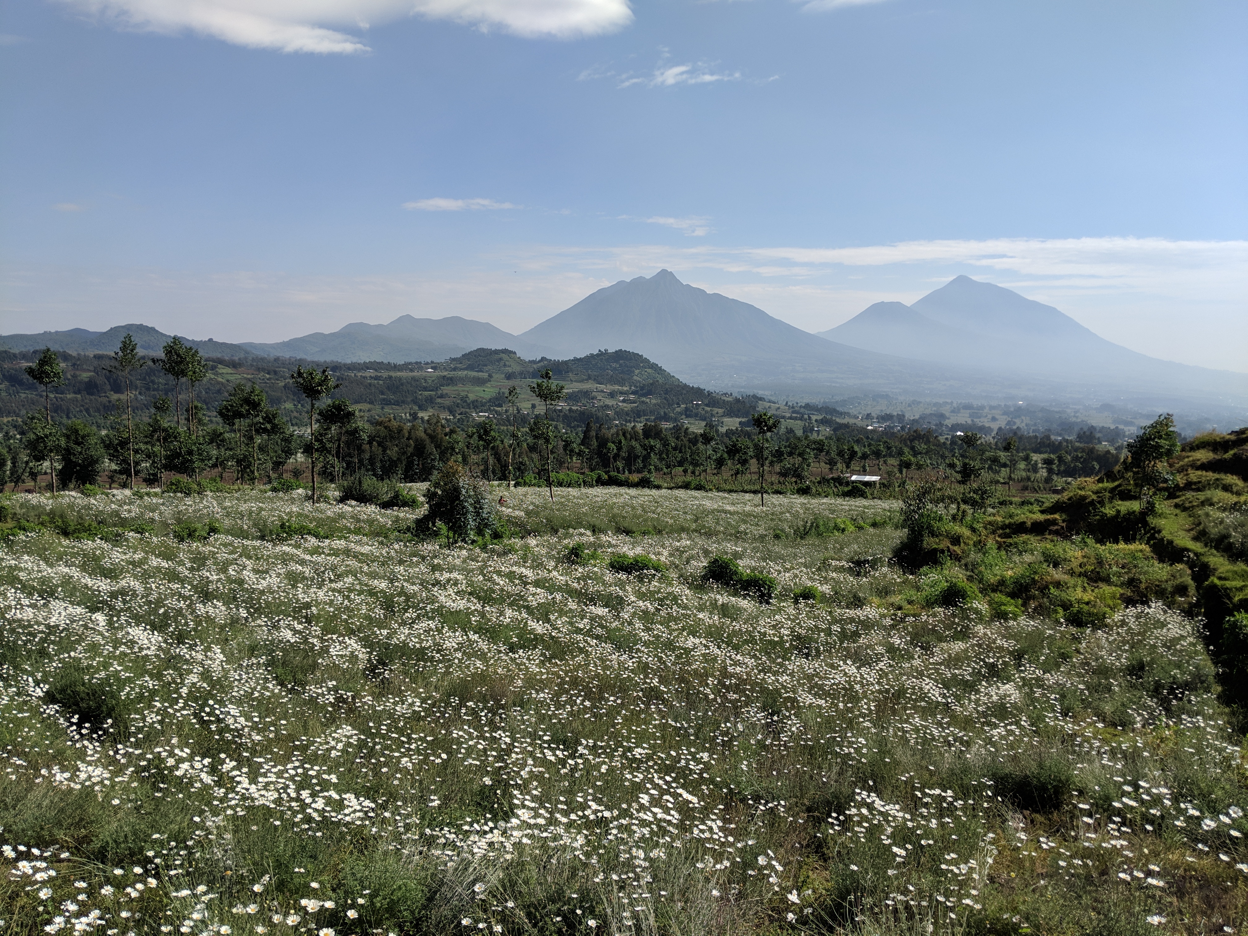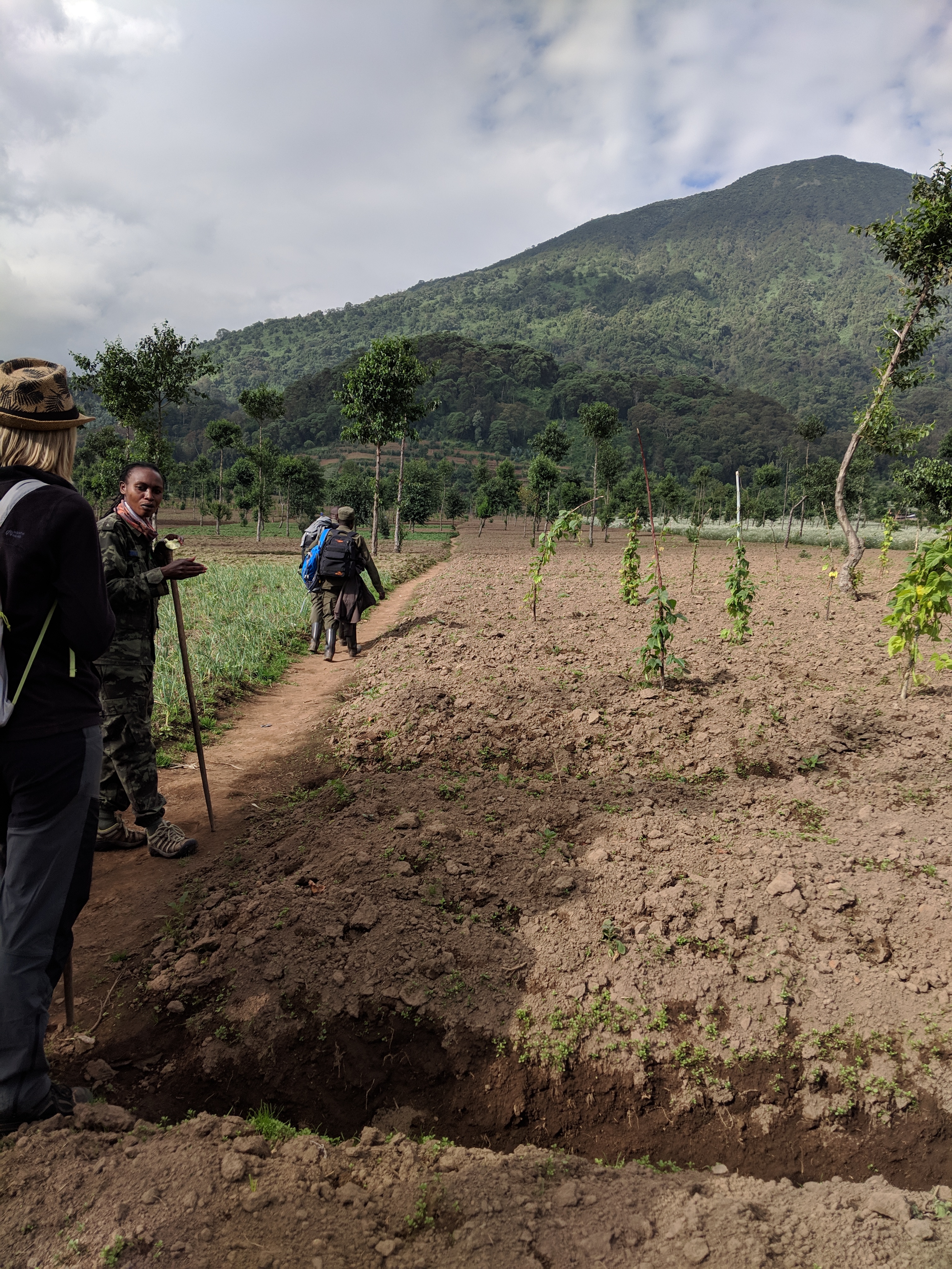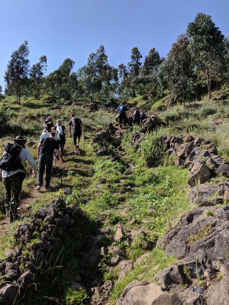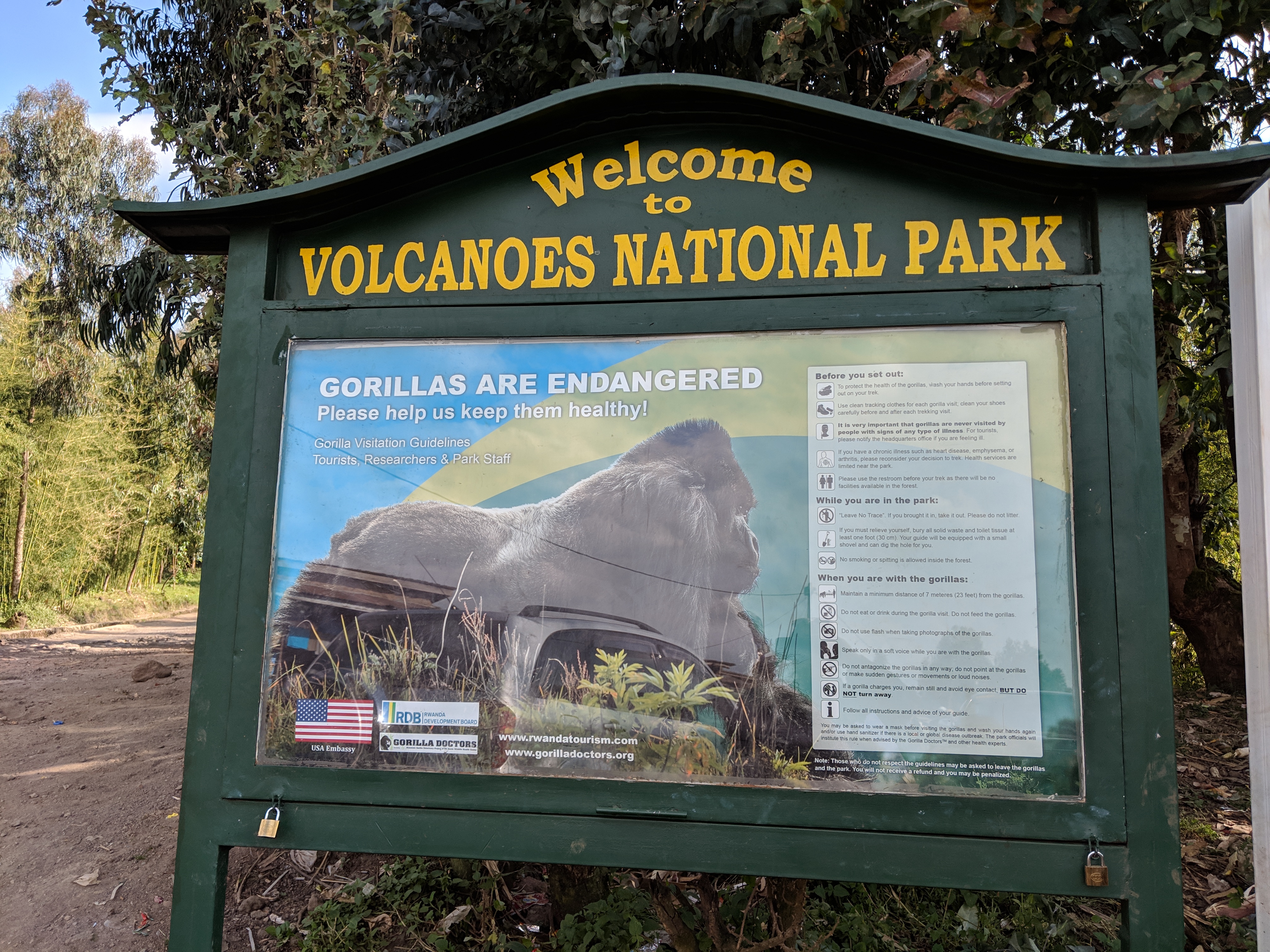 Another early start and a quick breakfast where I manage to incinerate a piece of toast. Toasters are not the same here and the toast does not pop up when done. So embarrassing when they had to open all the windows! Nassar drives me to the Volcanoes National Park Headquarters. We pass so many people on bicycles. The main modes of transportation seem to be motorbikes and bicycles. Bicycles are used as taxis too and some are loaded to the max with potatoes. The park has coffee and drinks for the mobs of tourists and then we break into smaller groups for our trip briefings. There’s eight of us today for the Dian Fossey Grave Hike and we load into cars and drive to the starting location. We turn onto a path that I guess is a road but really it’s just volcanic boulders. It’s the ultimate off-roading experience as we bounce along. Nassar calls this an African massage.