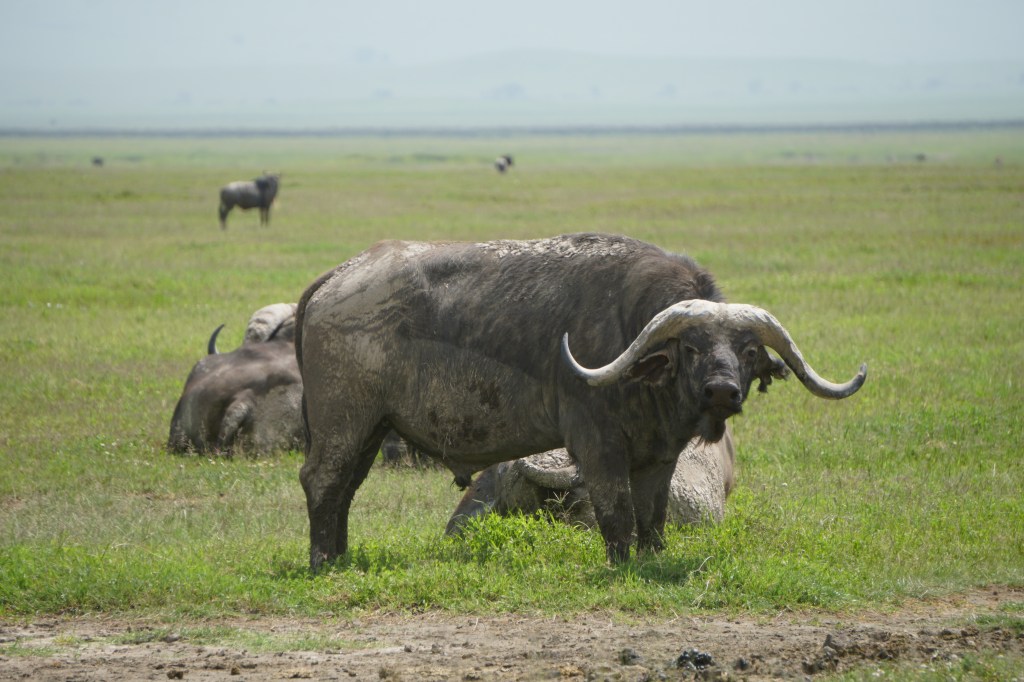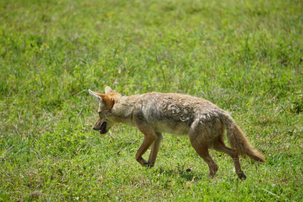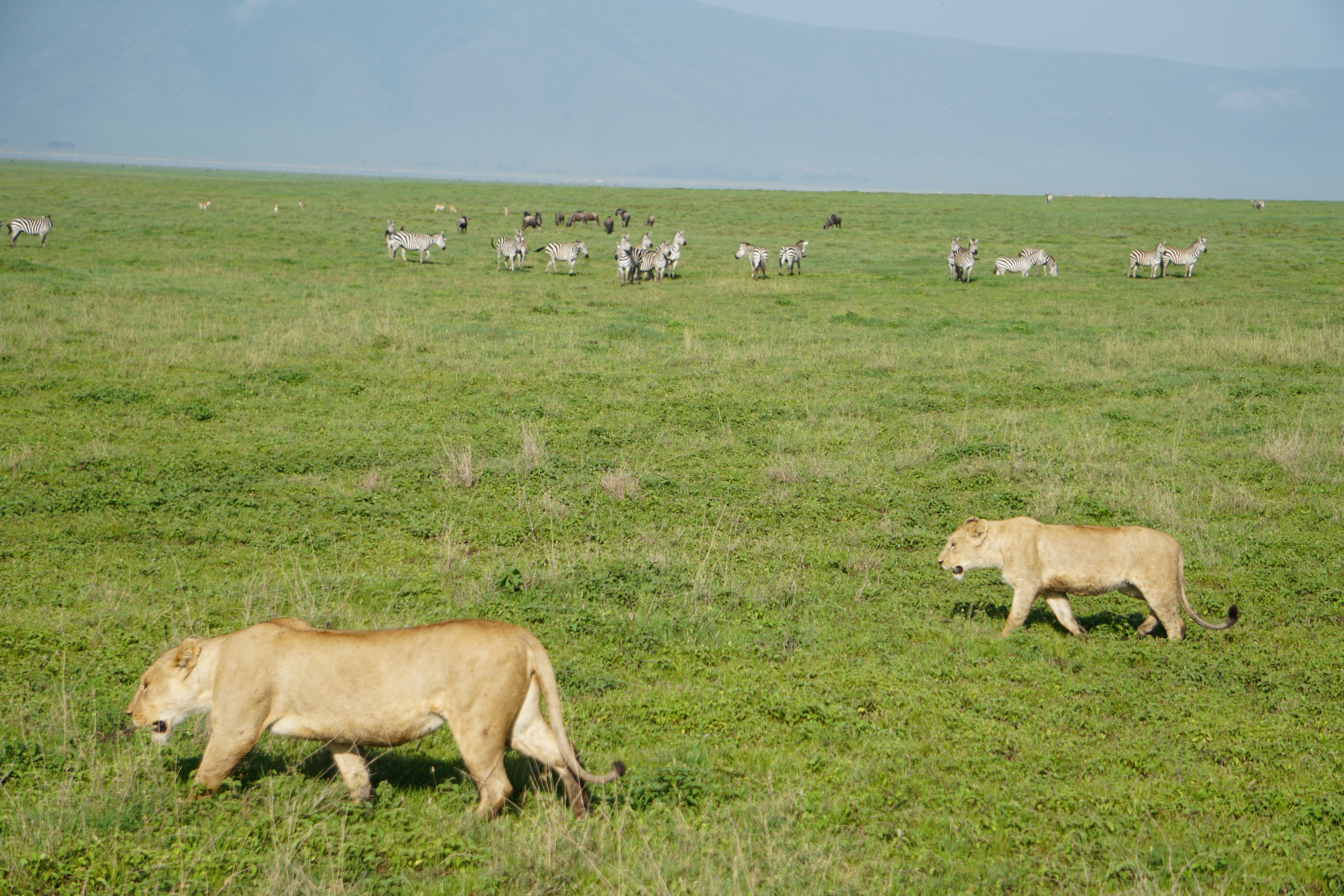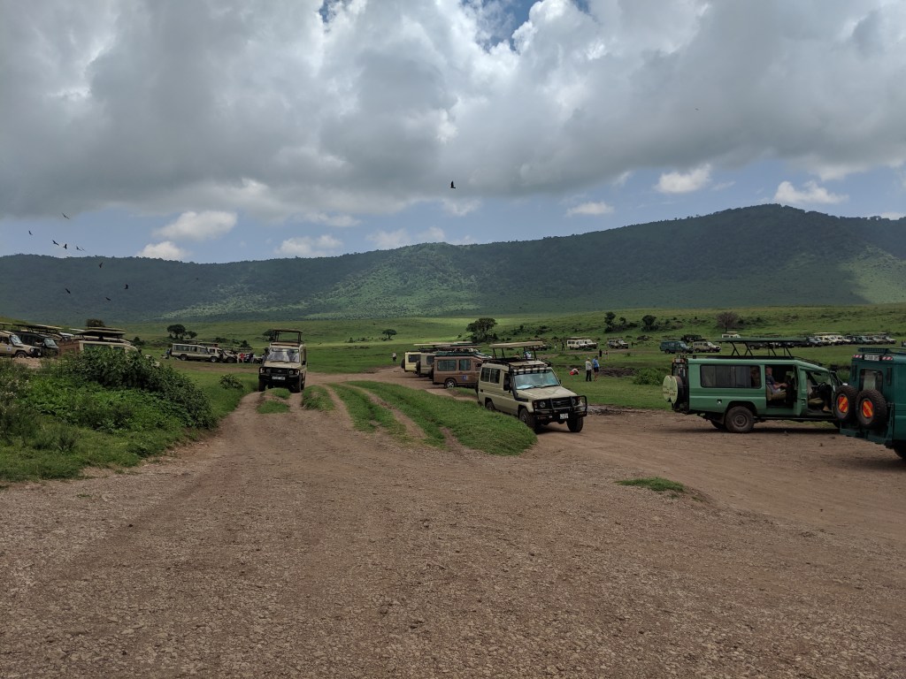 We quickly descend into the vast crater with long views in all directions. We spot an Augur buzzard perched atop a tree, Thomson’s gazelles, hyena, a foraging stork, and then there is word that there’s some lions on the move. The caravan of safari vehicles is quick to converge to see the lions. There’s one papa simba amongst the 11 and they move slowly across the grassy terrain. They eventually cross our path and stroll right by the vehicle. It’s simply amazing.