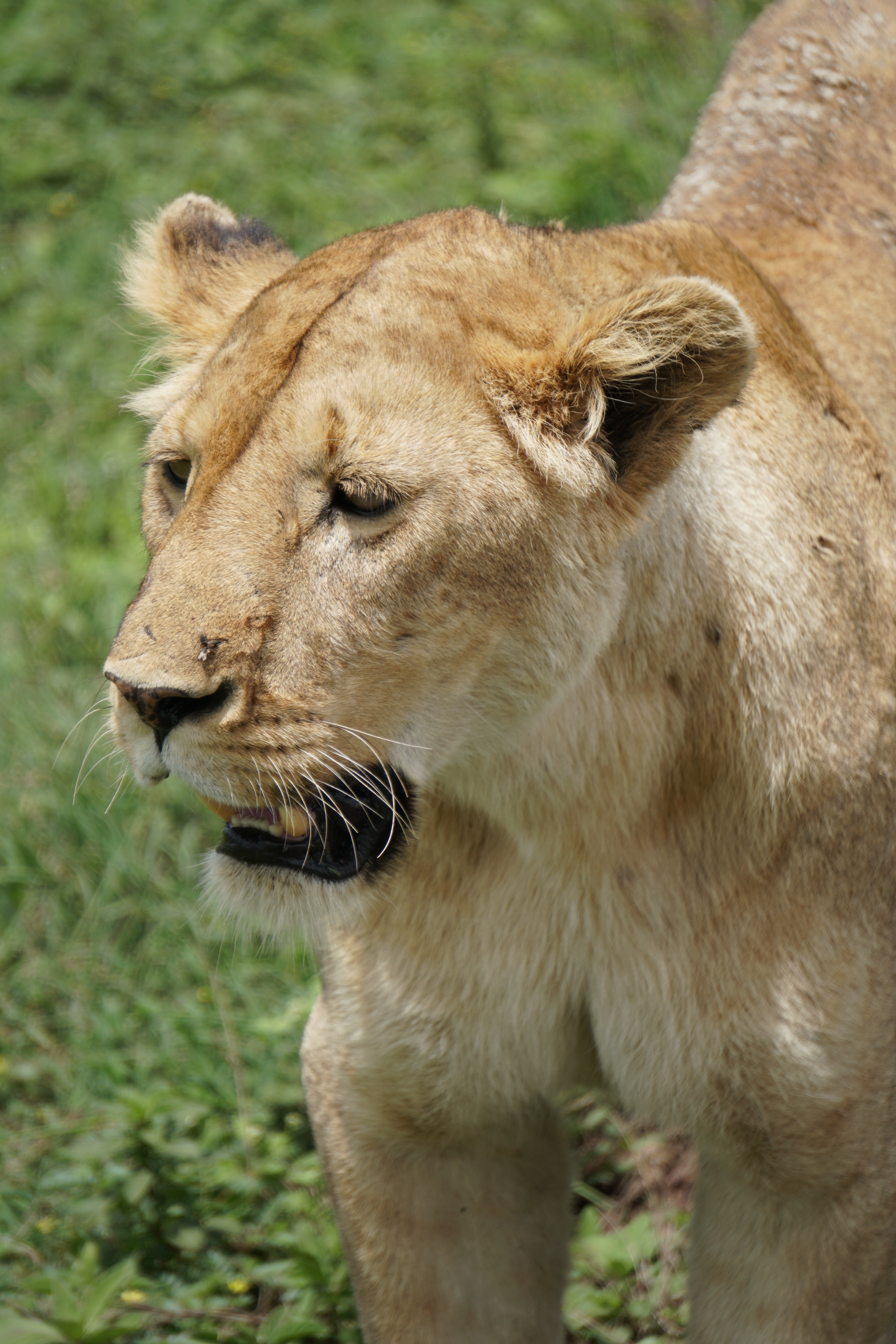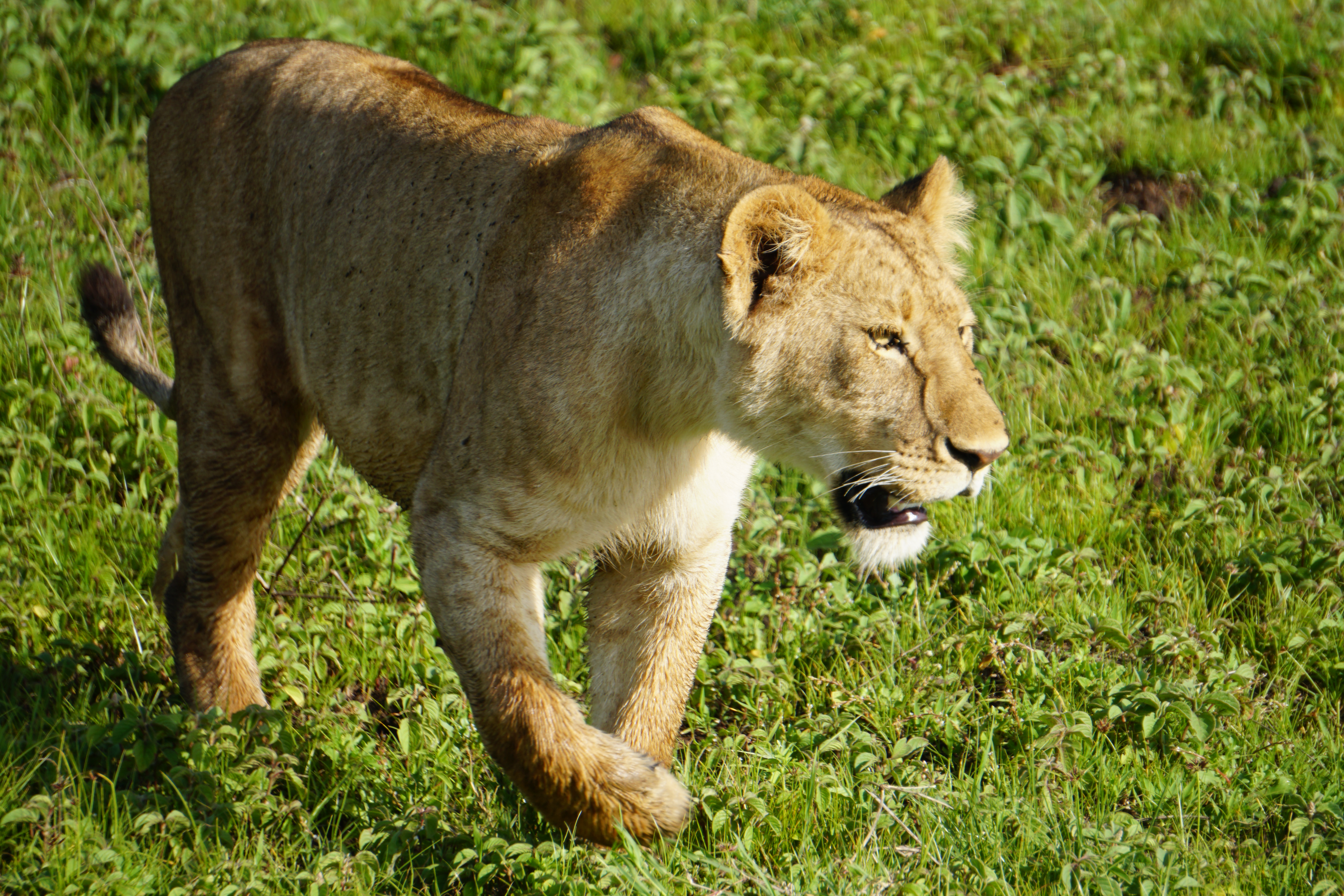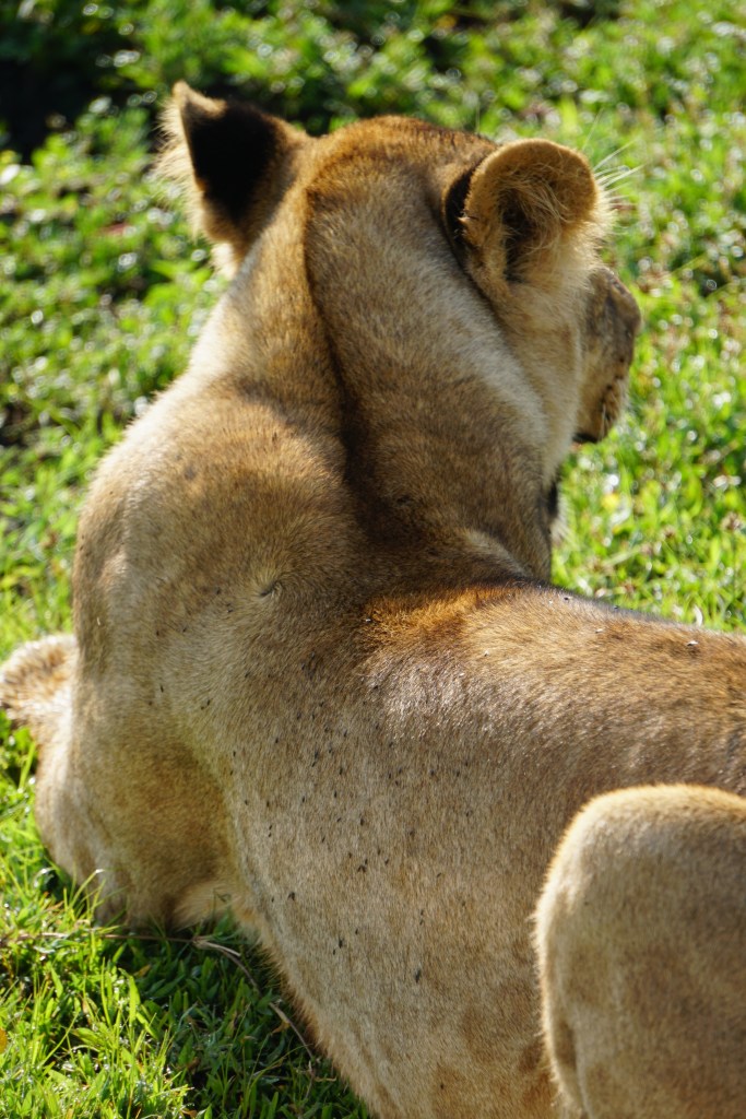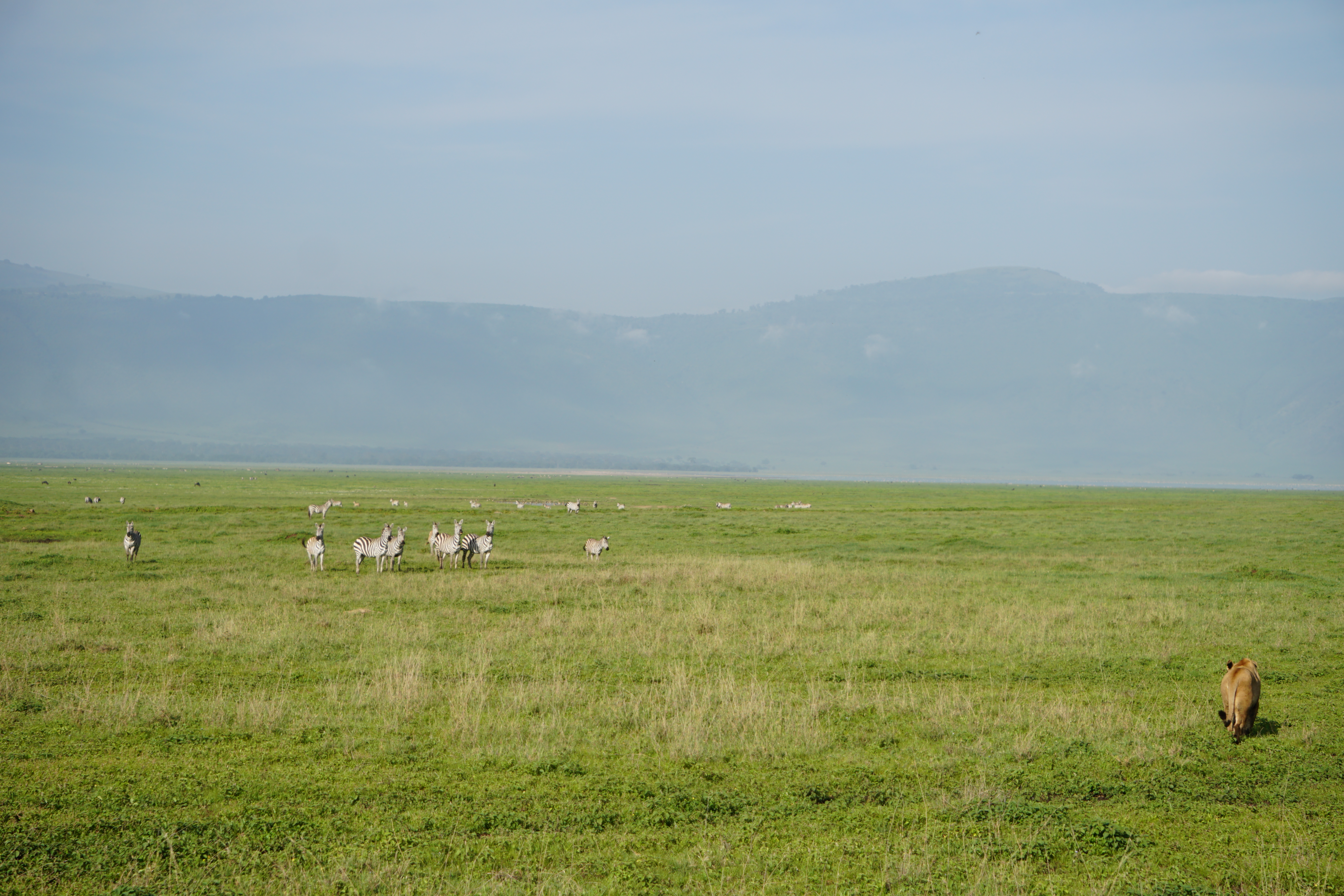 We quickly descend into the vast crater with long views in all directions. We spot an Augur buzzard perched atop a tree, Thomson’s gazelles, hyena, a foraging stork, and then there is word that there’s some lions on the move. The caravan of safari vehicles is quick to converge to see the lions. There’s one papa simba amongst the 11 and they move slowly across the grassy terrain. They eventually cross our path and stroll right by the vehicle. It’s simply amazing.