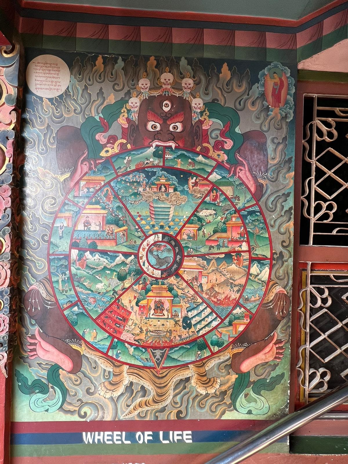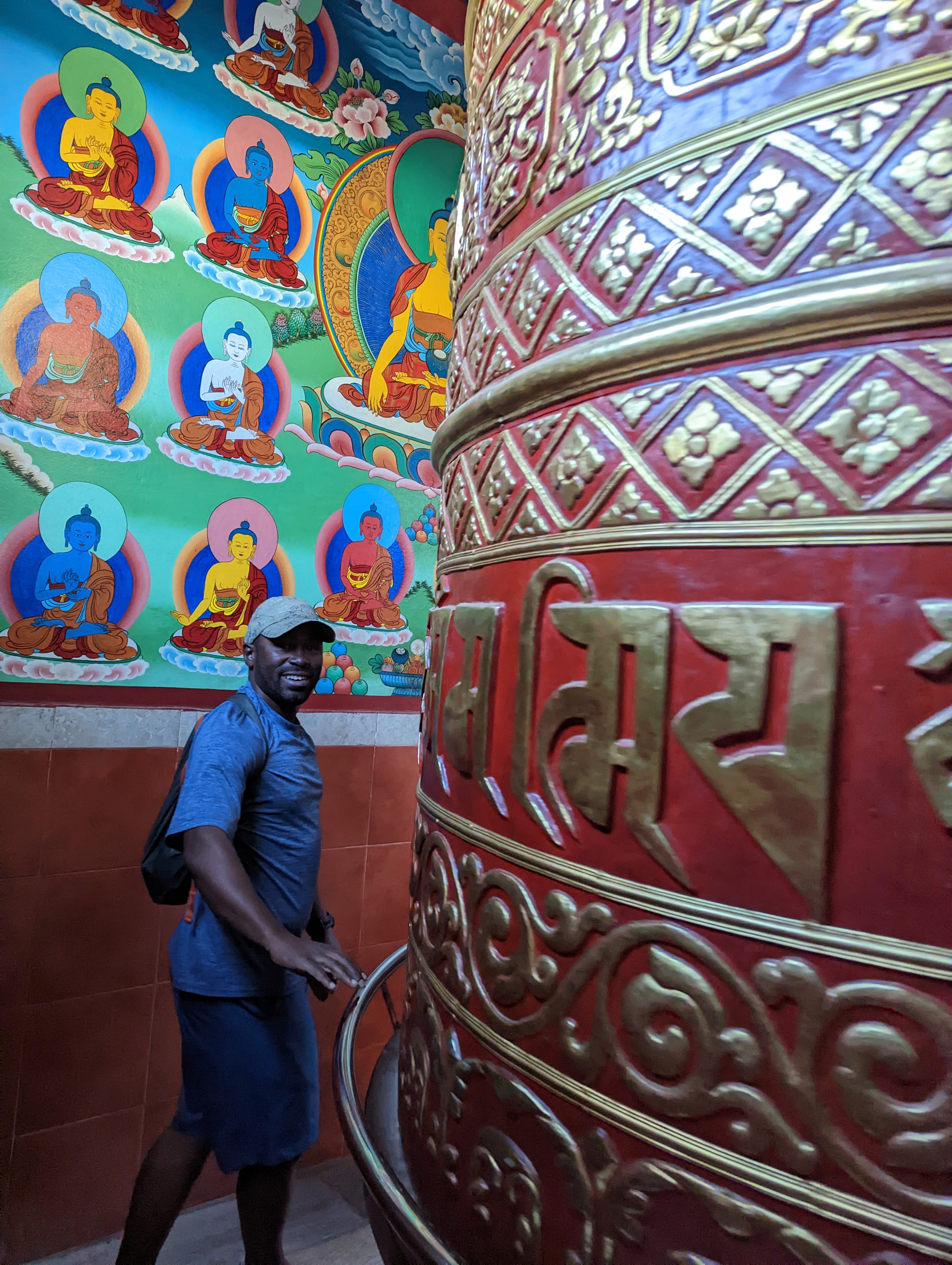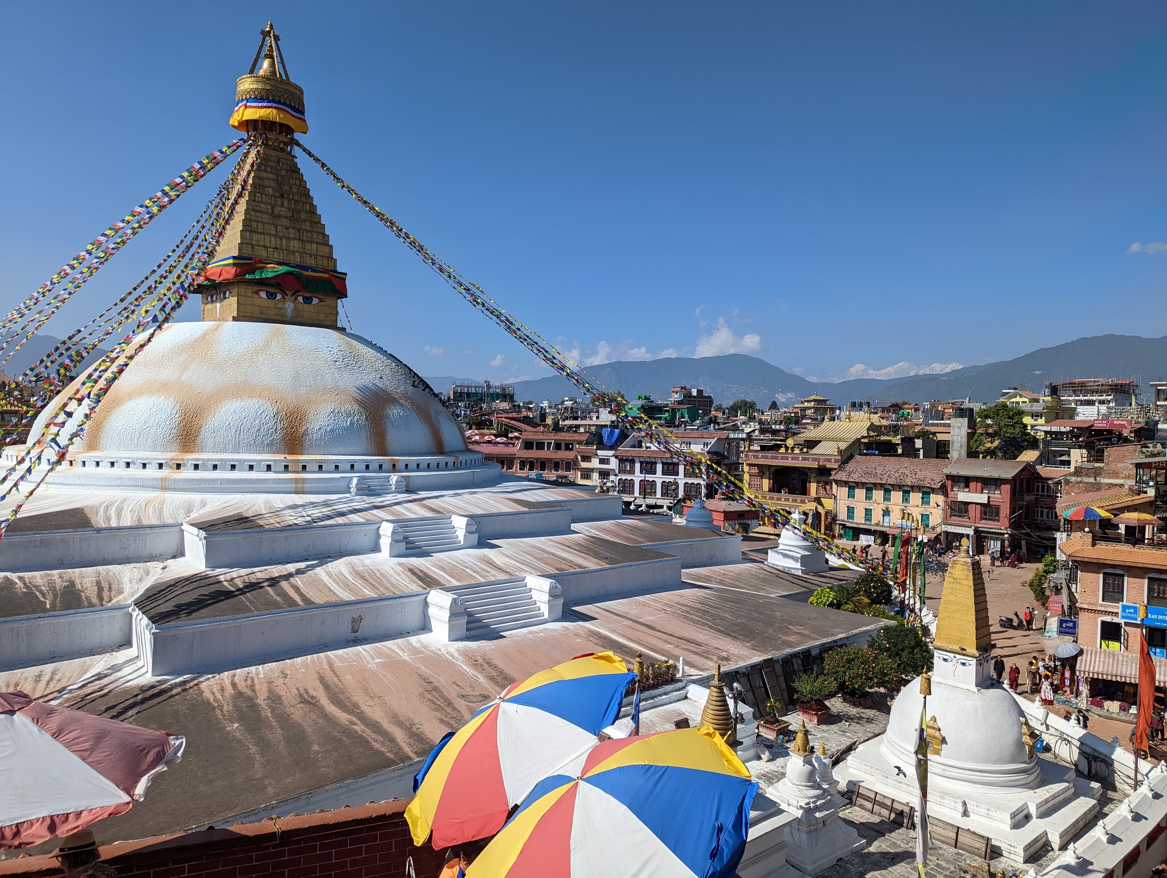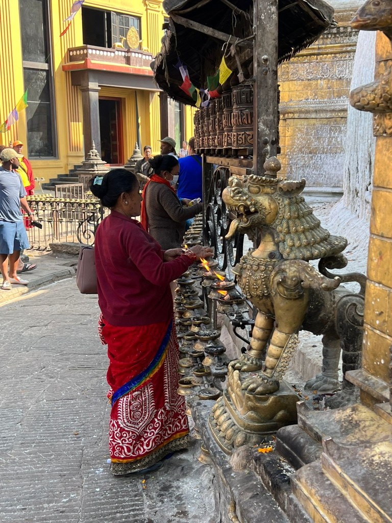After a rooftop lunch of Biryani, we walk in a clockwise direction around Boudhanath Stupa, as everyone does, in order to align with the natural force. The meditative walk purifies negative karma and fosters realizations of the path to enlightenment. We reach out and spin the prayer wheels, also in a clockwise direction. After removing our shoes we visit several monasteries. Pictures are allowed only in one of them. The stupa is circled by shops selling prayer beads, thangka art, mountain gear and general tourist souvenirs like t-shirts, magnets, jewelry and prayer flags. If you push beyond the main circle, the shops are more for everyday living. Fabric and textiles, butcher, fresh food market, prayer beads, flags and candles.