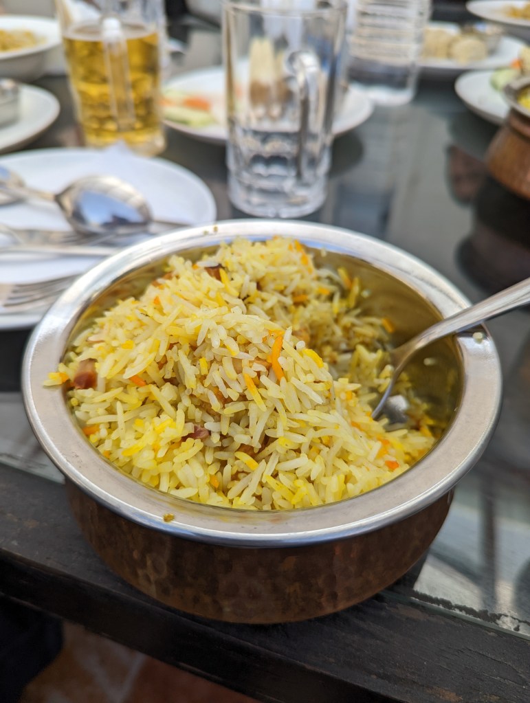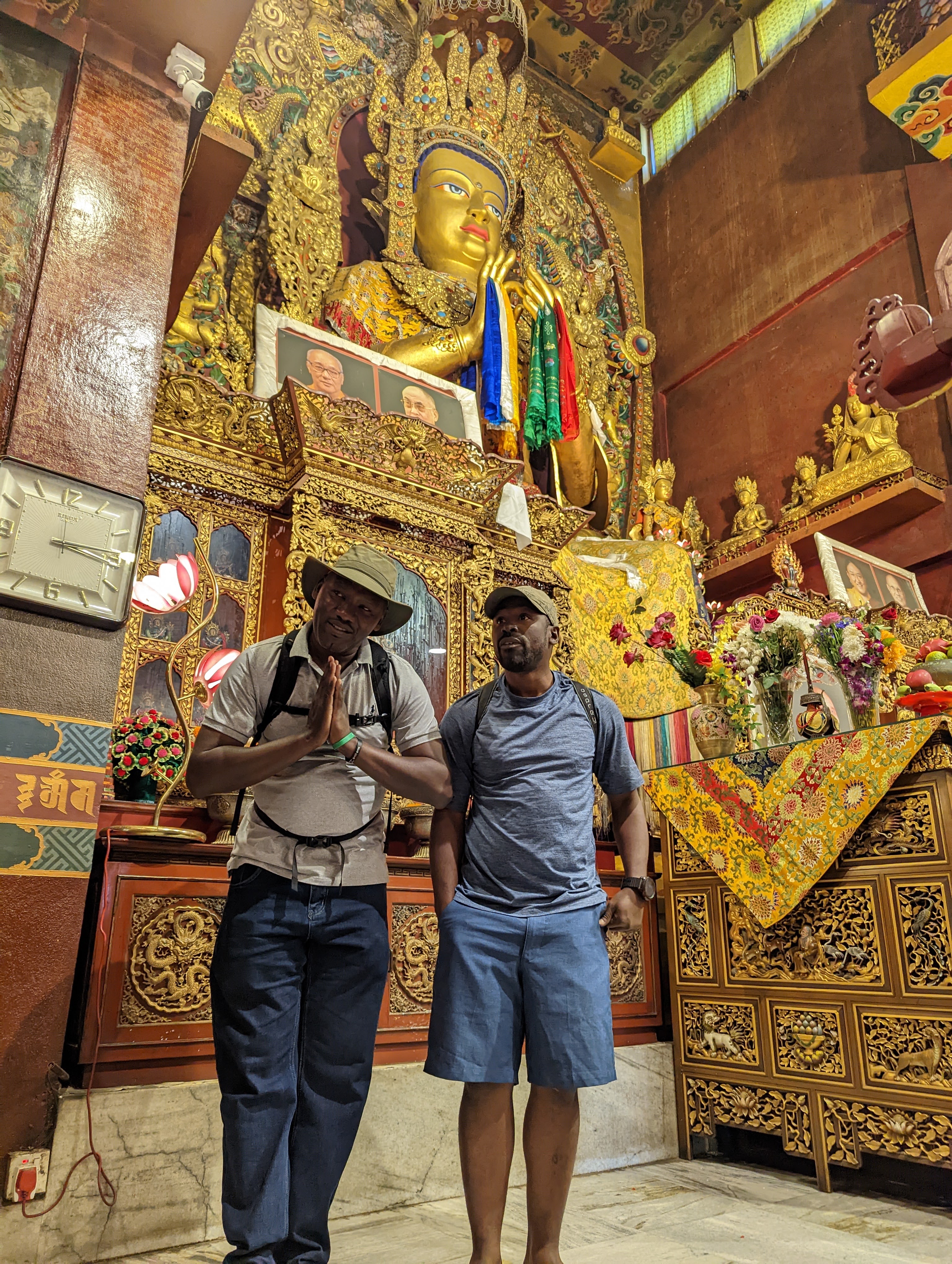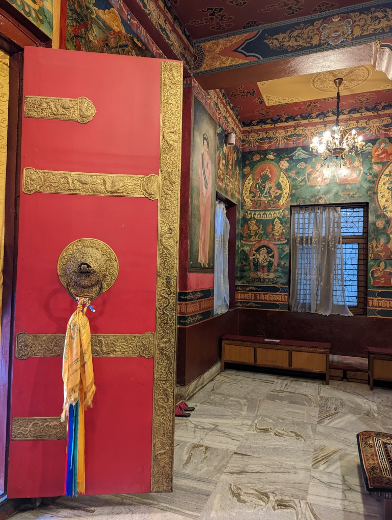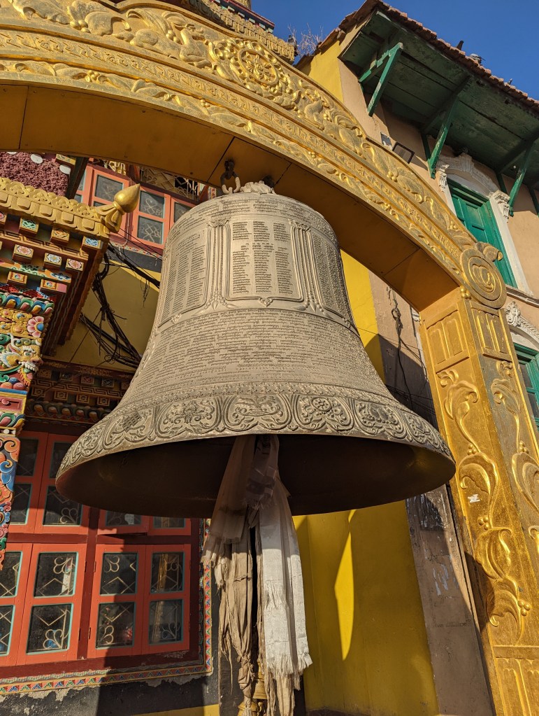 After a rooftop lunch of Biryani, we walk in a clockwise direction around Boudhanath Stupa, as everyone does, in order to align with the natural force. The meditative walk purifies negative karma and fosters realizations of the path to enlightenment. We reach out and spin the prayer wheels, also in a clockwise direction. After removing our shoes we visit several monasteries. Pictures are allowed only in one of them. The stupa is circled by shops selling prayer beads, thangka art, mountain gear and general tourist souvenirs like t-shirts, magnets, jewelry and prayer flags. If you push beyond the main circle, the shops are more for everyday living. Fabric and textiles, butcher, fresh food market, prayer beads, flags and candles.