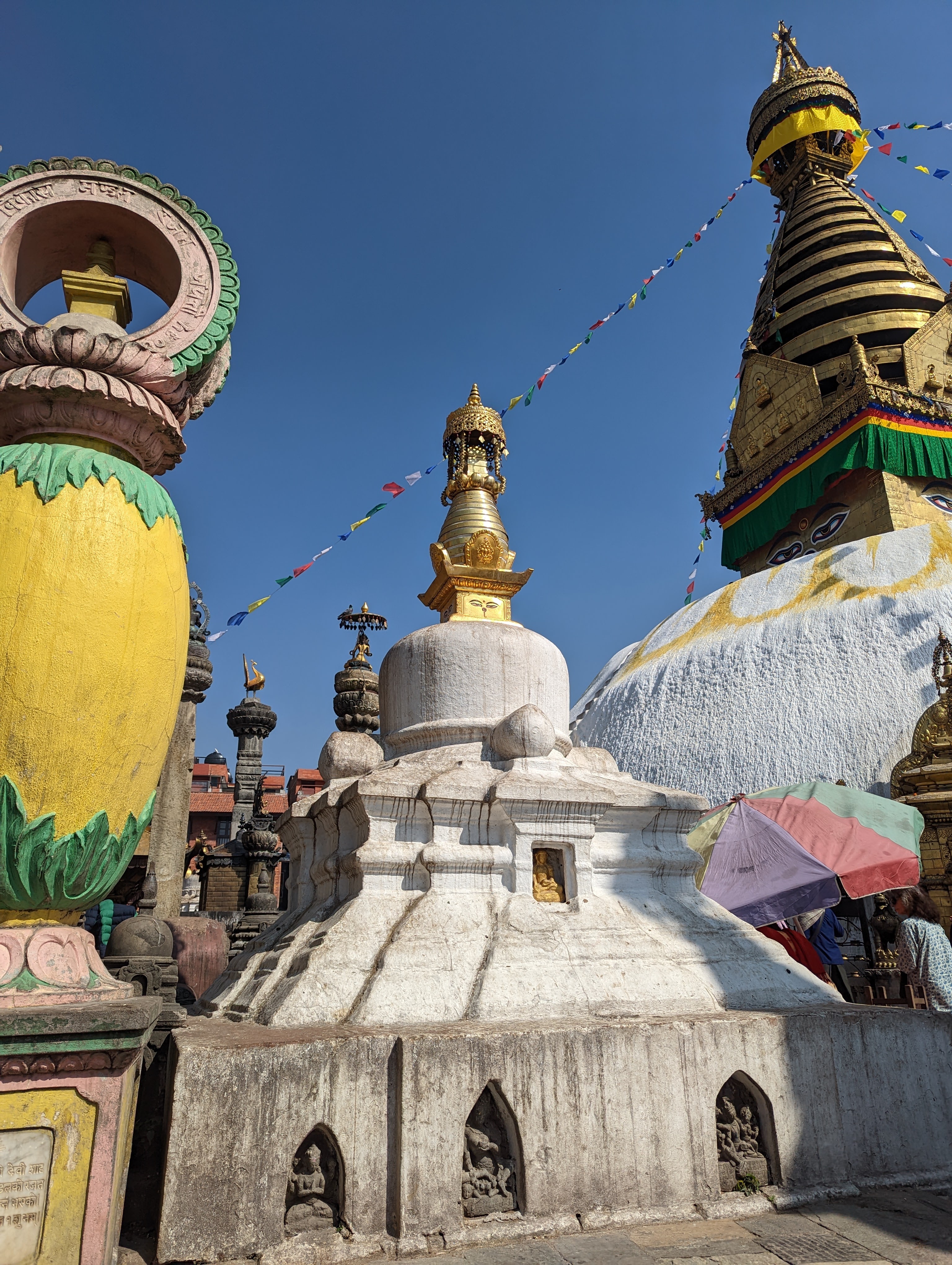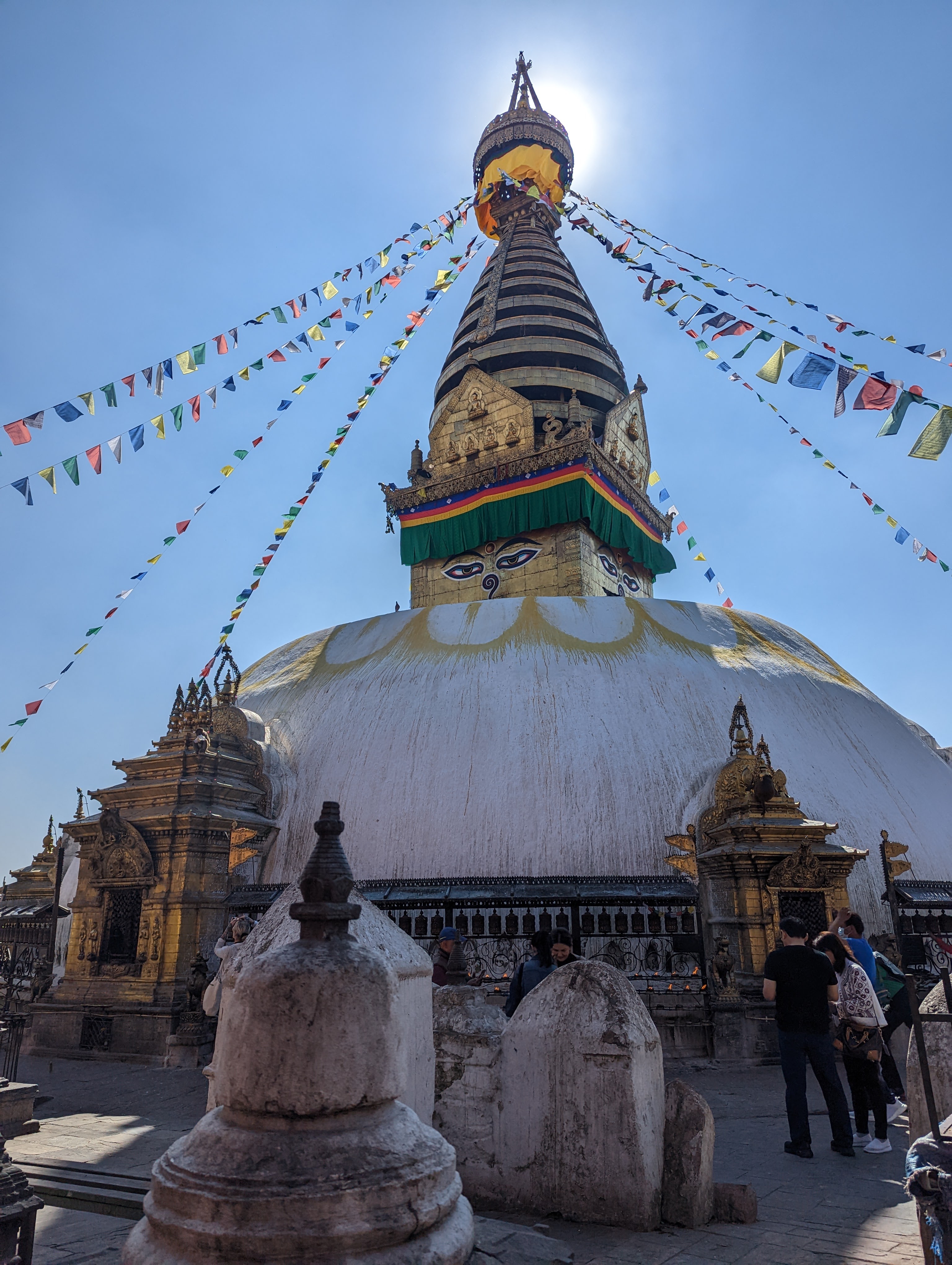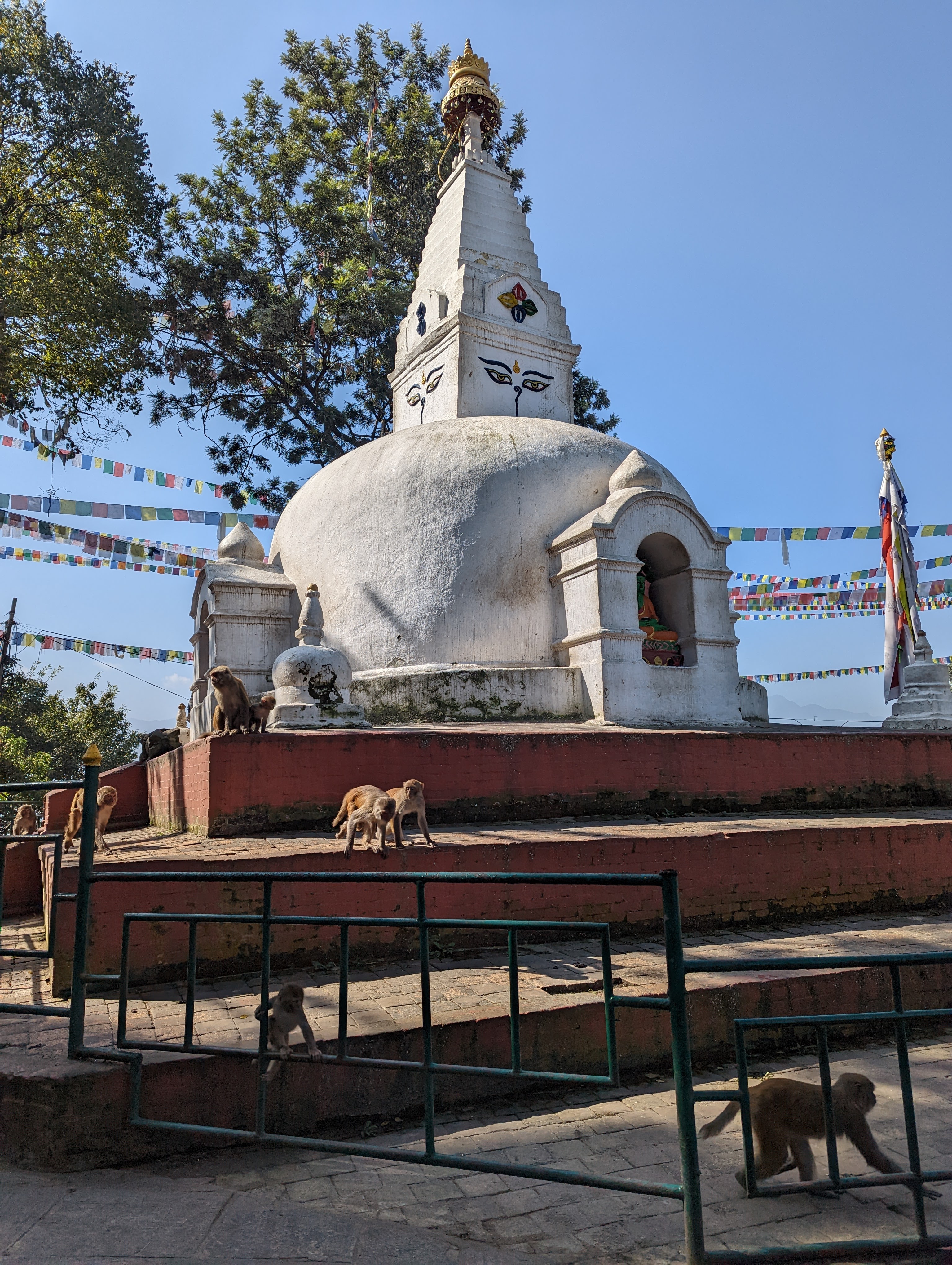 Swayambhunath is a hindu word but this temple is commonly known as Monkey Temple. This ancient temple sits atop a notable forested hill in Kathmandu. It is one of the oldest religious sites in all of Nepal and is a Buddhist pilgrimage site. Although the site is considered Buddhist, it is revered by Buddhists and Hindus alike. The complex includes a stupa, shrines and temples. The sacred monkeys are everywhere and ready to snatch a snack right out of your hand. Dogs also sleep around a stupa, soaking up the sun and are seemingly oblivious to our presence. There are certain areas where photos are not allowed and shoes are not allowed inside the temples.