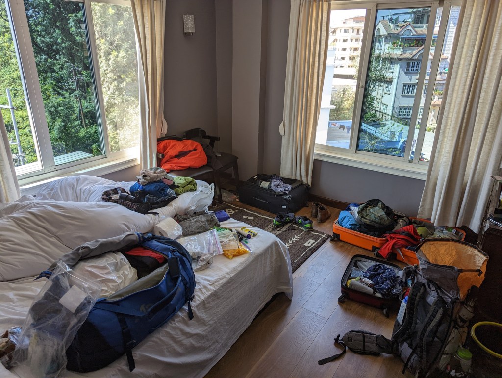 Upon returning to Hotel Butsugen, it’s time to get serious about reducing the gear. My total weight is still a few pounds over. Part of the added challenge is that I want to take snacks like Snickers bars, trail mix, dried mangoes, energy/protein bars, hard butterscotch candies, electrolyte and drink mix. I open up the new duffel and it is off gassing a toxic plastic smell. Fun. If I want my snacks I have to make some serious choices. I remove my thermarest xtherm, gg 1/8″ foam pad, flip flops, large pack towel, cocoon pillow (which after 13 years has sadly sprung a leak), two 1.5L nalgene bottles and add one 1L nalgene, platypus water filter, 1 outdoor research thermal top, rain skirt, half the underwear, injinji snow socks, qiviut beanie, icebreaker bra, purple rain skirt, dirty girl gaiters, outdoor research flurry gloves, keyboard, earbuds, book, cards and about half of the snacks. Caspar is ditching gear too and adds some of the snacks to his bag. Also part of the strategy is to wear the heaviest clothes on your body for the flight. Midnight is quickly approaching as our total gear finally weighs in at 15kg each. I stay up to work on some emails and reducing the power usage of my watch. It’s just before 2am when I lay my head down for the night.