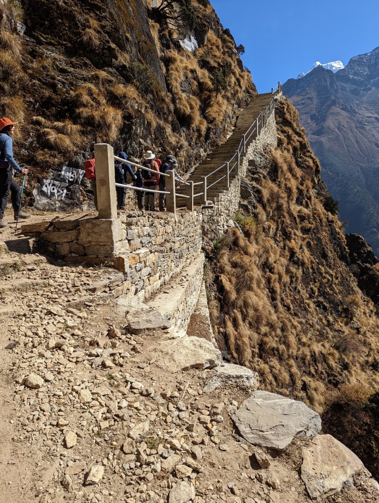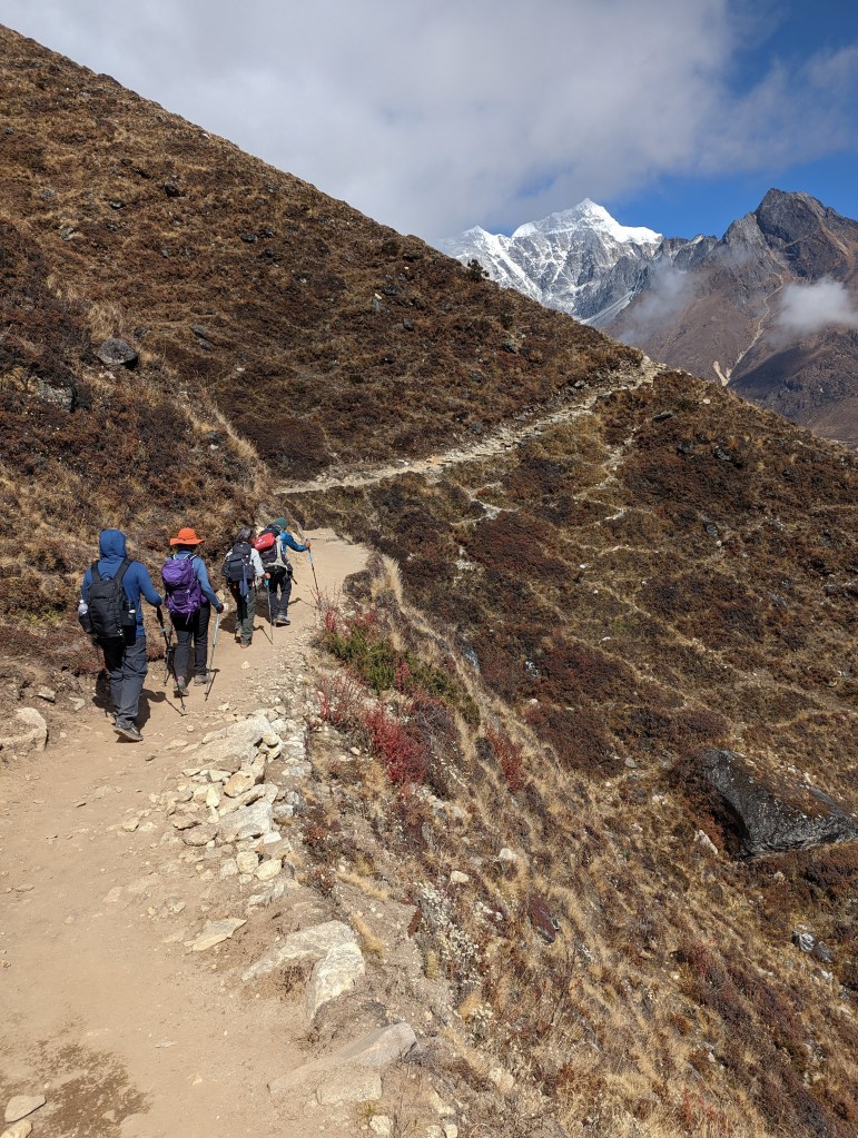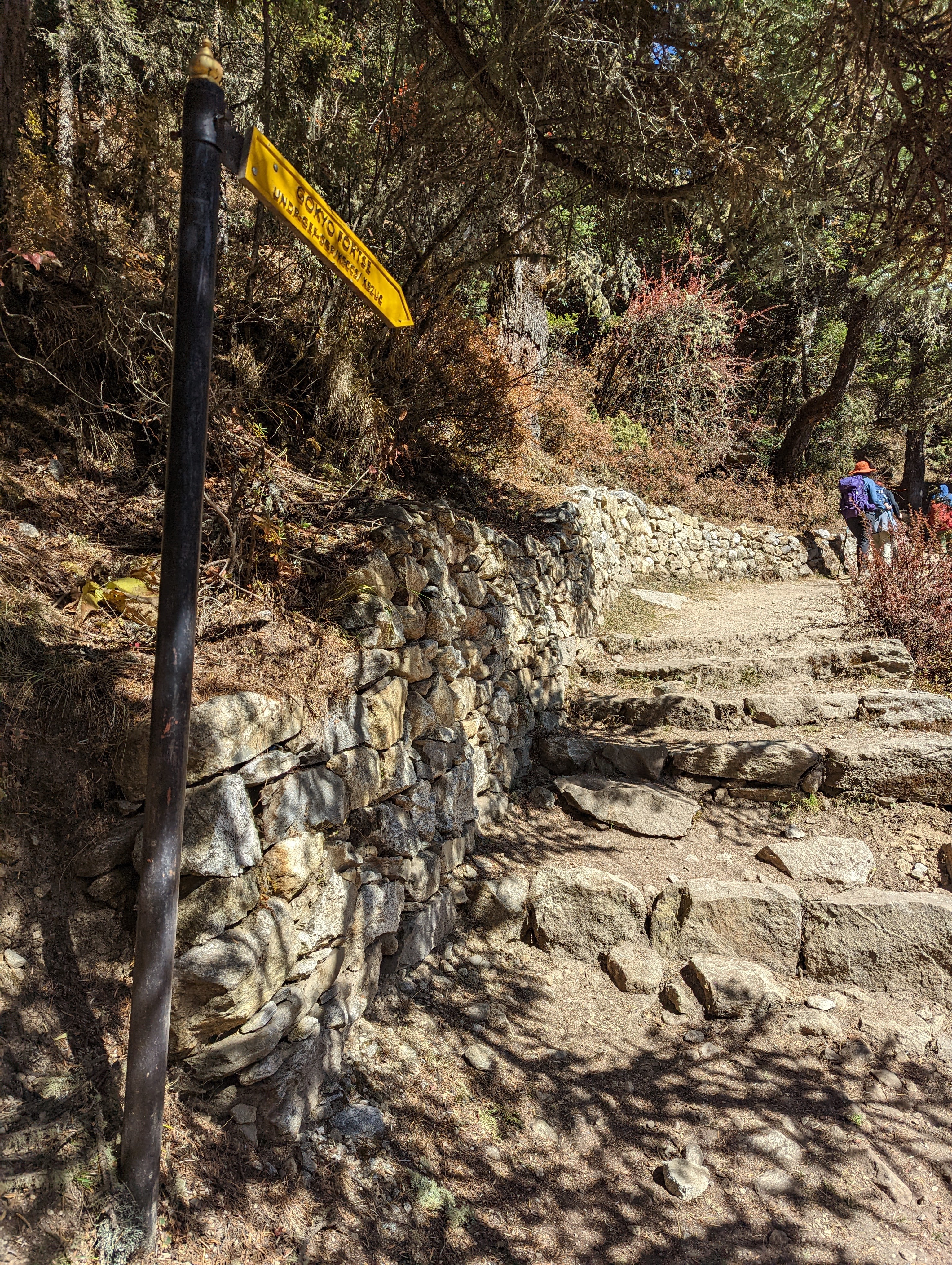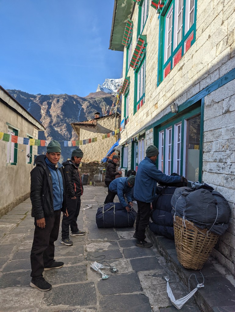 Breakfast at 7am and departure just after 8am. Our porters, which we still haven’t formally met, are outside preparing our bags for transport. We say hi to each other but they do not speak enough English for us to have a conversation. The sun shines brightly and glints off the snowy mountain tops. We make our way up and out of Namche Bazaar climbing gradually in between segments of trail and stone stairs. We pass a small chorten (stupa) dedicated to the 50th anniversary (1953 – 2003) of Tenzing Norgay’s summit of Everest and the Sherpas of Everest. As always, we are passed by or meet yak and oxen trains transporting goods. There’s even the occasional client riding a horse which looks rather painful to me. After a tea break at the Ama Dablam View Lodge we climb gradually for hours until we reach our lunch destination of Mong La (13,021ft).