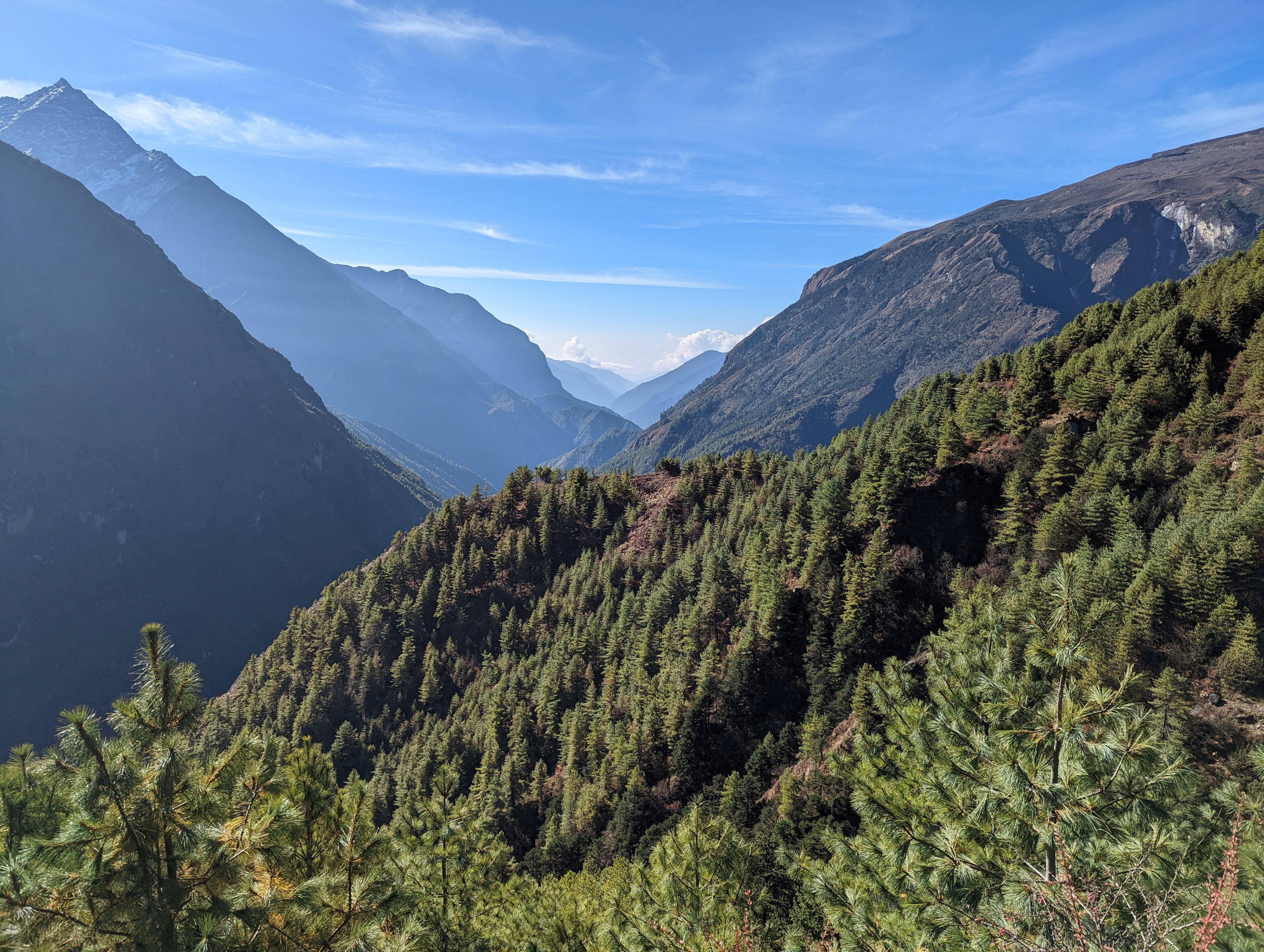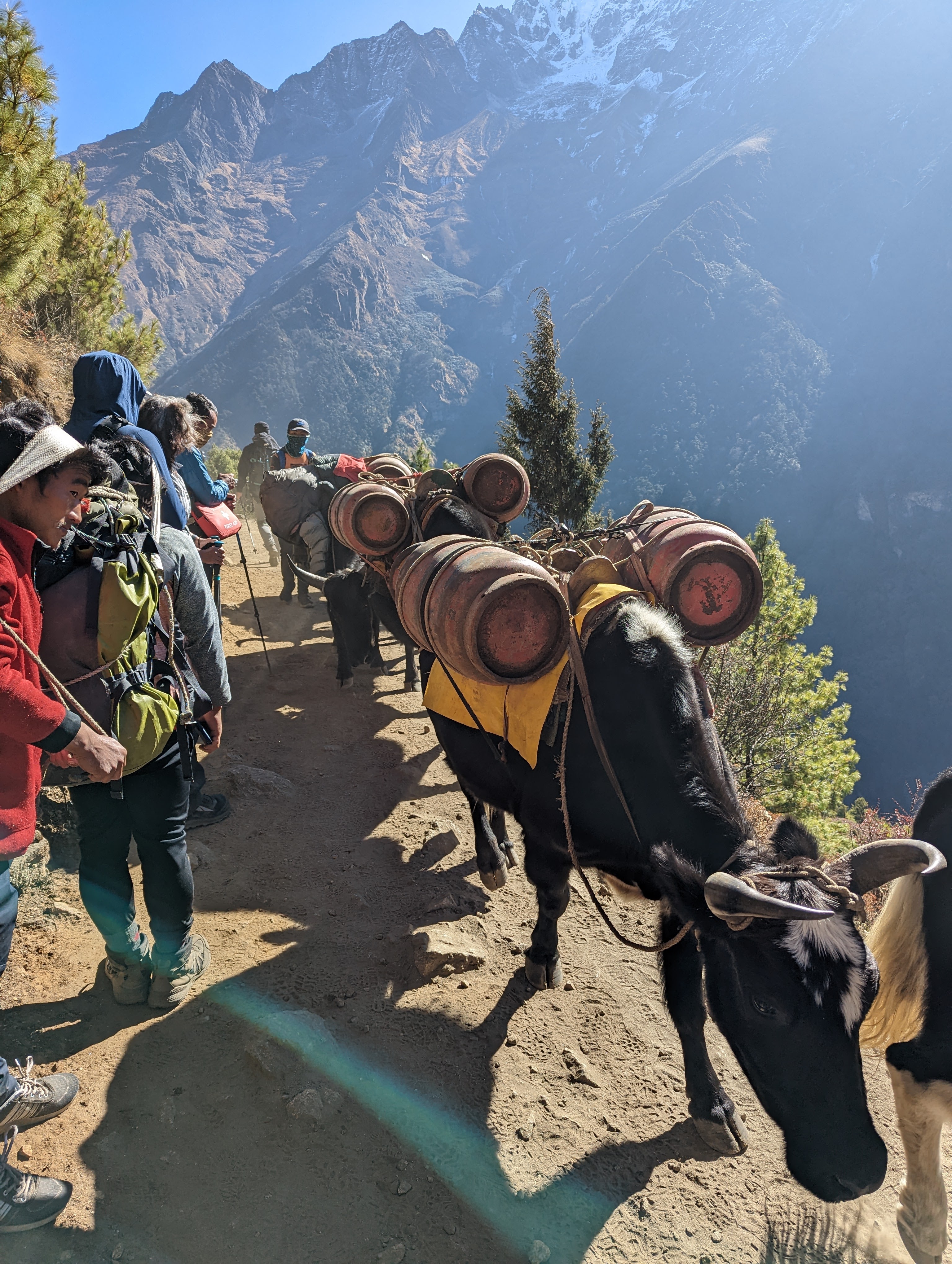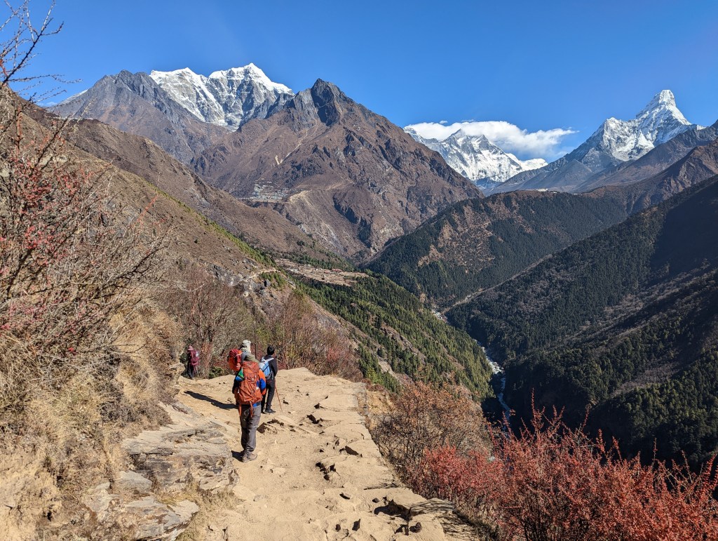 Breakfast at 7am and departure just after 8am. Our porters, which we still haven’t formally met, are outside preparing our bags for transport. We say hi to each other but they do not speak enough English for us to have a conversation. The sun shines brightly and glints off the snowy mountain tops. We make our way up and out of Namche Bazaar climbing gradually in between segments of trail and stone stairs. We pass a small chorten (stupa) dedicated to the 50th anniversary (1953 – 2003) of Tenzing Norgay’s summit of Everest and the Sherpas of Everest. As always, we are passed by or meet yak and oxen trains transporting goods. There’s even the occasional client riding a horse which looks rather painful to me. After a tea break at the Ama Dablam View Lodge we climb gradually for hours until we reach our lunch destination of Mong La (13,021ft).