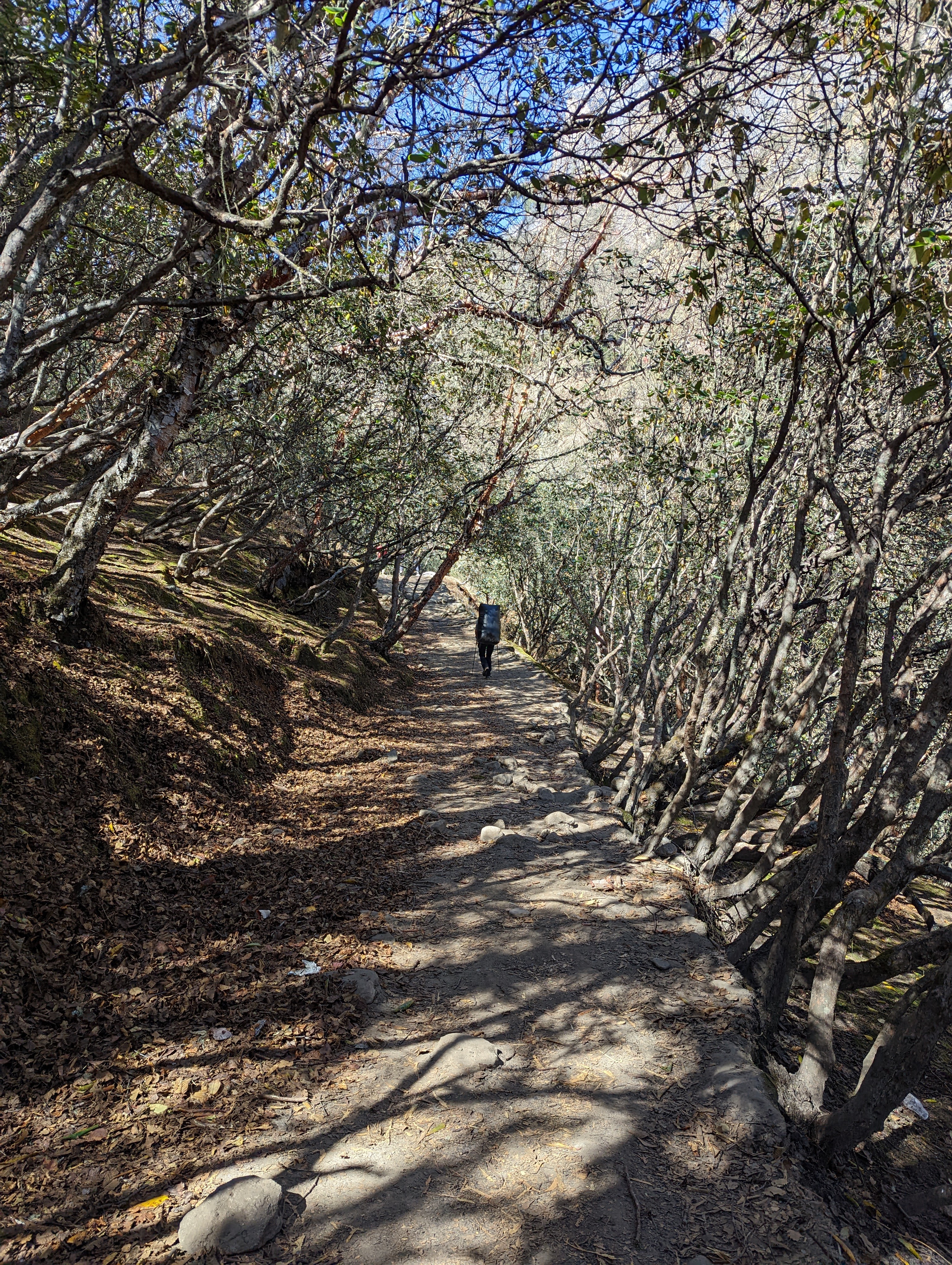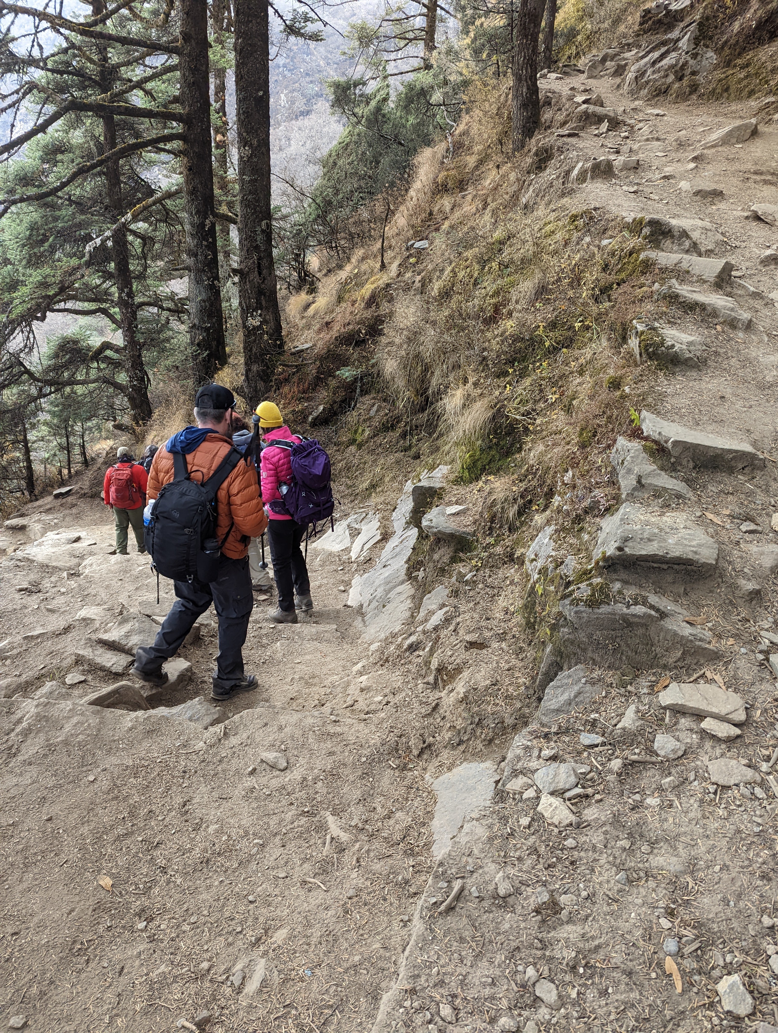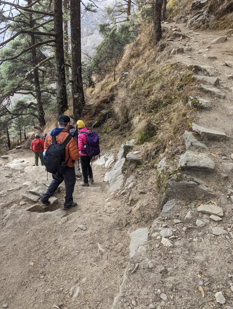 Before indulging in the warmth of the dining room, Caspar and I go to our room to change out of our sweaty clothes. Our room is freezing cold! I switch out my completely soaked bra and get into my lounge/camp clothes. We hurry back into the dining room where people are circled around the stove. We indulge on hot tea and scarf down cookies and biscuits like there is no tomorrow. Darkness has completely encircled us and Sue has not arrived yet. Tiger heads back out with his headlamp and a jug of hot tea. Maybe a half hour later, Tiger and Bikram appear with Sue and we cheer her arrival. Dinner starts with a luxurious hot steaming towel to clean our face. After filling up on biscuits, our dinner portions are too large so we share some of our extra portions with our guides. After slices of apple for dessert, we head for the room and get into our sleeping bags as fast as possible. Caspar is asleep before me and it’s all of 8:20pm when I’m finally ready for sleep. Today was definitely our longest and hardest day yet.