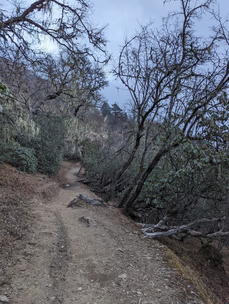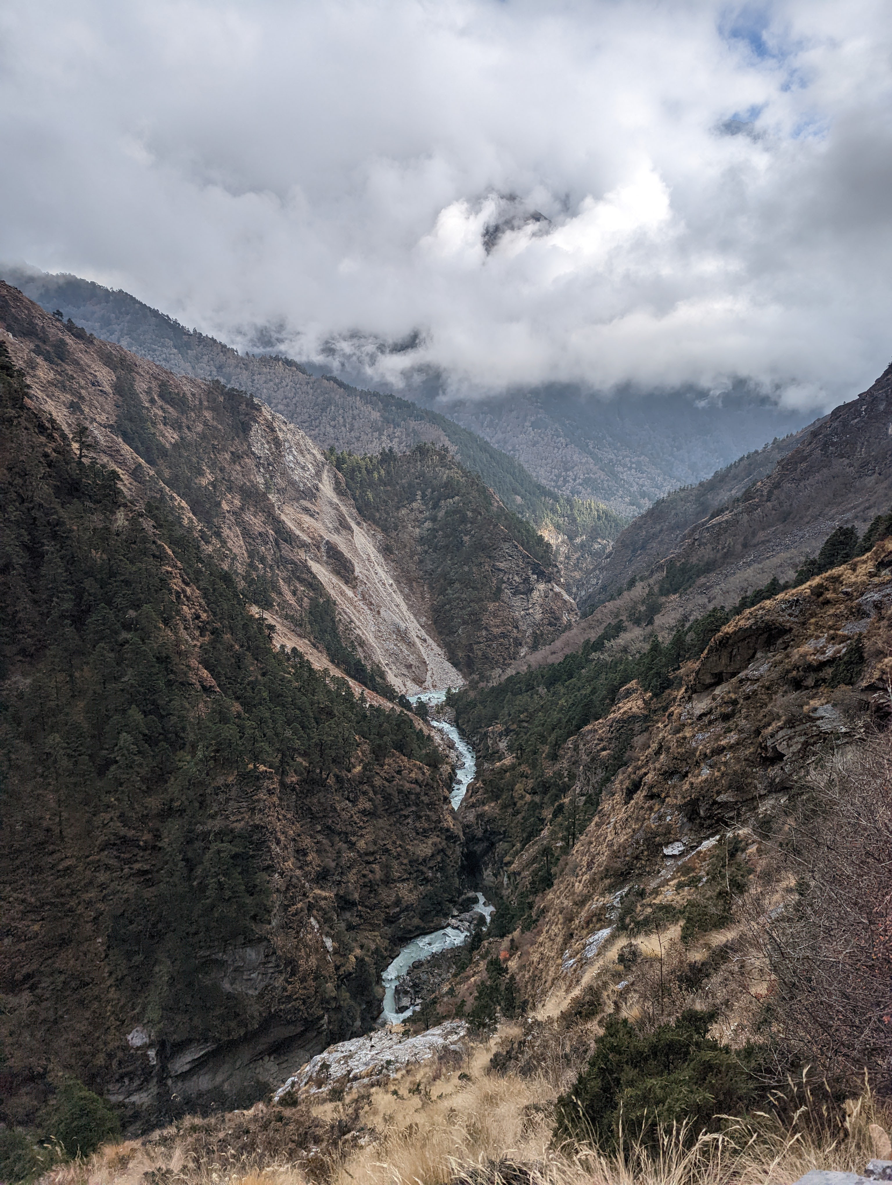 I eat way too much as the clouds move in around us. Without the sun, it becomes bitter cold. There’s a guy from America chatting us up a bit during lunch and he eventually asks where we are headed today. We tell him that Dole (say Doe-Lay) is our destination and he just makes a long groaning noise in response. After lunch we descend steeply as the gas from lunch kicks in hard. I toot my way down the switchbacks. We descend at least 1,200 feet into the valley, losing a lot the elevation gained in the morning. The Dudh Koshi River is just below us as we promptly start climbing steeply. We climb and climb and climb. I’m sweating like crazy but also freezing cold. I’m only wearing my rei northway hiking shirt on my core but I know that any additional layers will feel like torture. The clouds still hang above us and darkness is quickly approaching. Tiger, our chief guide, is with Caspar and I and he spots a black musk deer. The small deer is on the very steep hillside and seems to be foraging for any food that can be found. We pass many waterfalls along the shaded slope which have ice still hanging on them. It takes all my mental strength to keep pushing forward in the cold. I’m tempted to stop and put on another layer when the trail flattens slightly and I can start to smell smoke. We round the bend and there is the tiny village of Dole. Finally! As the fingers of darkness reach in, we descend off the trail to our home for the night at Alpine Cottage Lodge.