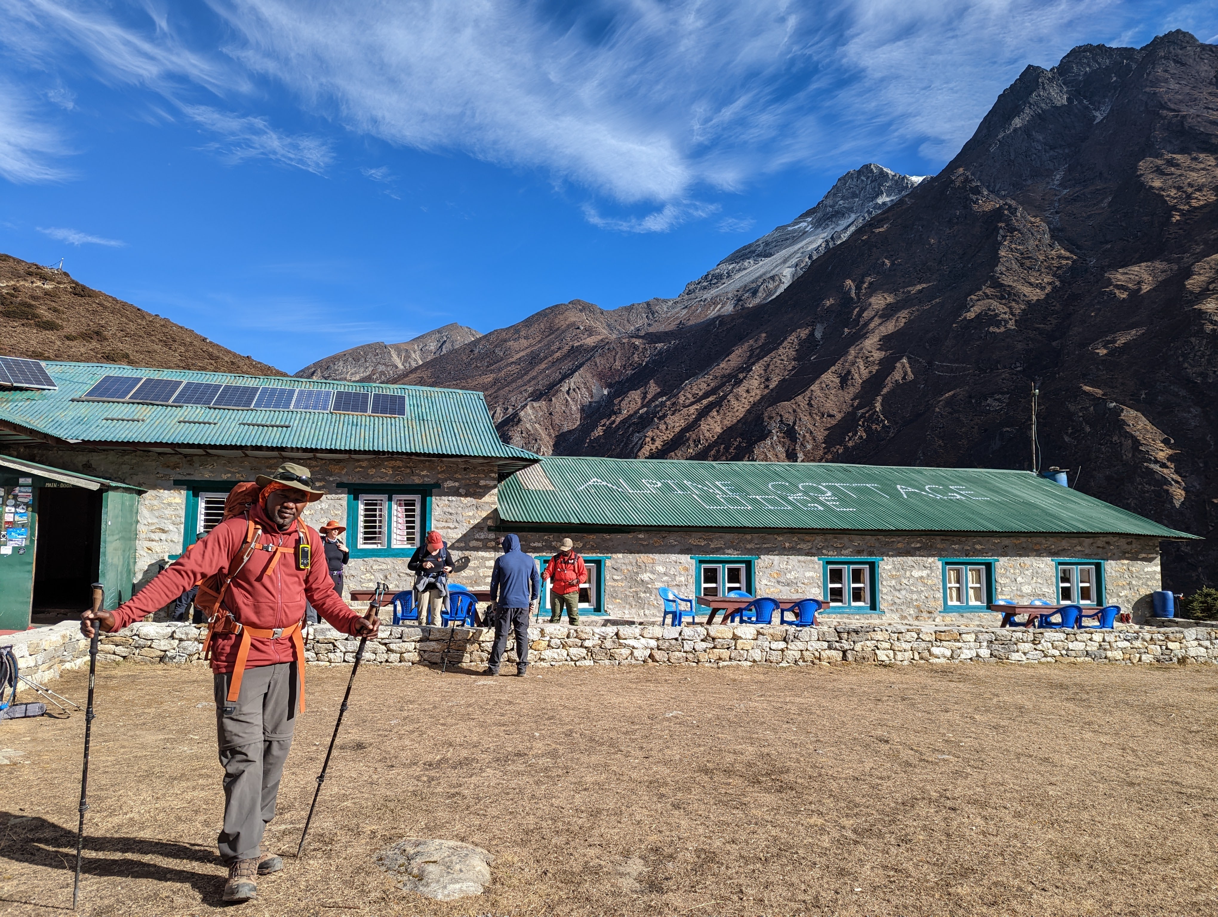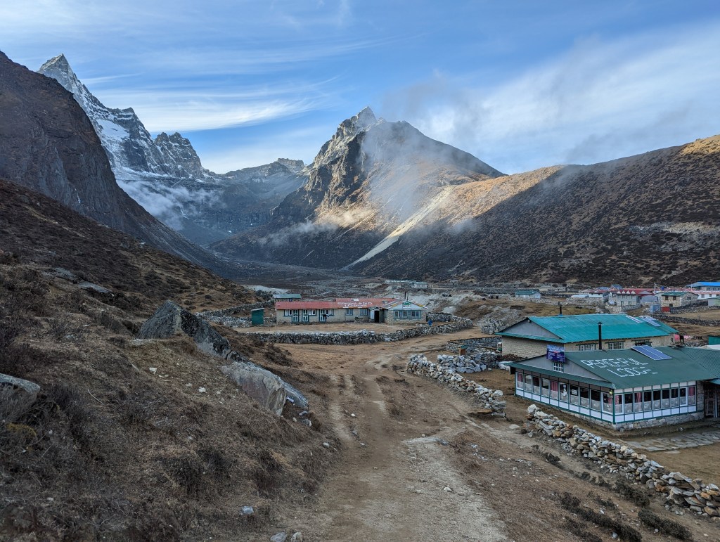 A fire is started in the stove and the fuel source is yak dung. The stove makes it smokey in the dining room and it pumps out so much heat that it becomes too hot. After playing a group card game dinner starts to arrive. My dinner is veggie chow mein but it comes with pasta sauce. The canned tomato smell hits my nose and I can’t eat it. I send it back and they make a new one. I think they must have had some left over spaghetti which they tried to convert to chow mein because the chow mein here is made with spaghetti noodles. Sue is feeling better by dinner time and comes into the dining room for some tea and tomato soup. The lady from the Netherlands is also feeling better and is happy to eat her whole dinner. We find out that Sue is going to take a helicopter back to Lukla in the morning. Her symptoms have improved slightly but she’s not feeling well enough to proceed higher. We sit around a bit after dinner before heading to bed by 8pm.