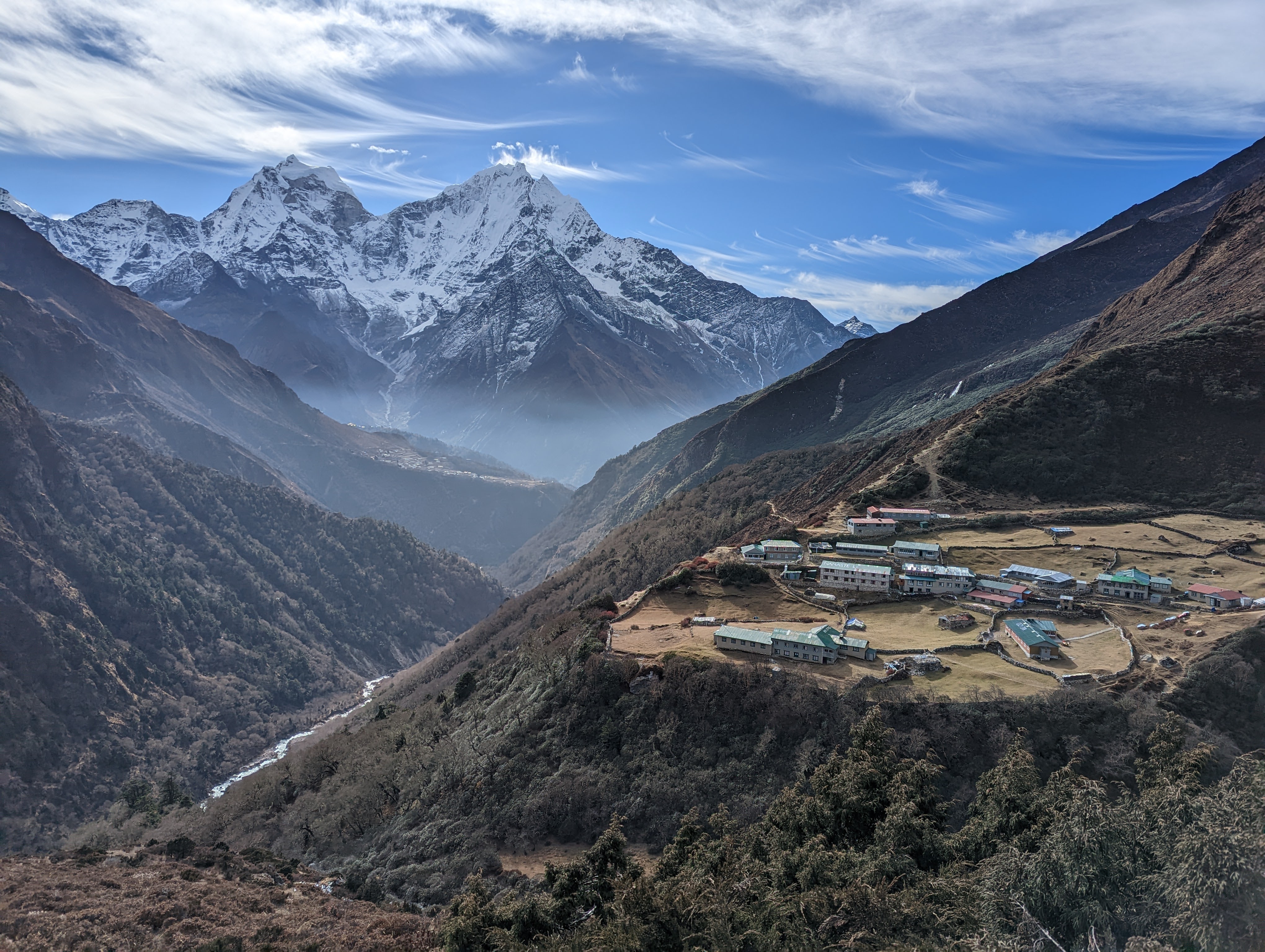 Veggie chow mein for lunch and then Caspar helps me wash my snotty handkerchief and pee rag. While Caspar and Clearance go looking for network, I write in my journal for a few hours in the dining room. A helicopter flies in and lands on the other side of the little creek. It leaves as quickly as it arrives. Silke chats with a lady who is also from the Netherlands, and finds out that she’s not doing well with the altitude. Her other group member has gone ahead and the guide has done nothing to help her. Silke enlists Sophie to see if she can help this lady. Once Caspar returns he also helps check the ladies vitals and gives her some medication for altitude sickness and pain. Our group member Sue had a really tough day and arrived at Machhermo hours after us. Sophie and Caspar check Sue’s pulse ox and help her with her altitude symptoms. The guides in general don’t seem to take an active roll in helping clients with their medical symptoms. No one has any oxygen either.