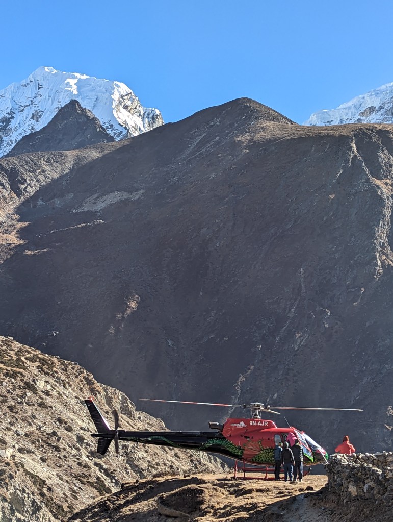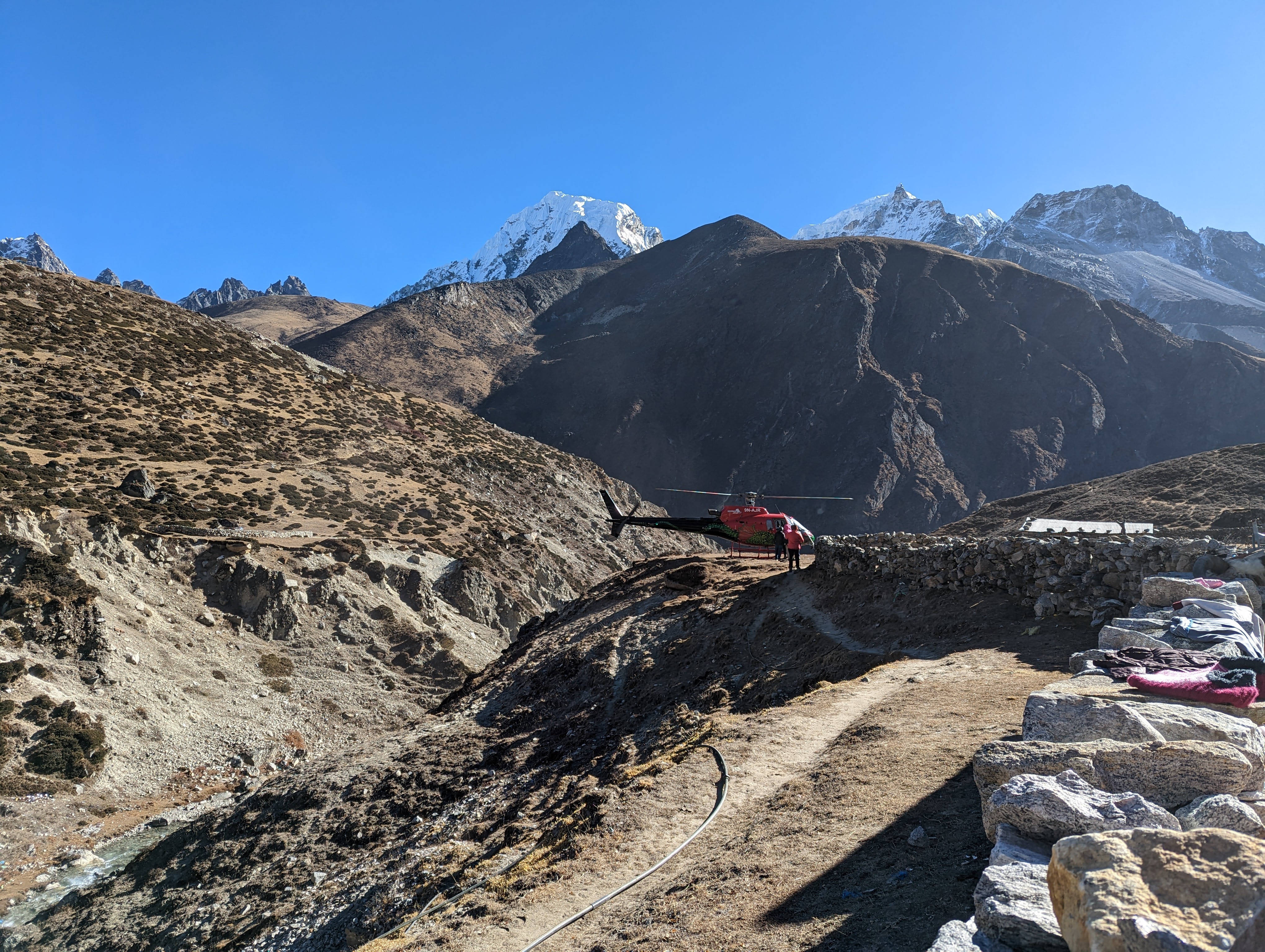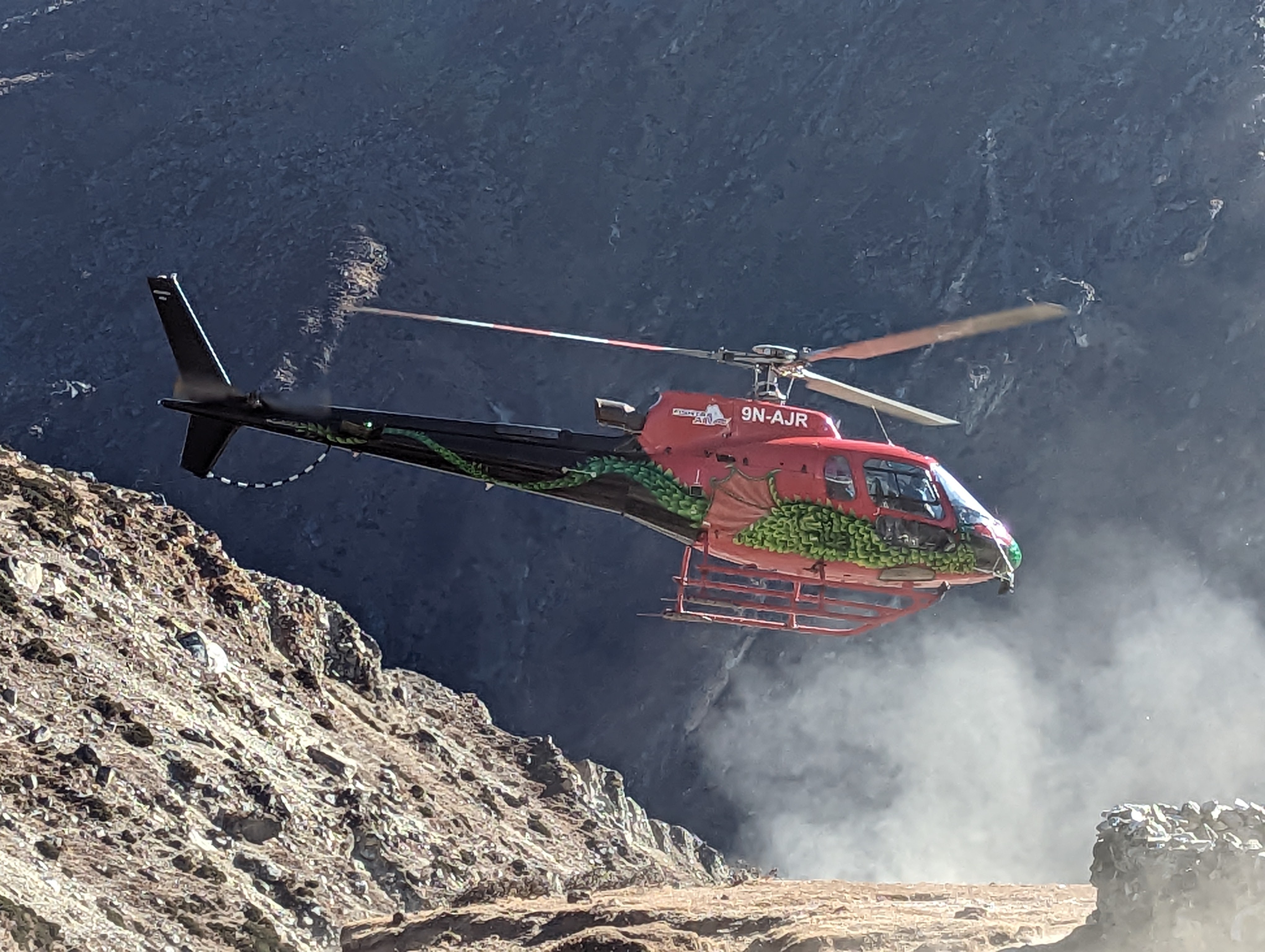 At 8:50am the helicopter comes whipping over the mountain and we launch into action. There’s no time for a group picture as Tiger, Bikram and Dipak quickly take Sue and her gear out to the chopper. The helicopter lands on the tiniest patch of dirt right on the ledge above the small creek. Within less than a minute after landing, Sue is loaded and gone. The dust swirls around us as we wave goodbye.