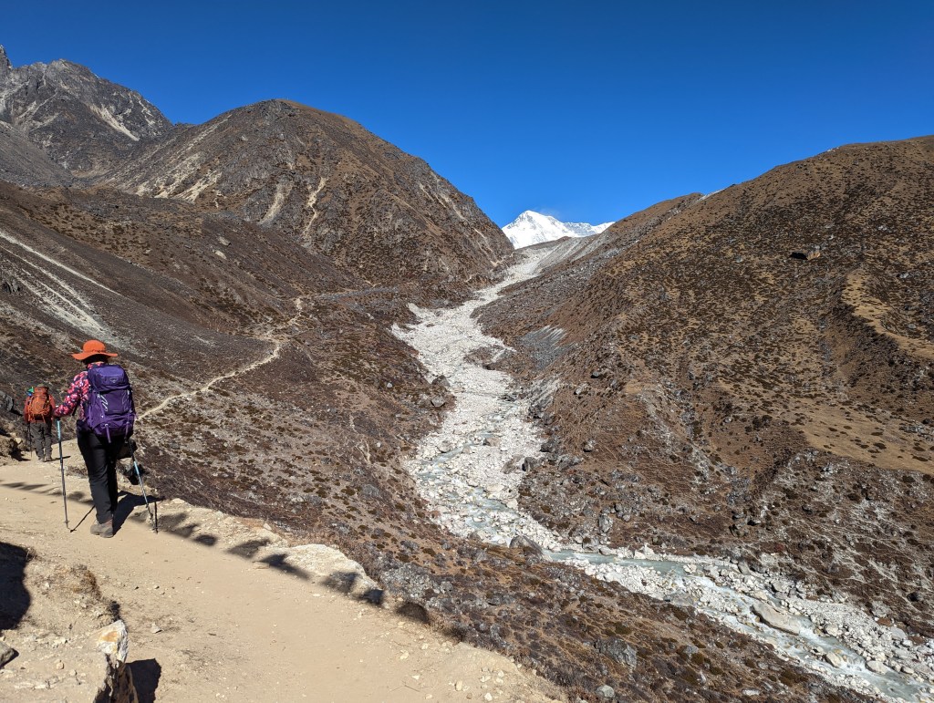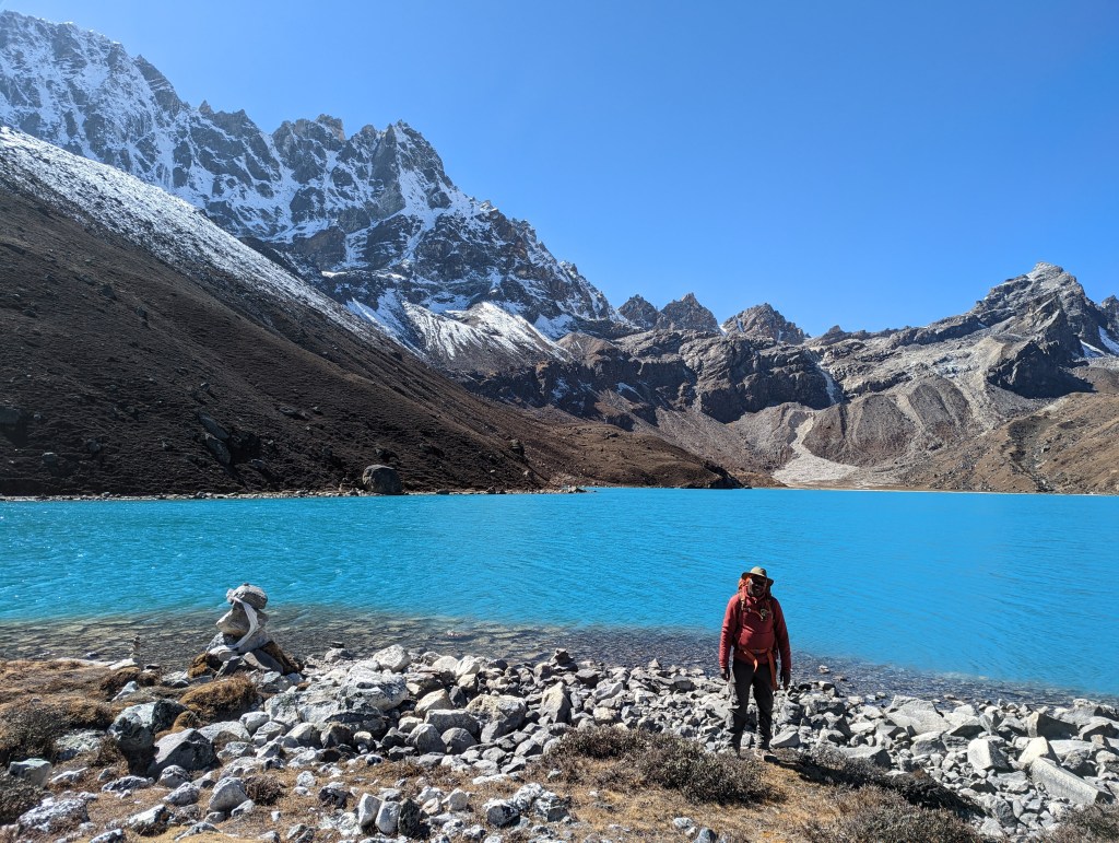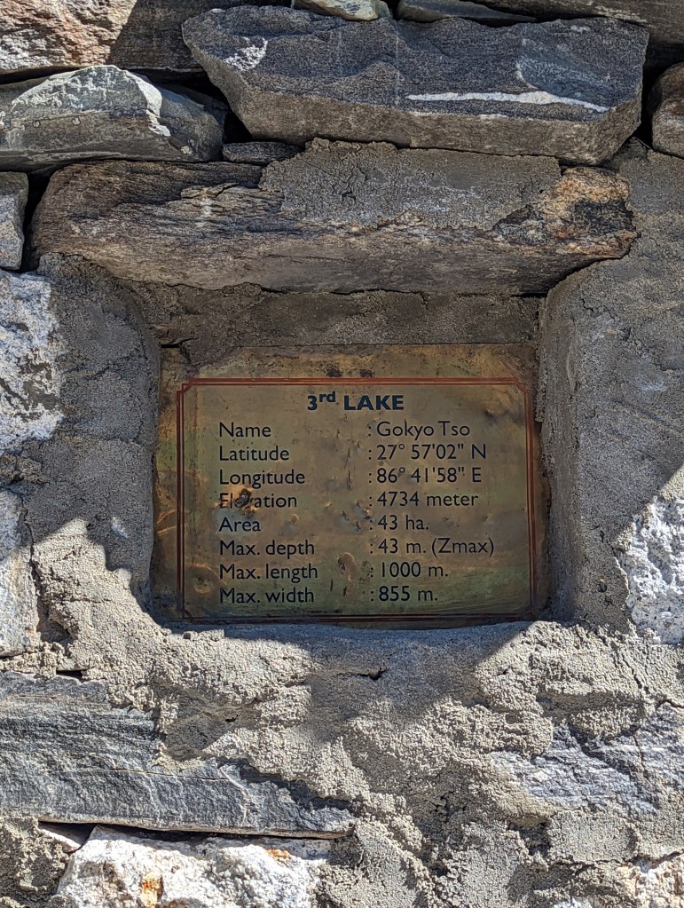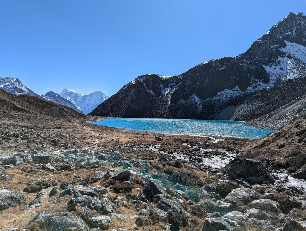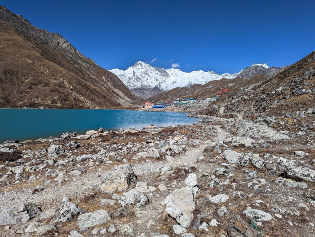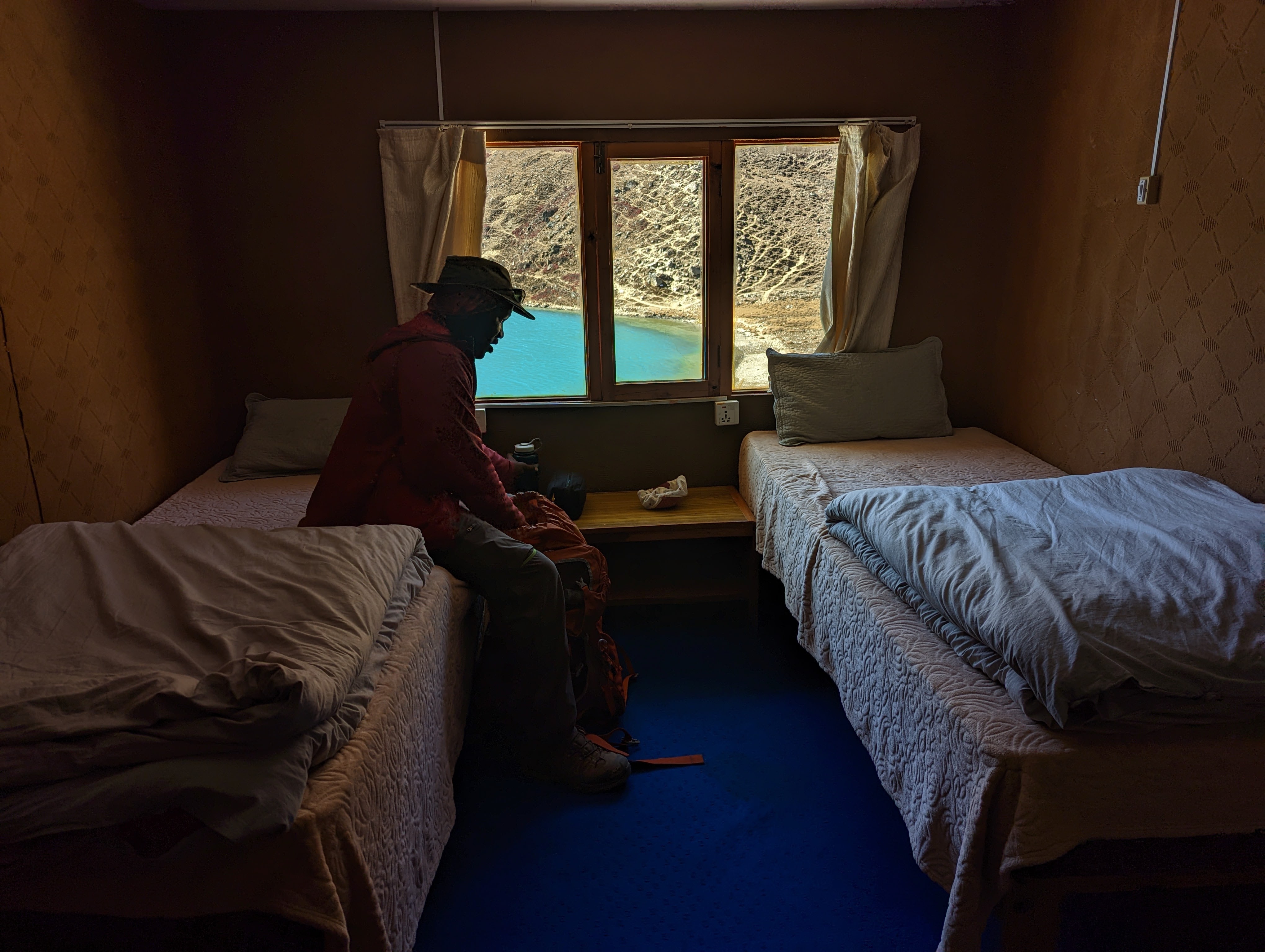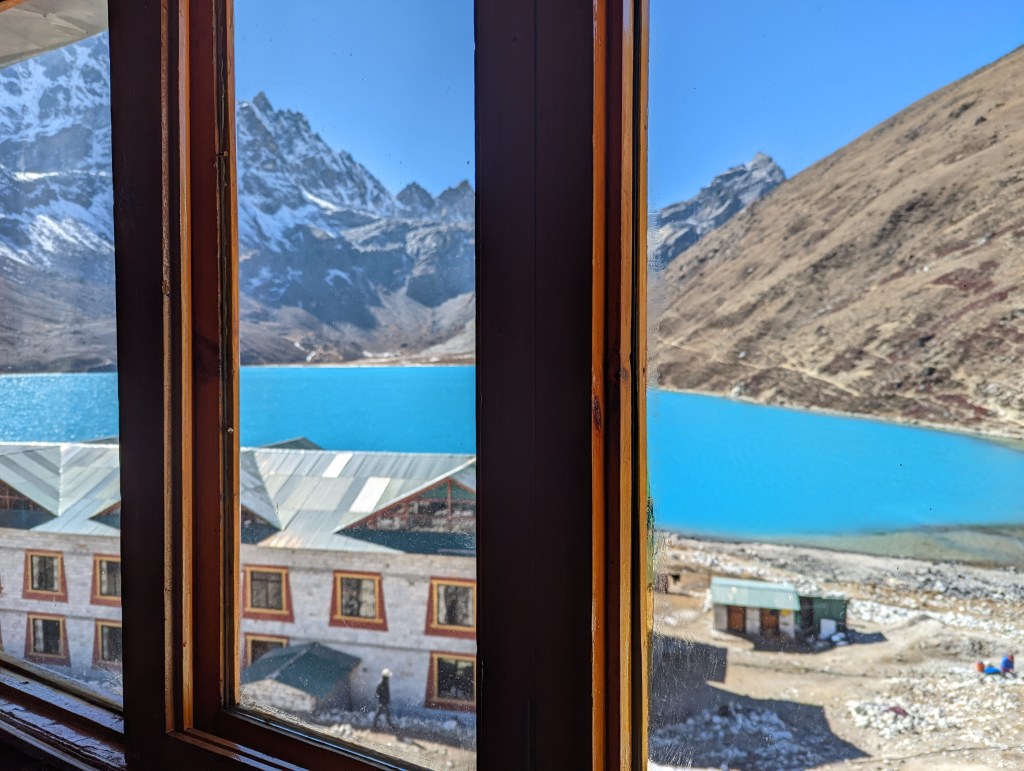 Against the backdrop of Cho Oyu, we arrive at Gokyo and Lake 3 just after noon. I can see the tiny trail ascending far above us up to Gokyo Ri. That’s for tomorrow! We have peach tea at the Fitz Roy Inn and Sophie challenges Clearance and Jeremy that if they jump in the lake she’ll pay for their charging the rest of the trip. I can see they’re thinking about but they don’t commit. Caspar and I go and check out our room which has a sweet view of the lake. There’s also an en suite bathroom with a shower (which might only have cold water), sit toilet, a sink with running water and charging outlets next to our beds. Wow! This is definitely the nicest room yet!