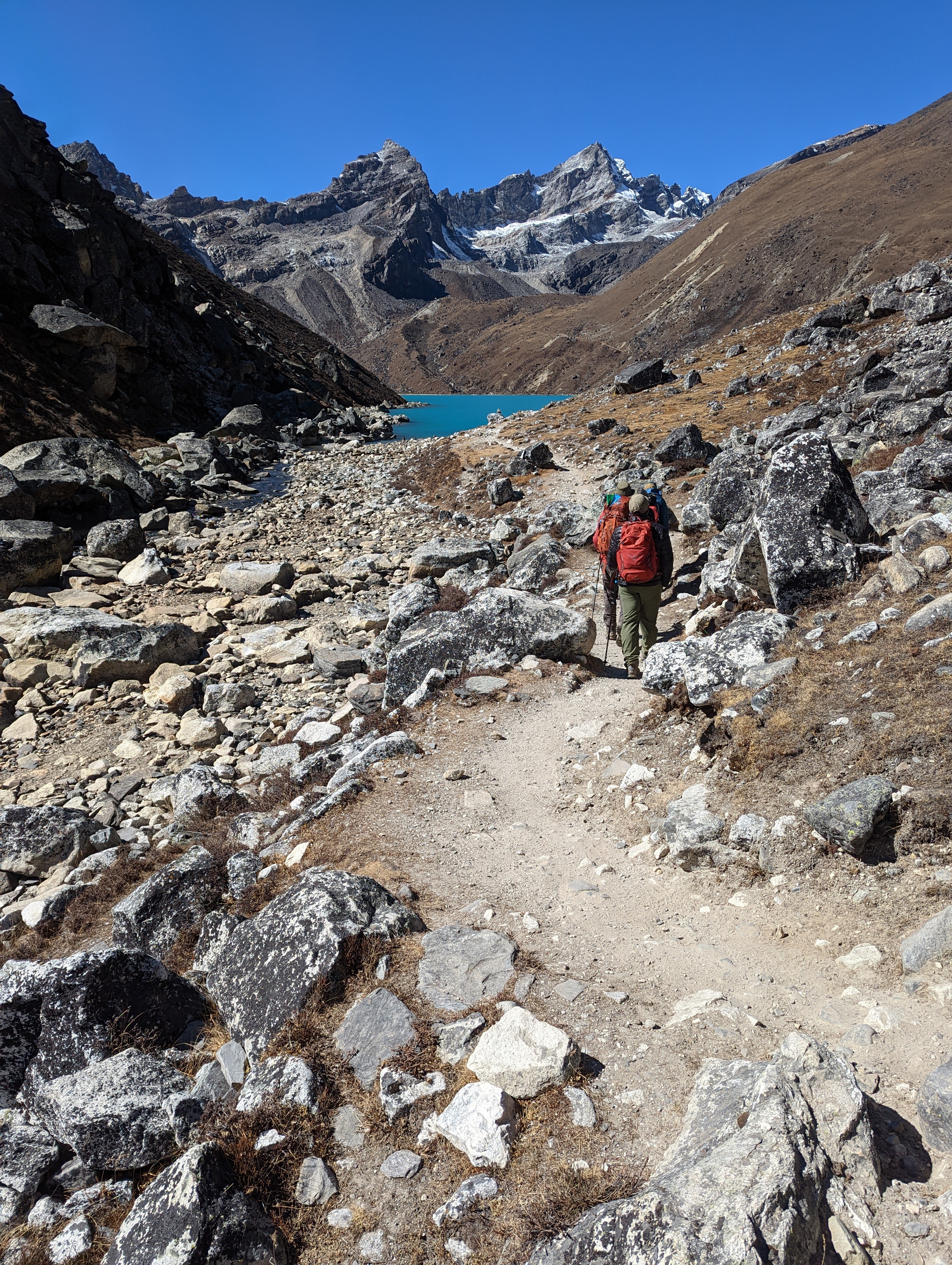 The climb is fairly gradual out of Machhermo until we ascend rock stairs to the first Gokyo lake. The wind is ripping through this little draw and when I can no longer take it, I stop and add gloves and a windbreaker layer to my core. The glacial brilliant blue lake shimmers in the wind as some oxen pass us. Since breakfast time I haven’t been feeling well. Lots of pressure in my stomach. I’m gassy and belchy and relieve myself any way possible. I can smell the foul odor of my breakfast bubbling up.