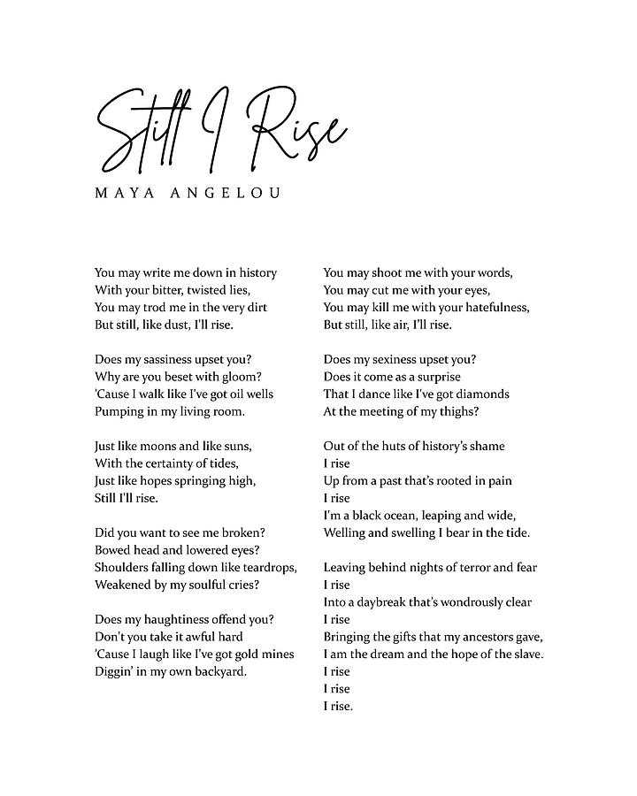 When I started thinking about the title of this journal I kept thinking of And Still I Rise. Then I remembered that Still I Rise is an amazing Maya Angelou poem. Watch Maya Angelou read Still I Rise