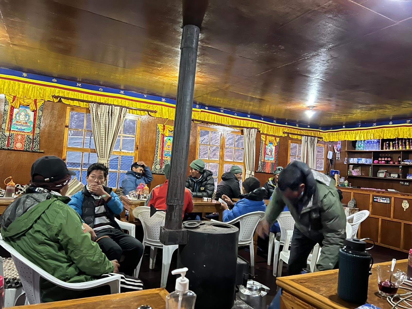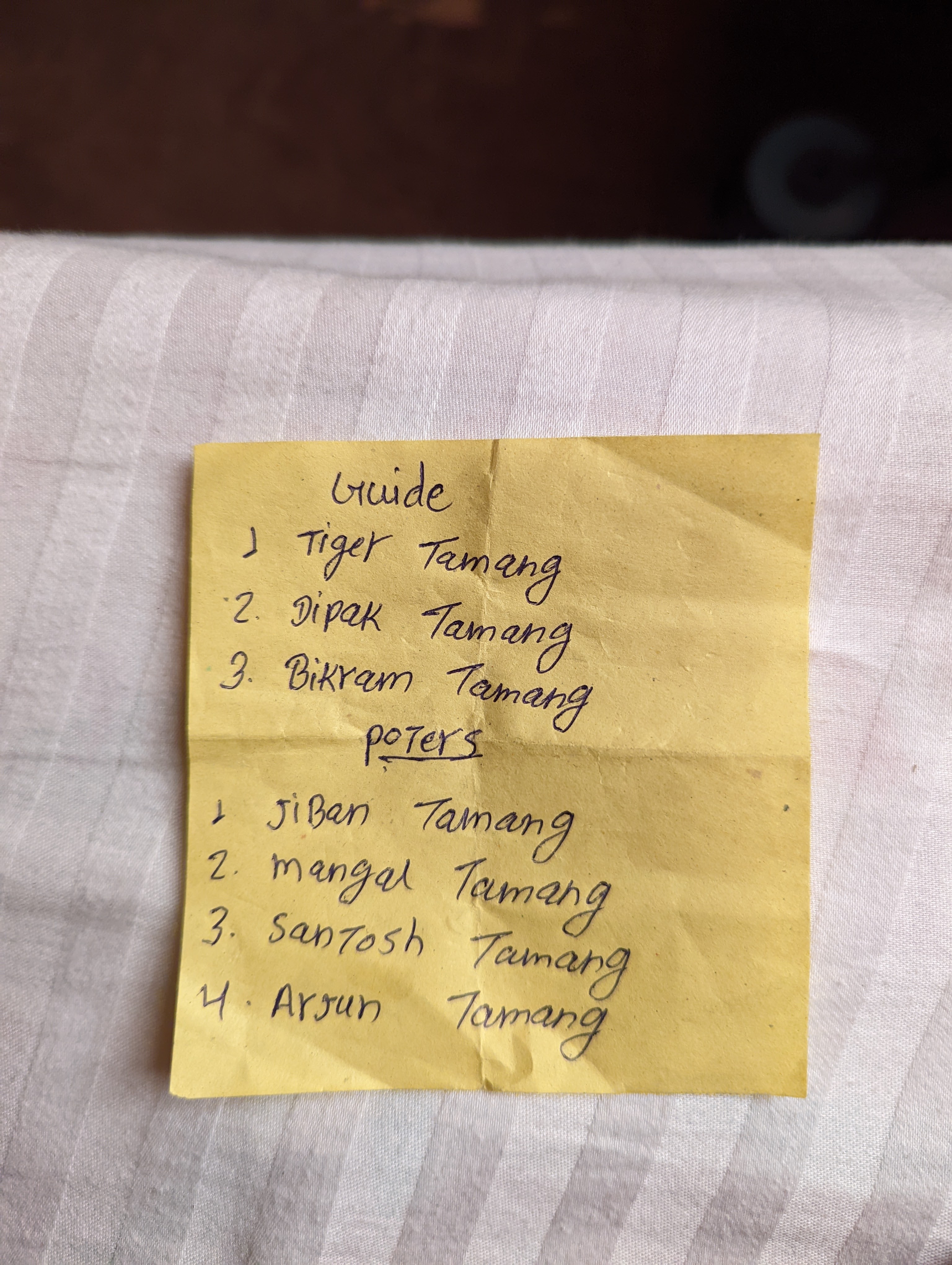 A visit to the bathrooms at the end of the hall yields two squat toilets, each with a 50 gallon drum of water for flushing. Fun! I am feeling well enough so Caspar and I return to the dining room and hang out with Jeremy and Silke. Clearance is there too but he is on his phone. We enjoy hot chocolate and biscuits. For dinner, I celebrate with a whole plate of boiled potatoes. Damn, this is way better than bread! For days, I have been asking Tiger for a written list of the porter and guide names. With pride, he delivers a tiny piece of paper with everyone’s name on it. I’m surprised to learn that they are all from the same village which is about a one to two day hike down from Lukla. The name Tamang is an ethnic group and caste. As our hiking group chats after dinner, I see Sophie come into the dining room and make a beeline straight for Tiger. Even with my stellar hearing, all I can hear is she, she, she, she, she. As guides and porters huddle around the warmth of the yak dung-fueled stove, Sophie exits stage left.