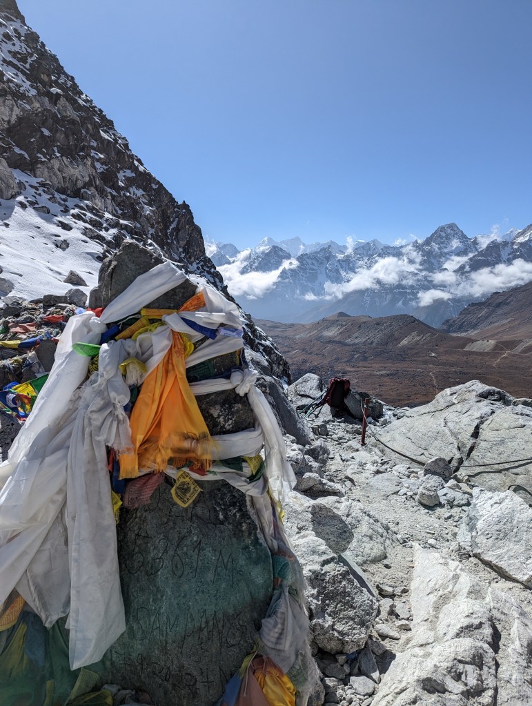 Since the return of the sun, I have been using my liner gloves and my trekking poles. My hooded sun shirt reaches over my trucker hat, pulling it down into the sweat on my brow. In a practically involuntary motion, I constantly push my hat up against the pull of my sun shirt. Because my only job is to keep moving my feet, I don’t take any pictures on the approach to Cho La Pass. Check out this BLOG for some great shots of the western approach to Cho La Pass.