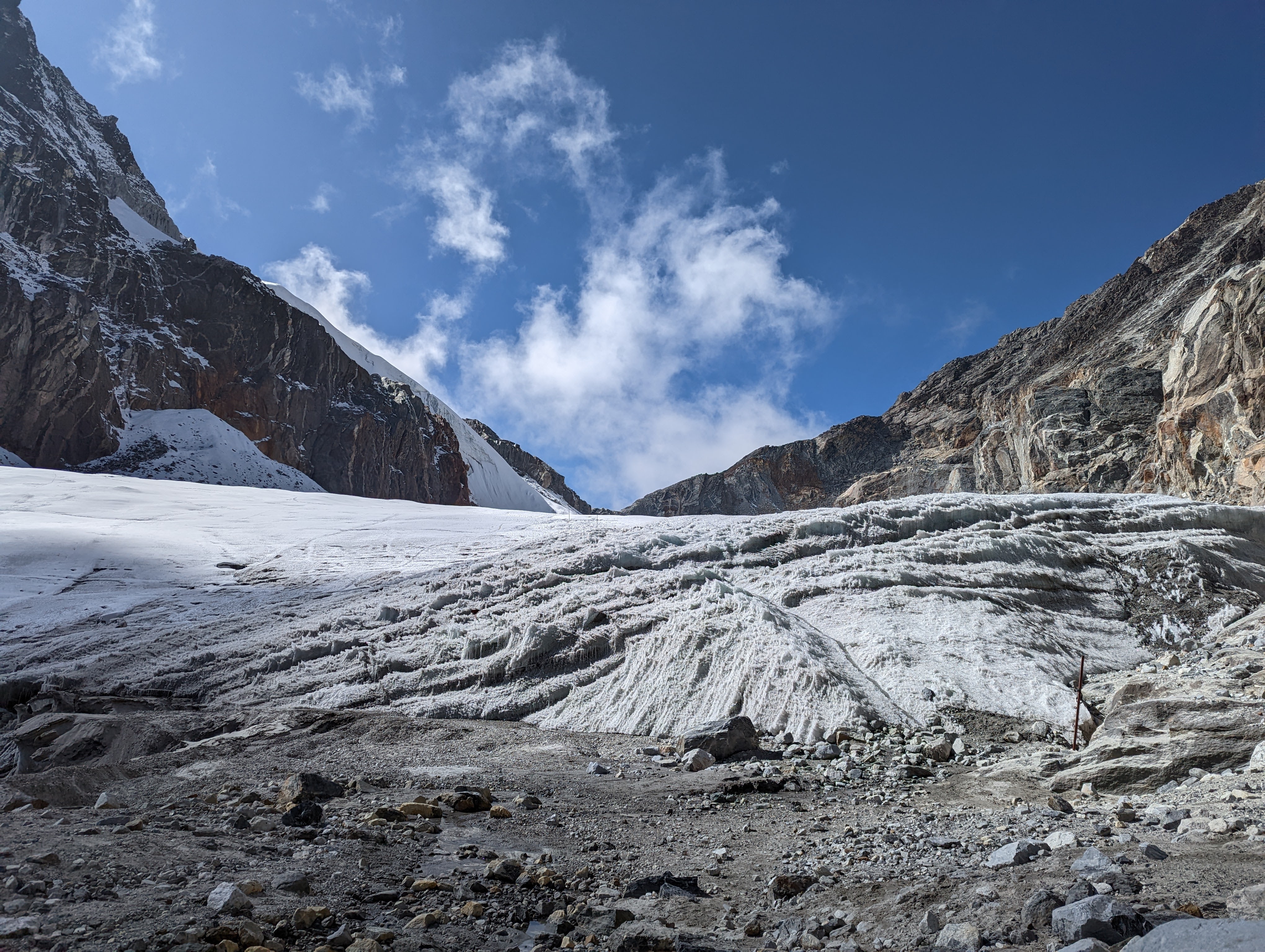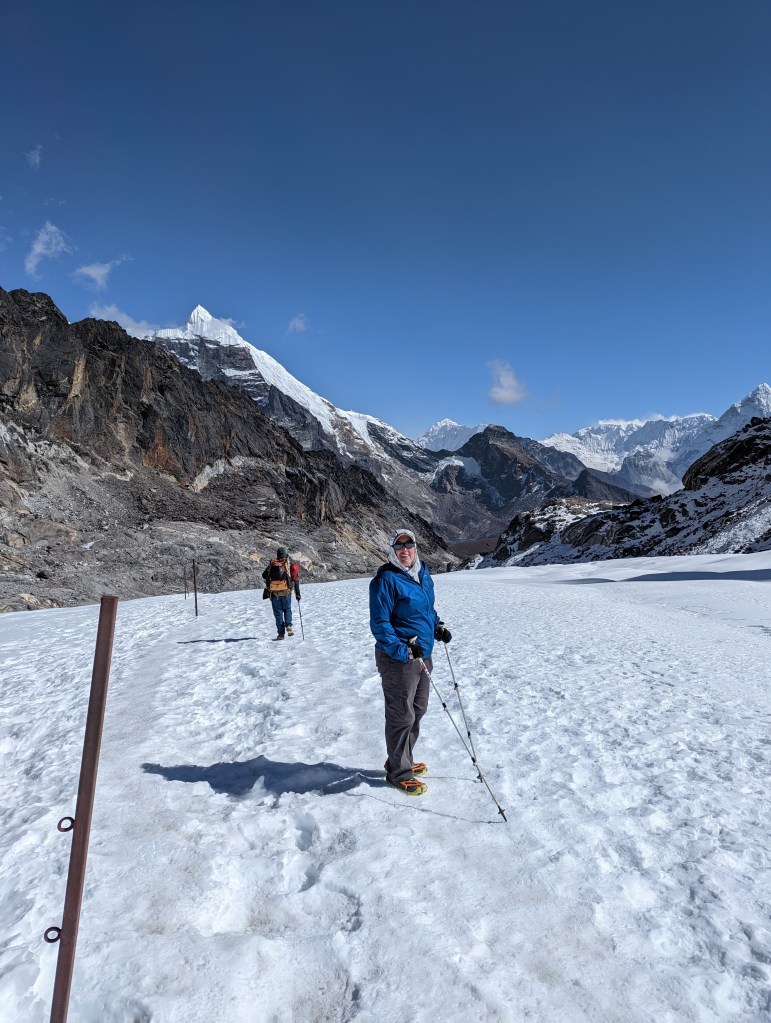 We drop off the edge of the pass and scramble down a churned path. Once we reach the perimeter of the Cho La glacier, we are given microspikes to wear. Hiker 4 wheel drive! It takes a couple steps to test them and trust that they will hold me upright on the ice. We easily trot across the glacier and it’s a trip for me to see my backpack on the back of Bikram. Of course, guides Bikram and Tiger go without any spikes. Check out this Video!