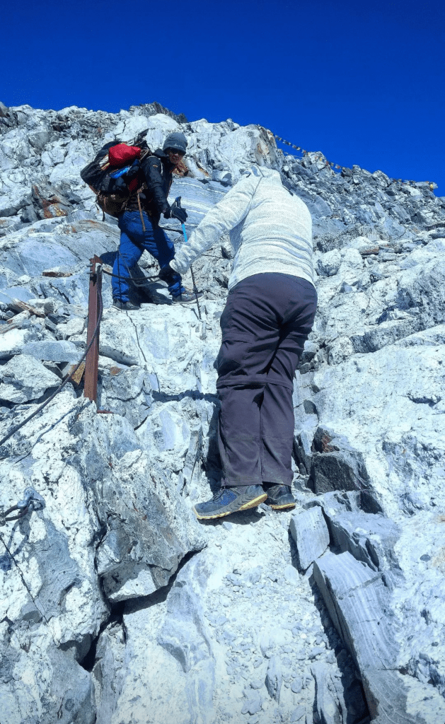 At the base of the rock wall I crank my head upwards. Wow! Just ahead of us there is a lady wearing a long pink jacket and her guide is assisting her. I put my head back down and follow every step that Bikram makes. When he grabs the cables, I do the same, When he transfers his poles from one hand to another to grab the cables, I do the same. When he stops for a break, I do the same. I just keep my head down and focus on the simple task of one foot in front of the next. It gets extra challenging when we meet people coming down and we have to take turns using the cable. Sometimes people skid and slide almost uncontrollably on the unconsolidated scree. CHECK out this ONE VIDEO from our climb! If you watch closely, you can see the lady in the long pink jacket at the edge of the video. At one point, we stop because we hear some people coming up behind us. You can imagine that there’s not a lot of room to pass on this steep rocky slope. But the French-speaking couple pushes by nonetheless. I face the rocky slope as they pass behind me. The woman has the audacity to put her hand on my back in order to assist her push past me. WTF?! I mutter a what the hell?! to myself and then a more audible geeze. I laugh out loud at these crazy people.
