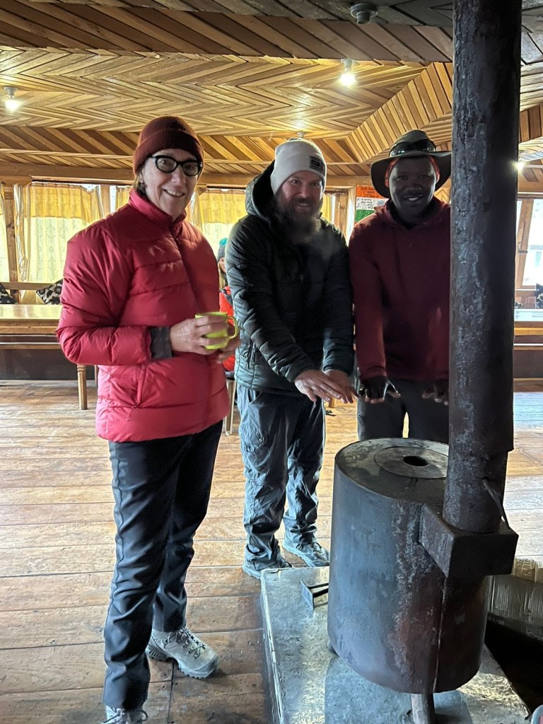 After a plain omelet breakfast, I head back to the room for my final preparations. As I exit the dining hall the young woman who’s been looking distressed for days, is audibly wheezing. OMG, like really loud! I collect my backpack and step out of our room just in time to watch a helicopter come flying into the valley. The young woman and her gear is escorted by her guides and our guides all the way across the village to the helipad. As usual, the helicopter leaves as quickly as it arrived. Watch a series of videos 1HERE, 2HERE and 3HERE. As our departure time comes and goes, we huddle around the dining room stove hoping the warmth will seep into our frozen bodies. I bounce on my toes trying to bring the feeling back into them. We pack up our to-go lunches just before we march out around 7:30am into the piercing morning. I stow my poles and start with my hands in my pockets and definitely don’t take off my down jacket.