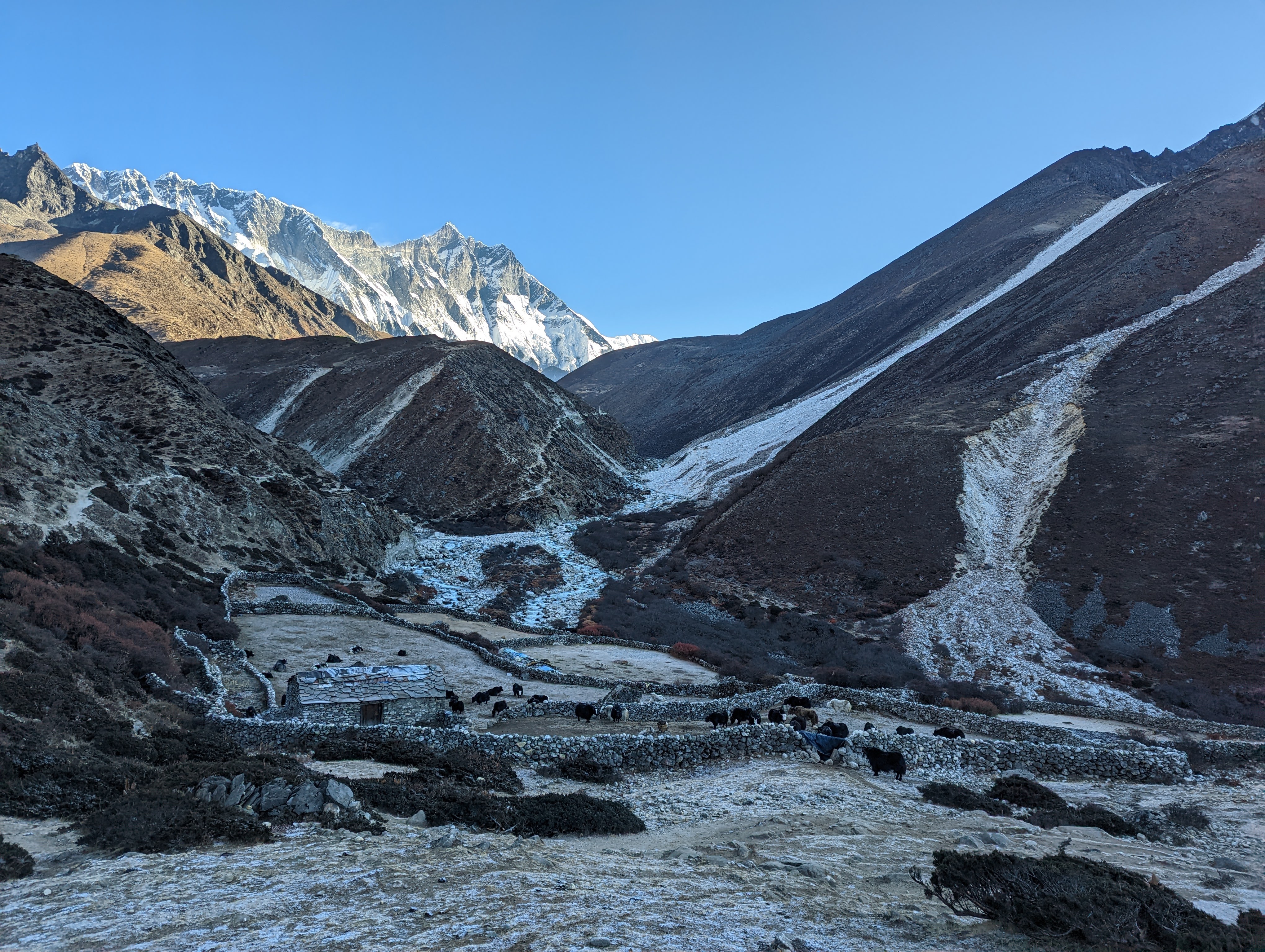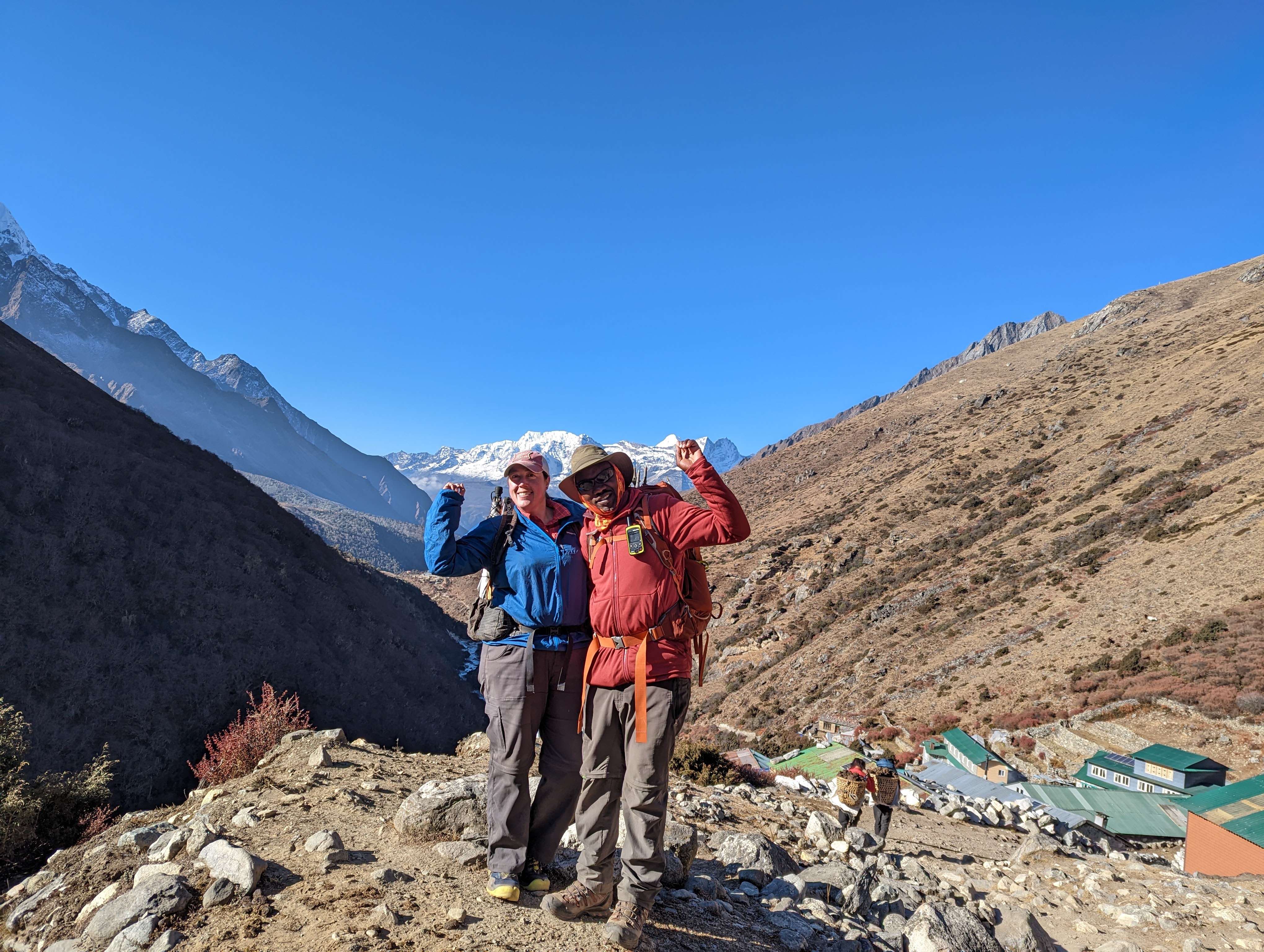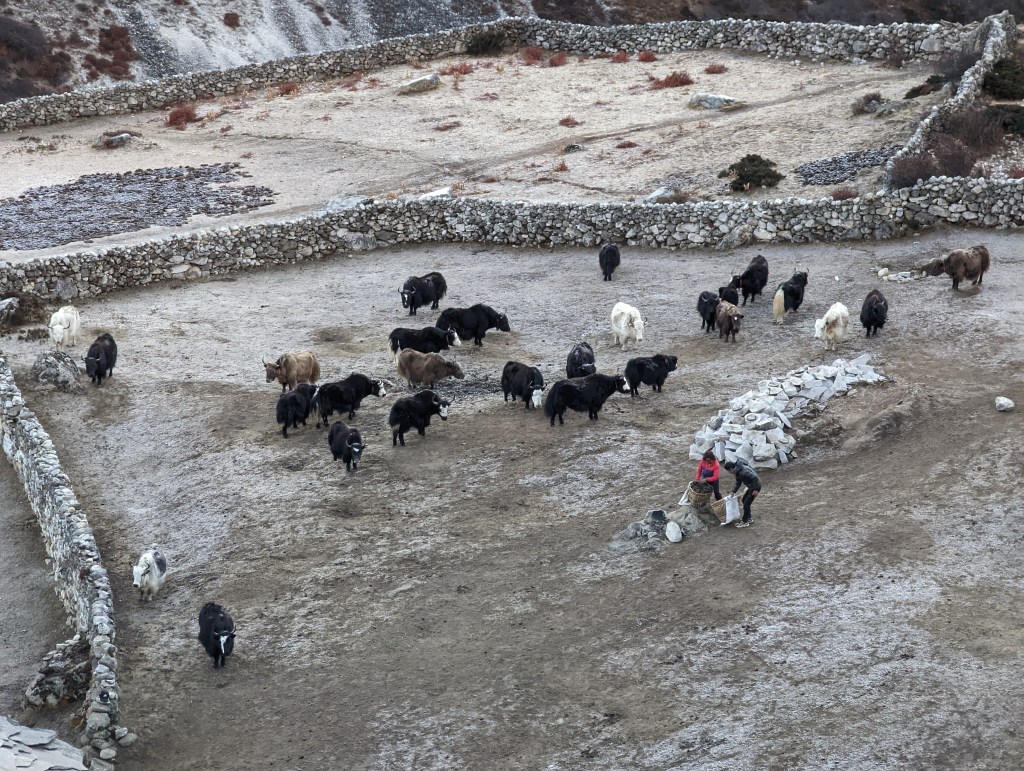 Last night I was all tucked in and asleep by 7:40pm. But descending deep into this valley has its consequences. All that pristine, cold, dense Himalayan air has settled in at Pheriche and it feels like our coldest night of the whole trip. Over and over I wake up terrified because I keep dreaming that I’m freezing to death like they did in the Everest movie we watched yesterday afternoon. My sleep data shows that I got a lot of deep sleep, but it hasn’t put a dent in how exhausted I feel. It’s so cold that the flush water freezes in our bathroom. The tub of water over the sink for hand washing is frozen solid. In the morning, the bitter cold makes it hard to focus on dressing and packing efficiently. I have to stop every 30 seconds to warm my hands in my pockets. Our porters seem unfazed by the cold as they efficiently pack their loads for the day outside of our rooms.