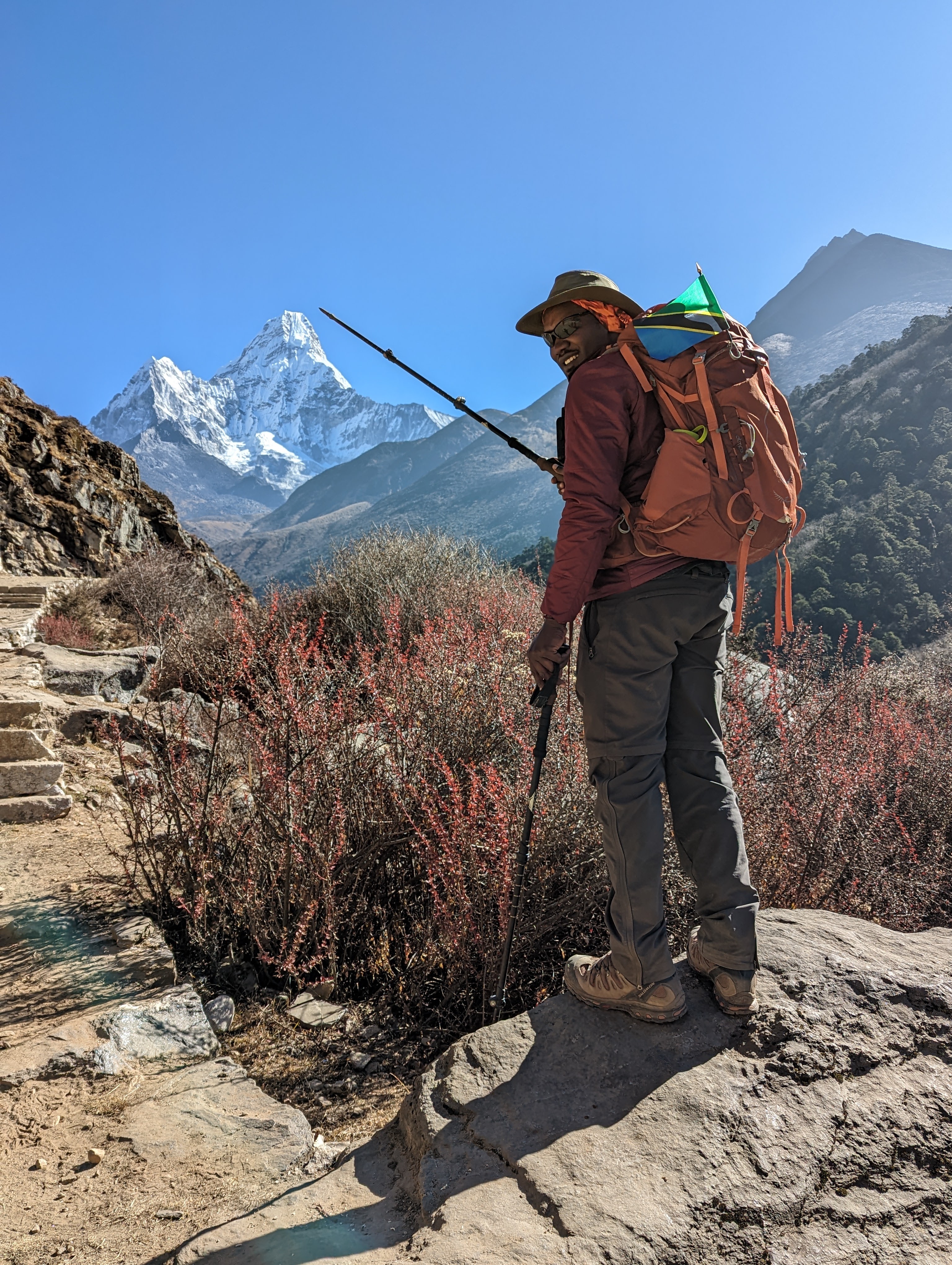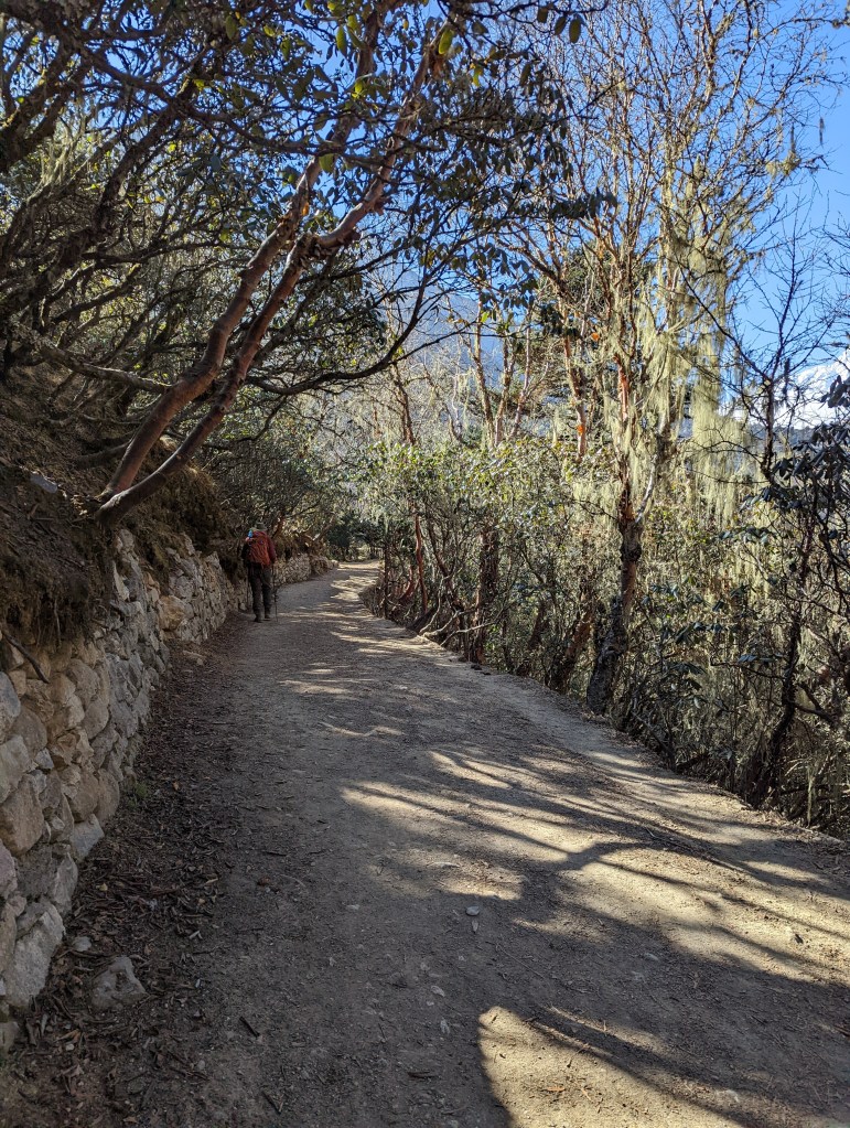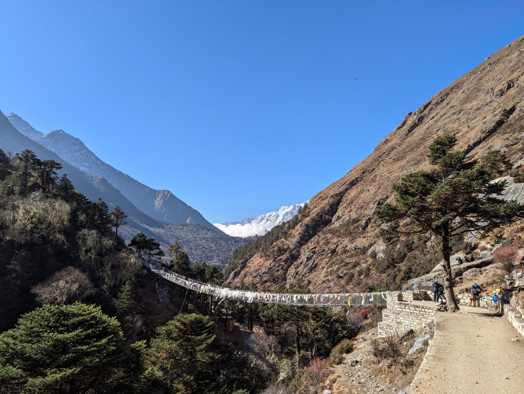 We follow the switchbacking trail down the valley and I’m grateful to be out of the hot sun and back in the shade of the forest. You all know that what goes down must go back up (check out the elevation profile with my pulse ox data below). We descend all the way back down to the Dudh Koshi River and cross a suspension bridge to the other side. Luckily the forest is still thick enough to provide shade as I slowly climb upward. I feel lightheaded and exhausted and move at a dreadfully slow pace. Caspar and Bikram stick with me as we joke about things that I can no longer remember. I may be slow but at least I keep moving. Not too long before we stop for lunch, we pass the trail we took nine days ago (Day 4) towards Gokyo. We are officially back on trail that we’ve hiked before.