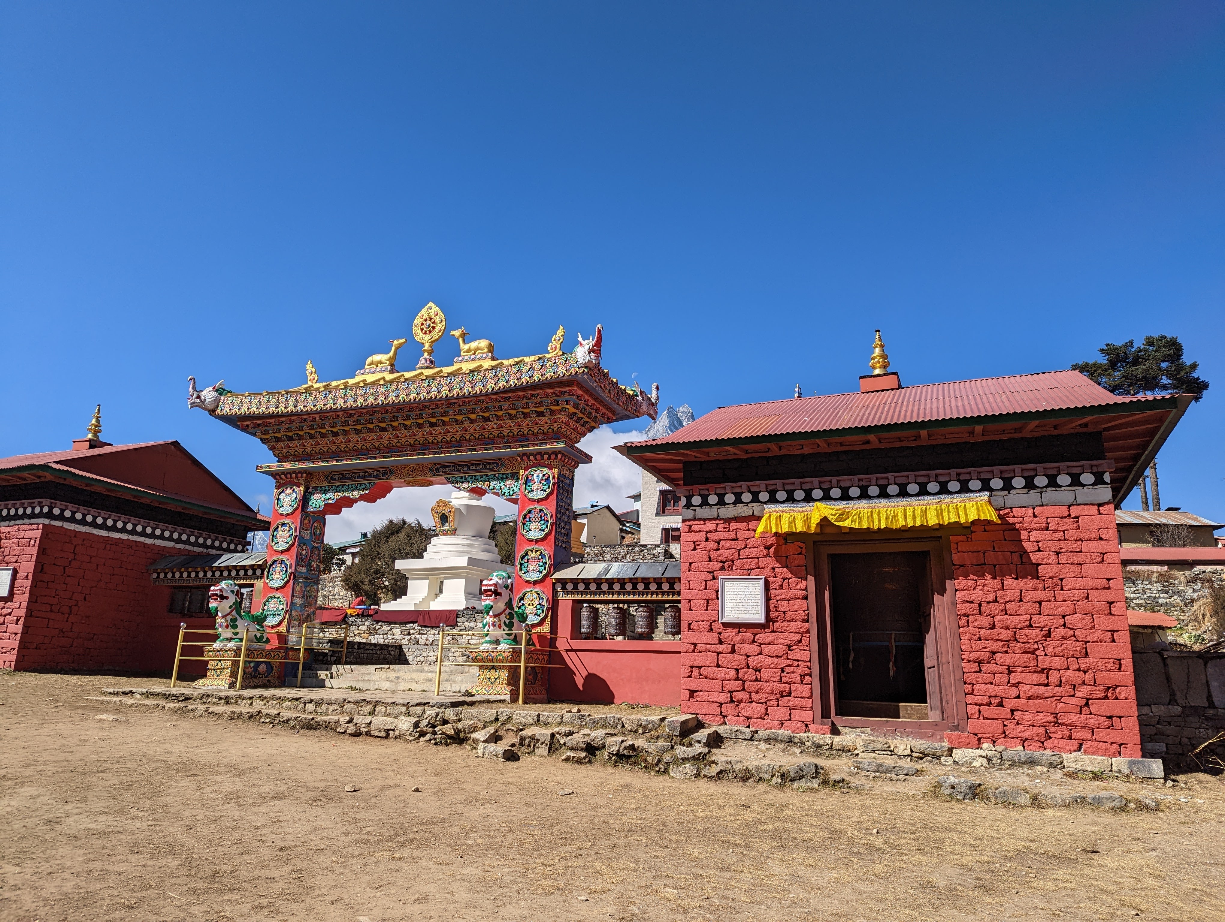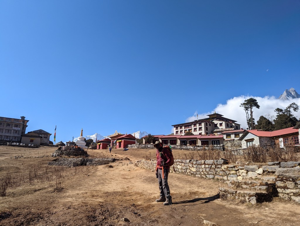 Bikram teaches me that the wheels I’ve seen being turned by water are for prayers. The water touched by the wheels is believed to become blessed and can purify and remove negative karma from what ever it then touches. Watch the VIDEO HERE. I saw big wheels like this in Namche Bazaar but thought it was for creating energy. Just after passing through Pangboche we cross a large suspension bridge over the Imja Khola River, which is a tributary to the Dudh Koshi. The chill returns as the trail meanders slightly uphill through a shady forest. We pass the Deboche Nunnery before climbing steeply to Tengboche. It seems like I should be able to move faster and with more ease given the lower elevation. But I slowly drag my weary body up to Tengboche where I happily take a break in the sun. I take my morning calcium and eat some trail mix hoping this will give me an energy boost. Near the end of my break, Silke and Tiger arrive and Silke announces that she’s on vacation and will be staying for lunch at Tengboche. The Tengboche Monastery, also known as Dawa Choling Gompa, is the largest monastery in the Khumbu Region. It is a UNESCO World Heritage Site and is the terminus of the “Sacred Sites Trail Project.”