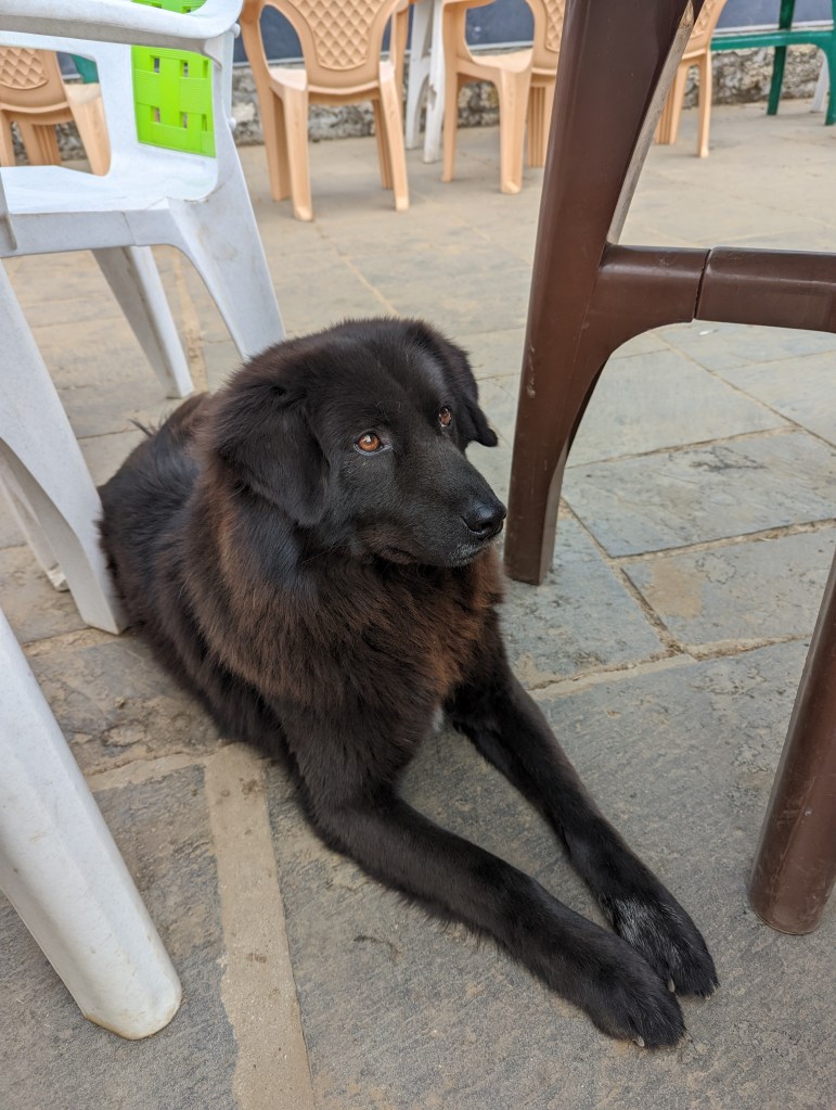 By 1:30pm we stop at Ama Dablam View Lodge for some tea and our packed lunches. I give my lunch to Bikram because I don’t like hard boiled eggs and I’m sticking with my trail mix lunch. Bikram shares some Tibetan bread with the pictured dog and soon there are several more dogs looking for some lunch. A quick trip to the toilet and then we are on our way, making one last push to Namche Bazaar.