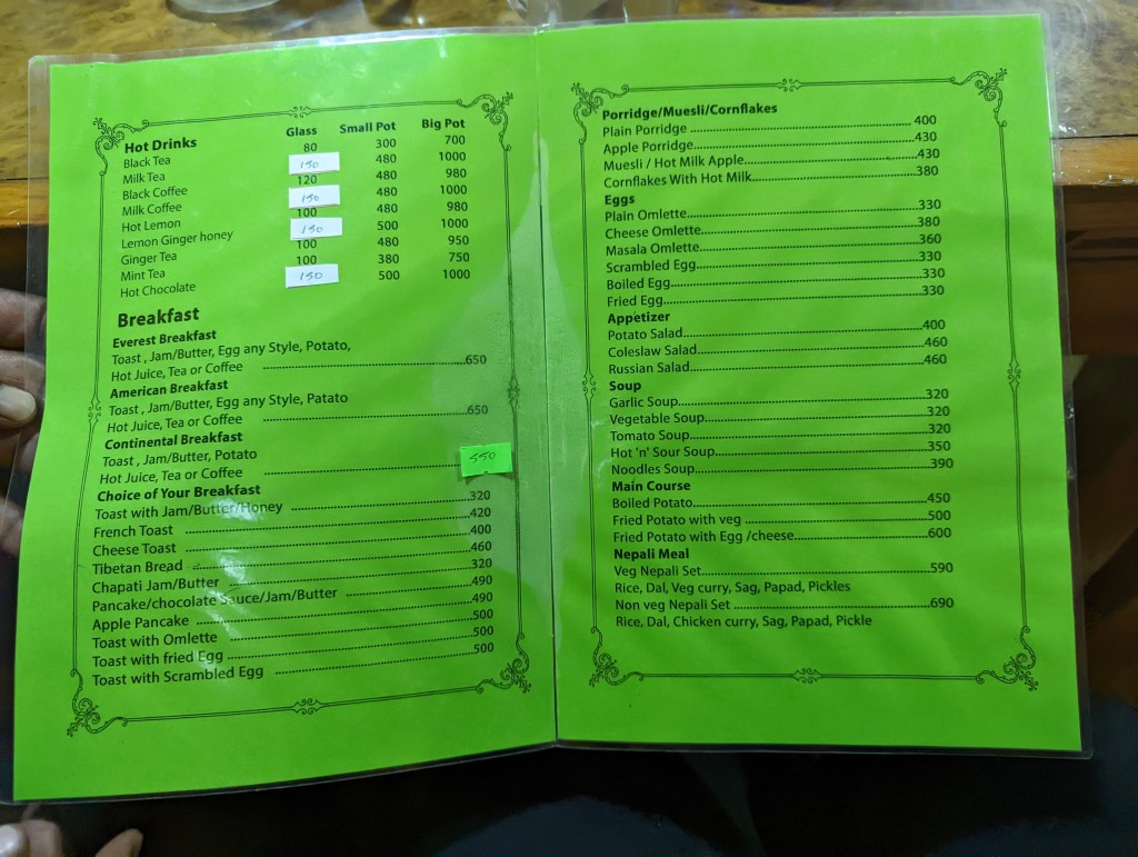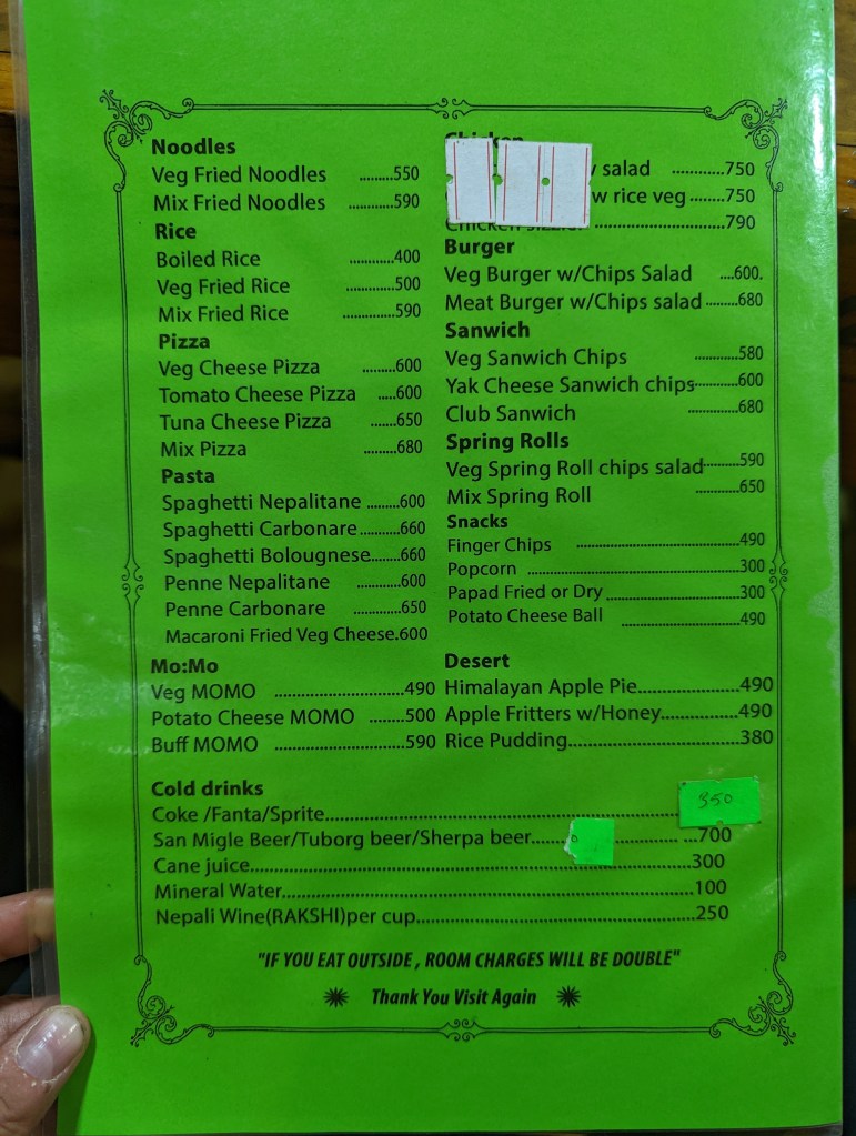 Caspar and I return to the dining room to visit with Susan and find her sitting with Sophie. We ask them to move to a larger table so that we can sit with them. Sophie says she is not moving so Caspar and I go to another table and spend some time looking through pictures. Being back in Namche means my NCell sim card is working so I send pictures to Caspar’s phone. Caspar gets up to grab something from the room and I can hear Sophie ask him why he’s being antisocial. After he points out the obvious, Sophie and Susan move over and sit with us. I chat with Susan about her time in Lukla and I tell her how I almost came and joined her. My stomach is screaming for dinner so Jeremy and Clearance’s late arrival is a test of patience.