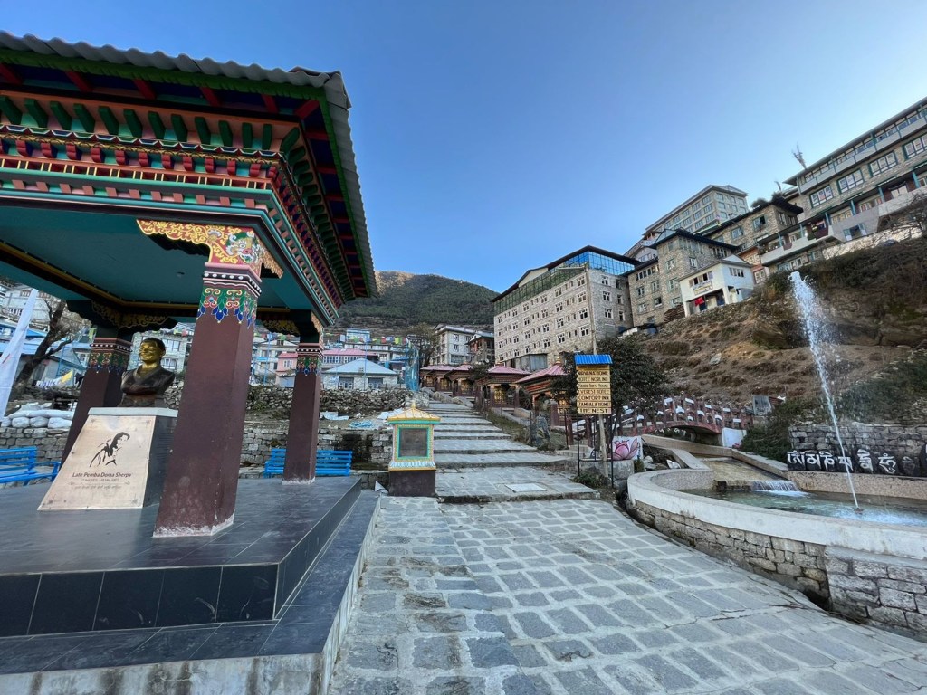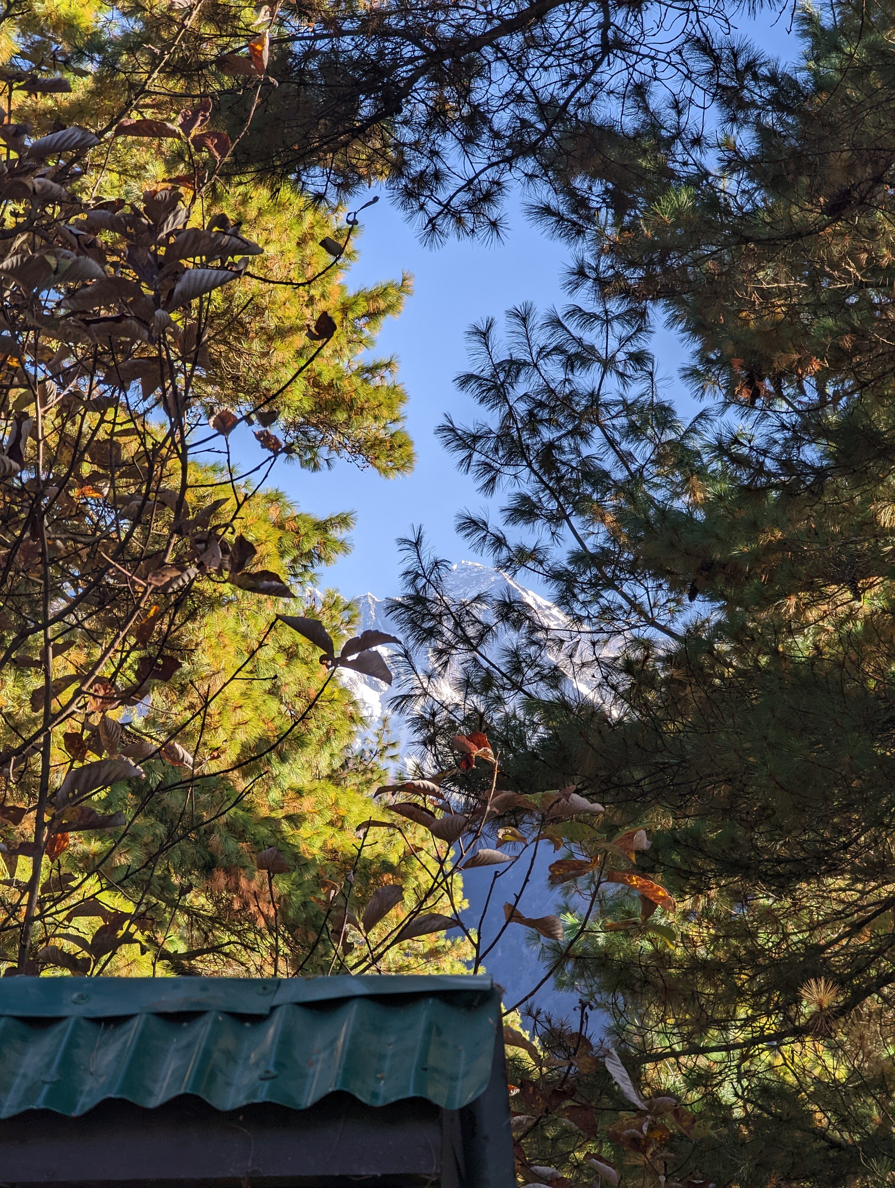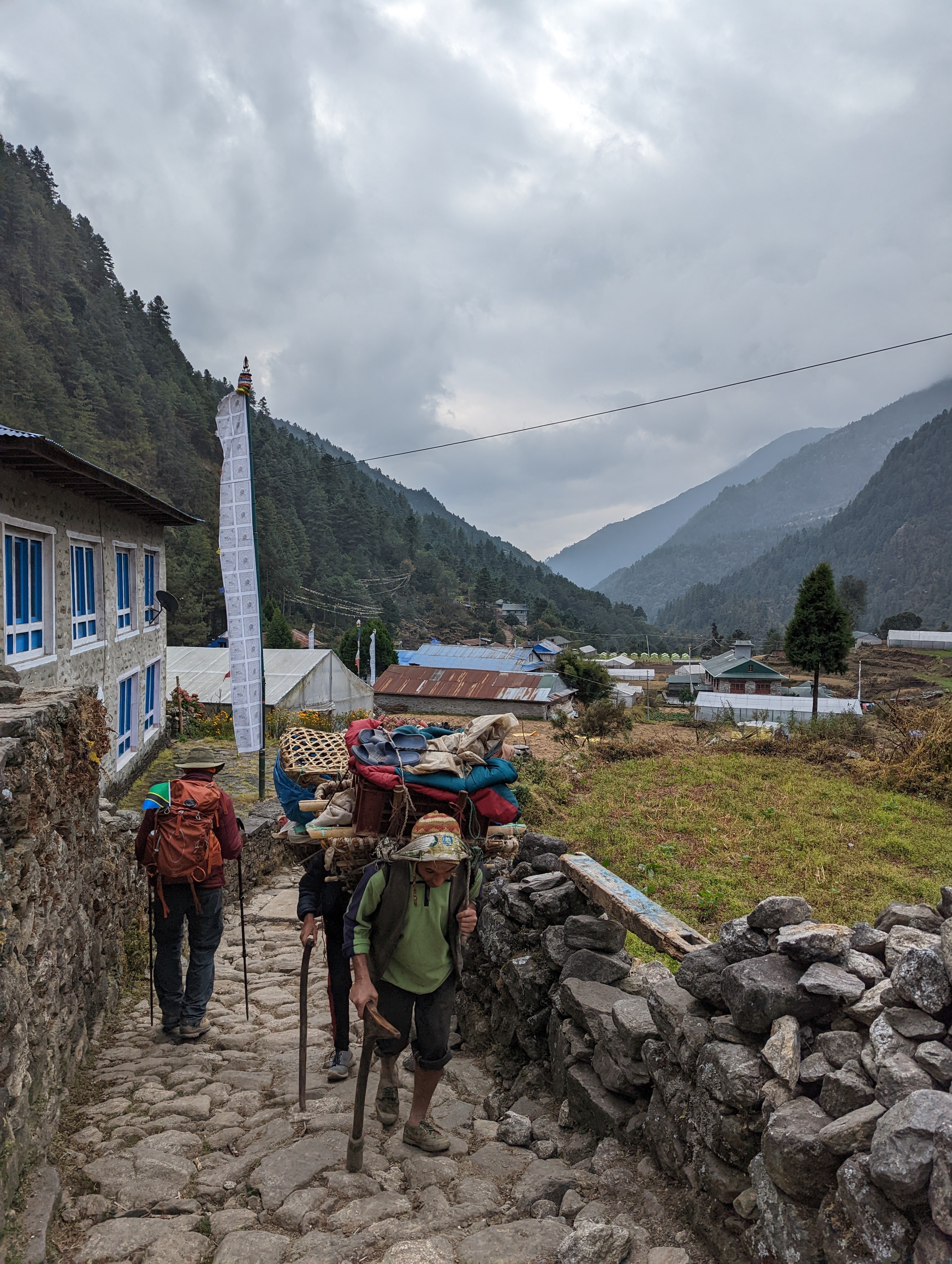 After the coldness of the past weeks, Namche Bazaar doesn’t feel that cold anymore. It’s almost in the realm of comfortable. Almost. We’re up by 5:30am for a long day of hiking back to Lukla. After a whole group photo in the Hotel Everest dining room, we bid farewell to Namche and immediately start the long descent. You might remember the climb up this section from Day 2: Ascend The Rock Stairs To Namche. We pause for one last look at Everest before scrambling down to the high Hillary Suspension Bridge.