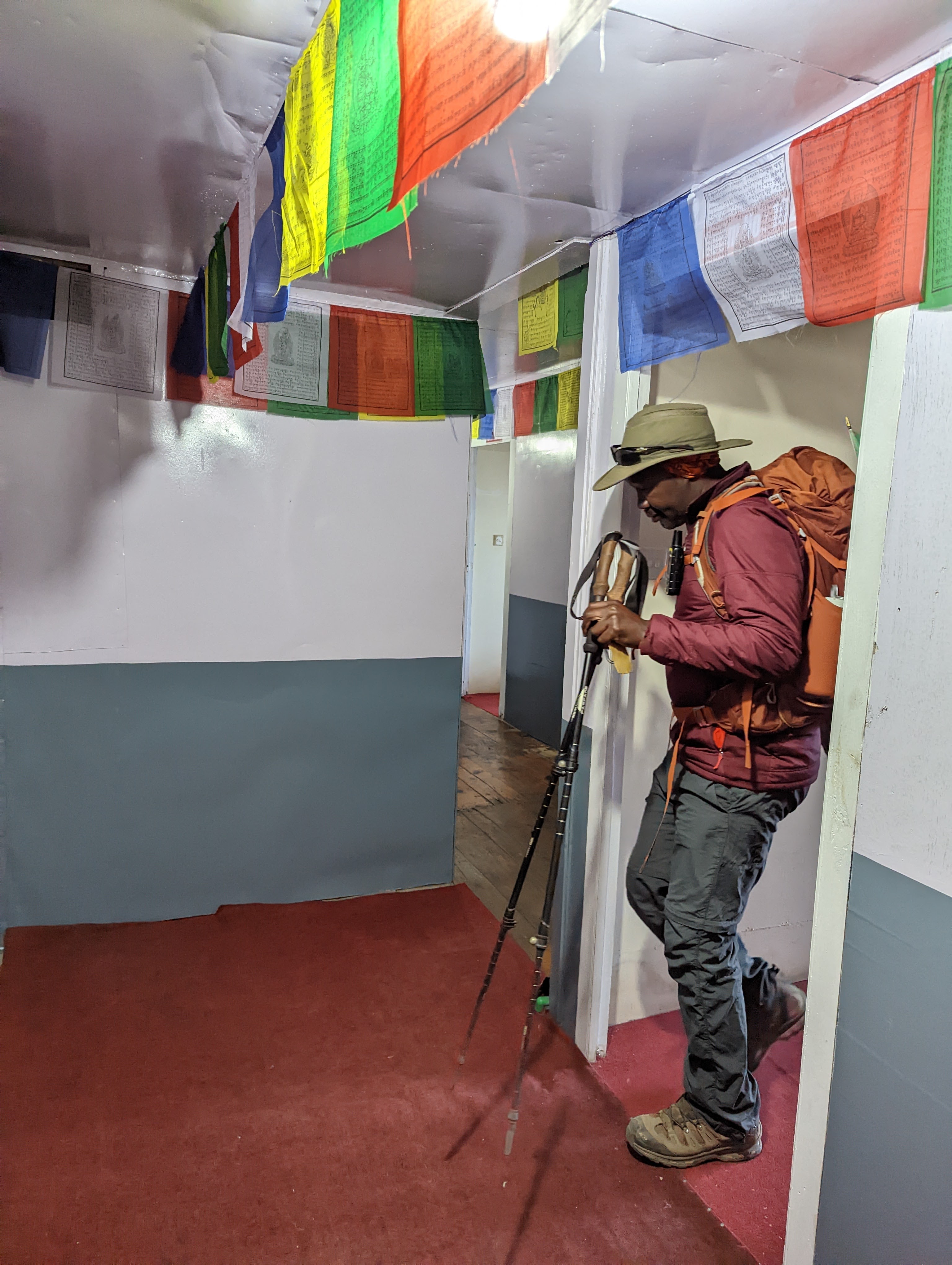 I roll into Lukla feeling a bit chilled. Caspar and I drop our backpacks in our room at the Paradise Lodge and Restaurant. I throw on my down jacket and Caspar and I head out to look around the Lukla shops. I find a wool beanie embroidered with Cho La Pass and buy it for 300 rupees (just over $2 USD). Back at the lodge, Caspar tries out the shower but it’s only freezing cold water. I decide to skip that torture and change into my evening lounge clothes. We go to the dining room to hang out and get Sherpa Brewing beer on tap.