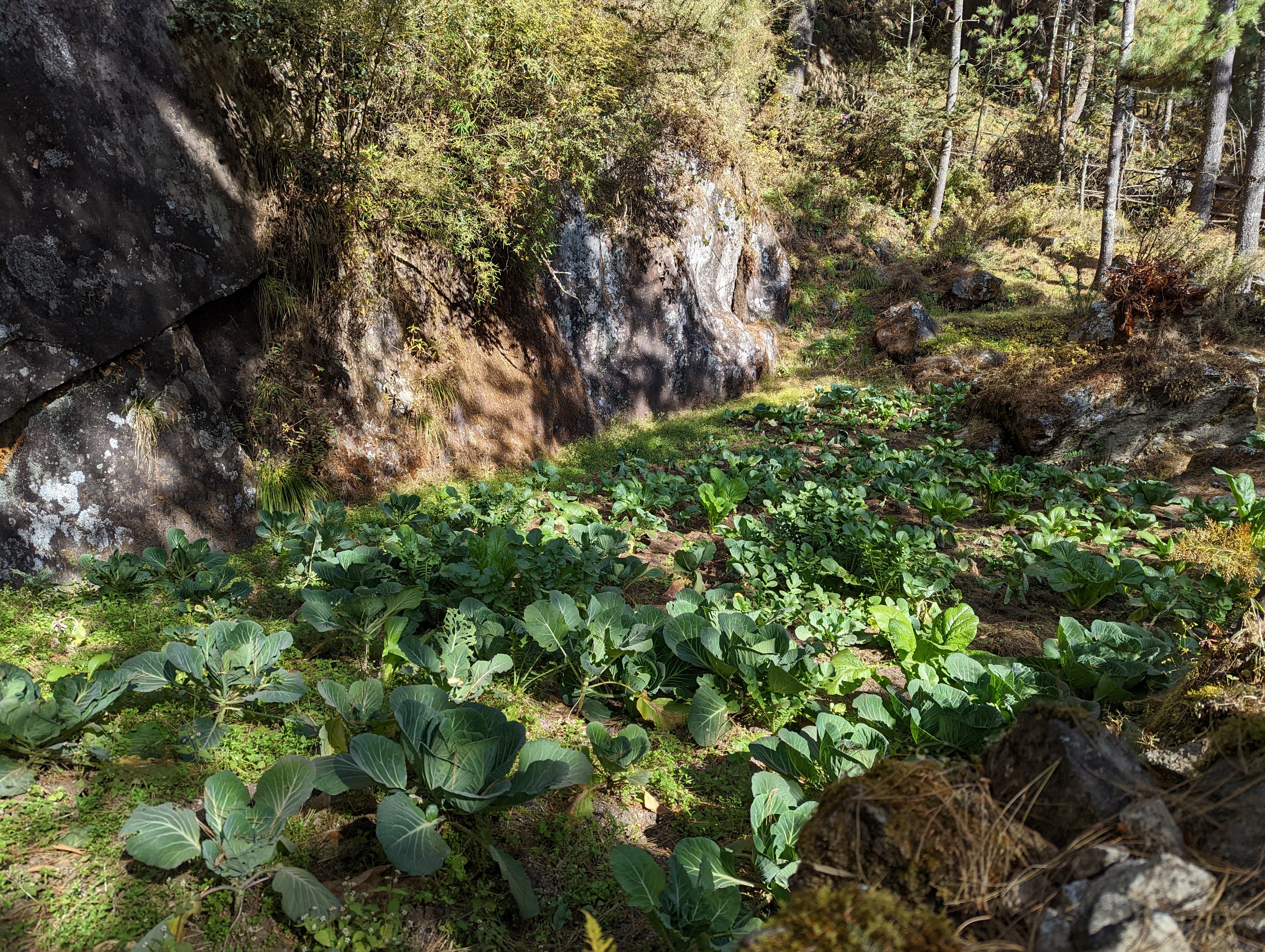 It’s an interesting thing to be hiking downhill. Without the focused exertion of going uphill, there’s more time to really take in the people and surroundings. It’s not that I didn’t notice anything or hiked in a bubble before, but I really have time to closely observe as I pause and give way. It’s just incredible to watch people of all ages hauling heavy supplies step by step up the valley. I’m particularly impressed by the elderly men and women who carry beer, plywood and other supplies that look as if they should be beyond their strength capabilities. It’s a good reminder not to judge people by their appearance. Many carry a short staff which has a slightly curved handle on top. It functions almost like a cane which can stabilize them as they go up the rock steps but I’ve also seen it used as a seat. We cross all the same bridges from the first two days of our trek and it’s still amazing to see oxen working their way across too. Check out this bridge video from Susan! Despite covering trail we’ve already hiked, there’s still wondrous things to see like a little vegetable patch tucked in next to the trail.