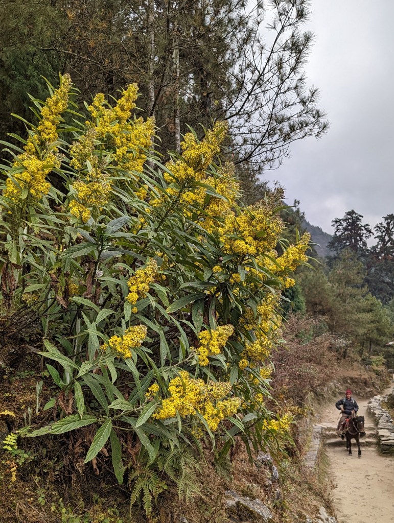 We make our way back to the Himalayan Sherpa Coffee shop because I want to buy some roasted coffee beans. There are only 1kg bags for sale so I buy just one. Silke and Caspar order coffee drinks and we get a coke for Tiger. It’s luxurious to sip chocolately, steaming coffee with such a grand view. We reluctantly push on but enjoy the views of the valley. Dahlia imperialis is a flowering dahlia tree with spectacular light purple bell-like drooping blooms. Terraces are in progress and are being prepared for planting and homes.