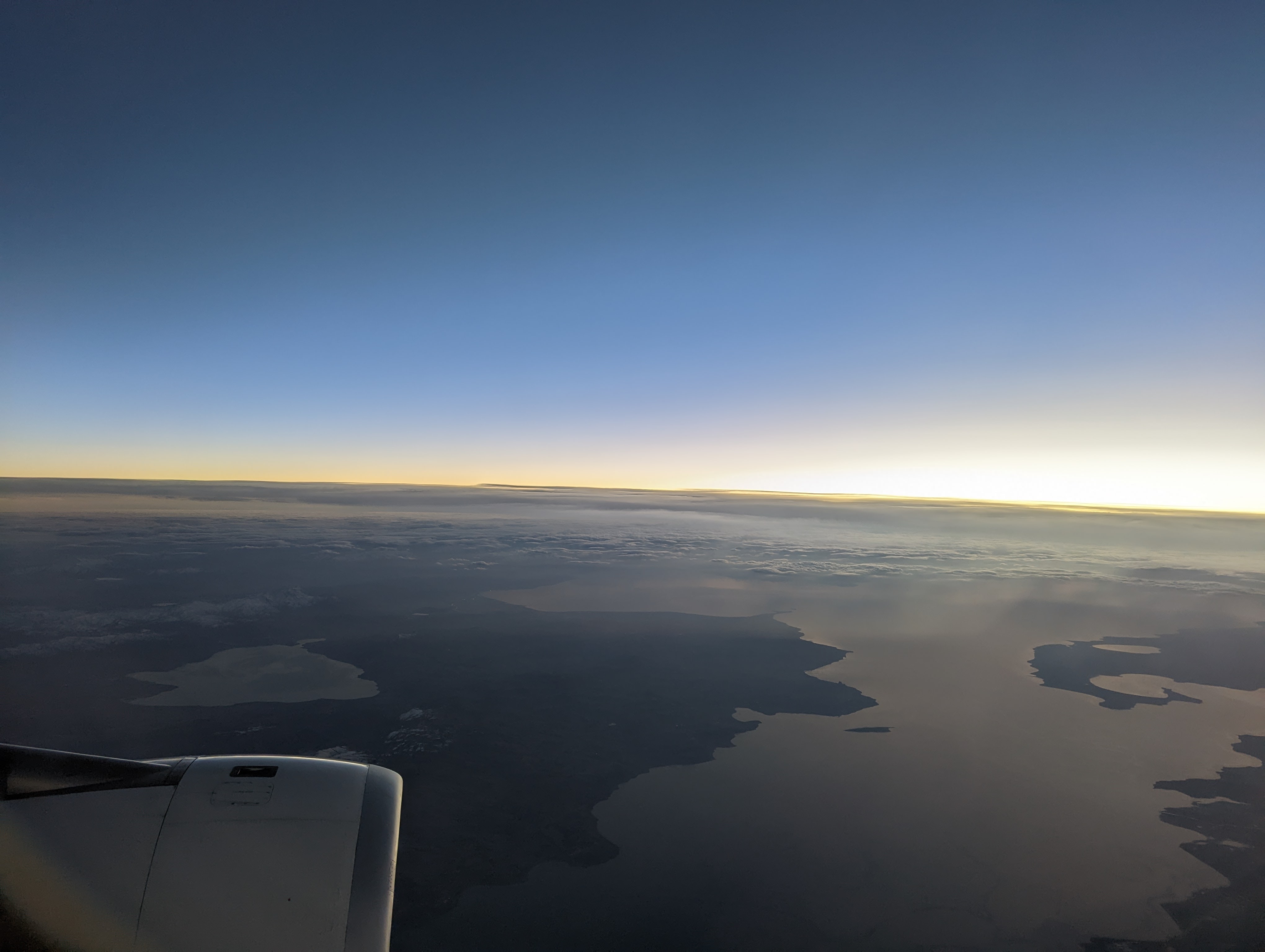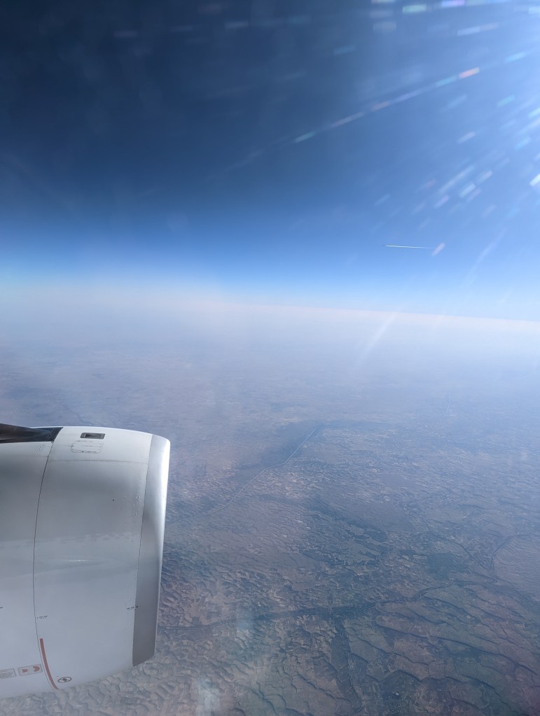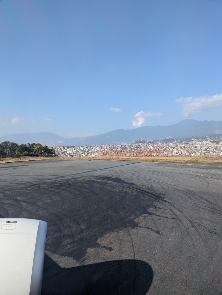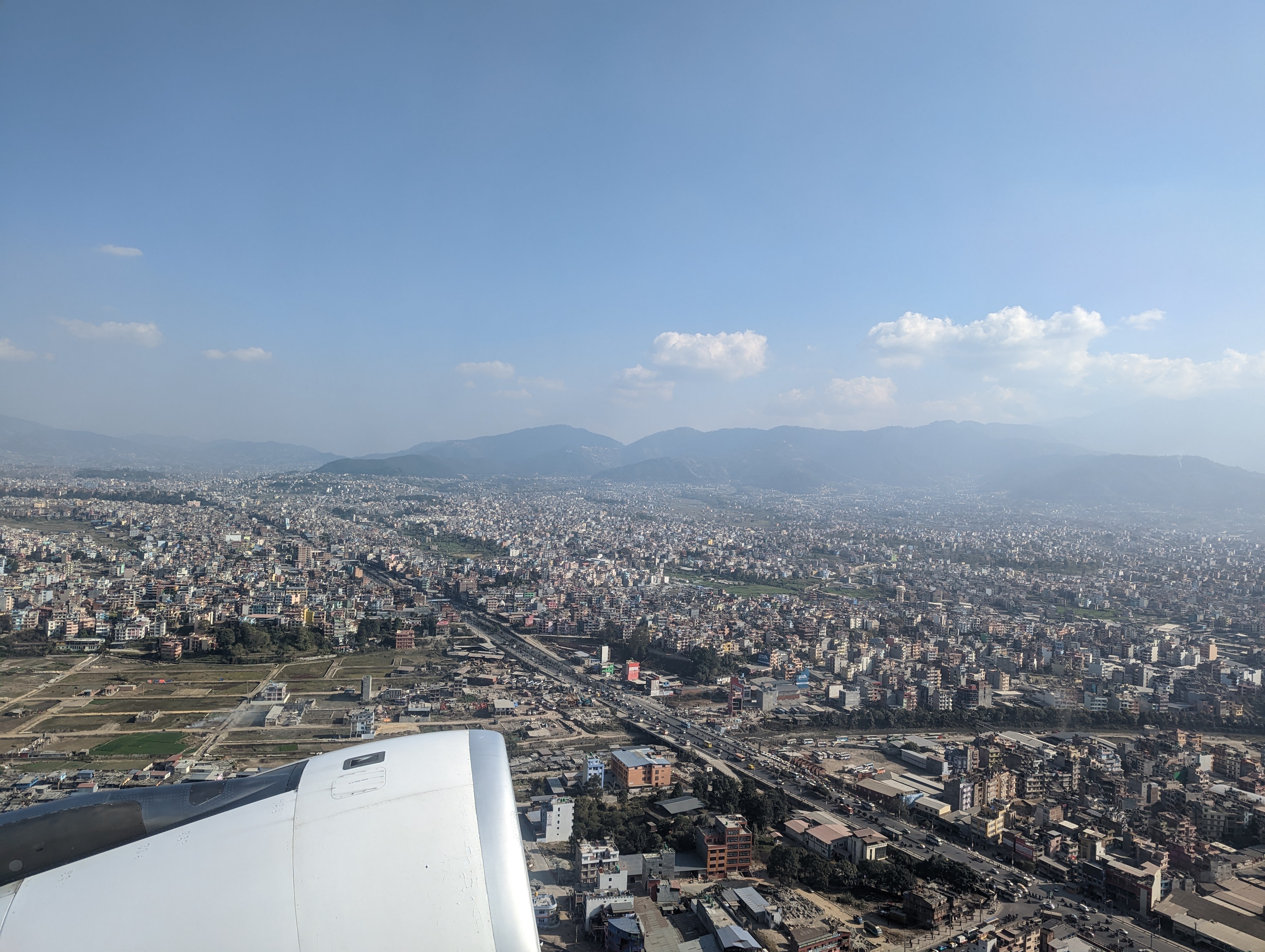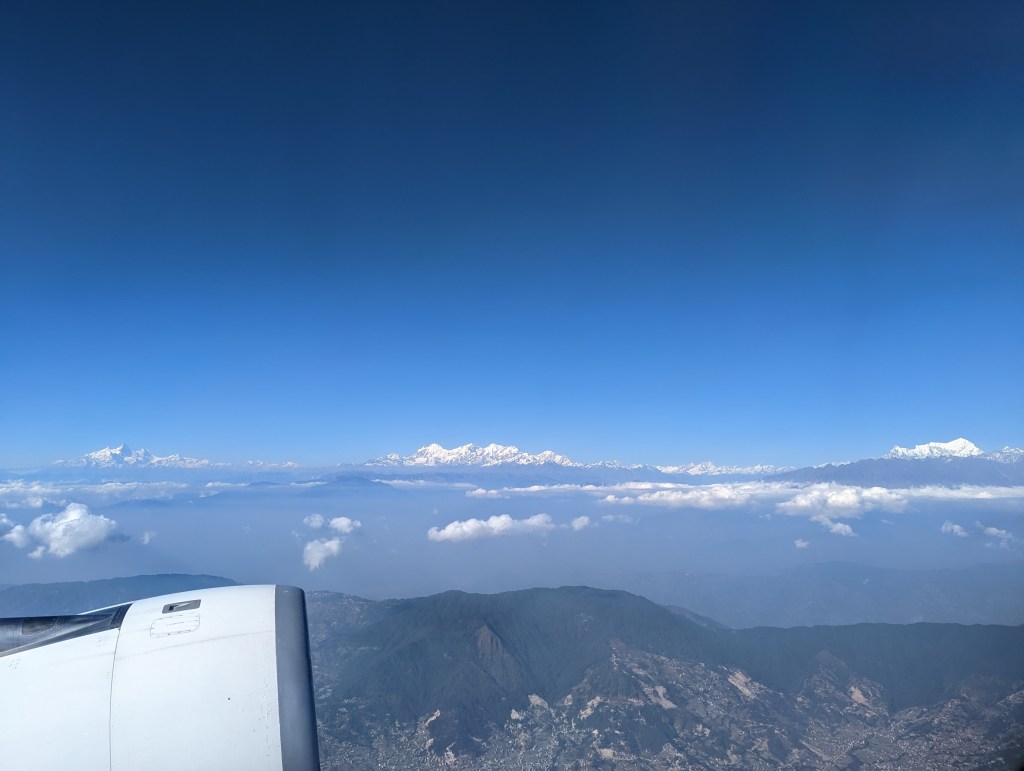 Luggage check, passport control and security all go fairly smoothly. No issues about my small carry-on backpack this time. It’s a small enough airport that there’s only one large area where international travelers wait for their flights. I’m amused by the small birds that fly around the waiting area finding scraps of food. Eventually my flight boards and I take my seat at the window. We proceed to sit on the tarmac for an hour with no explanation and no offering of water. Eventually, we start to taxi and I can see the top of the Boudhanath Stupa poking up above the Kathmandu skyline. As we climb into the sky, the buildings shrink in size as the Himalaya Range takes center stage one last time.